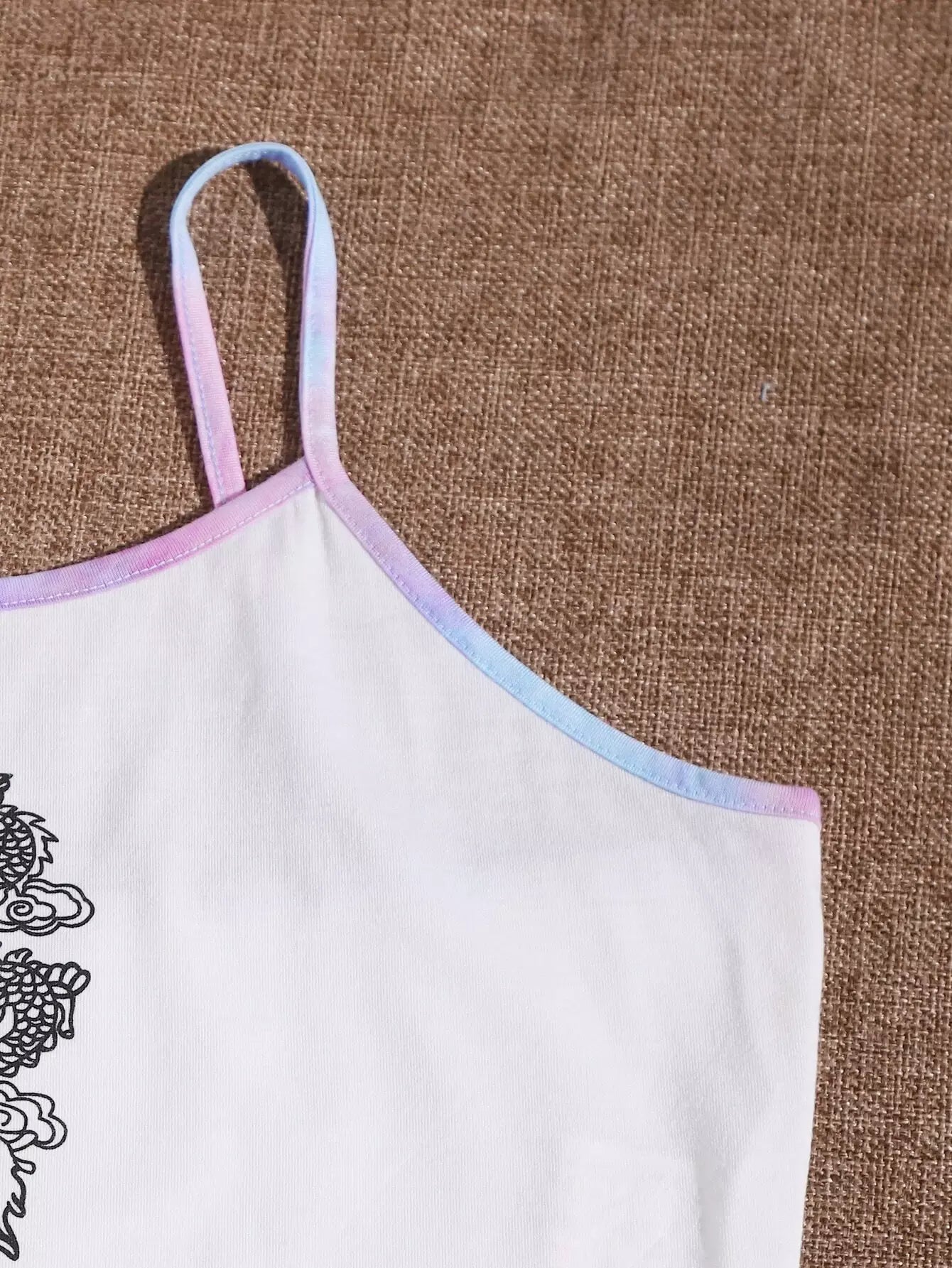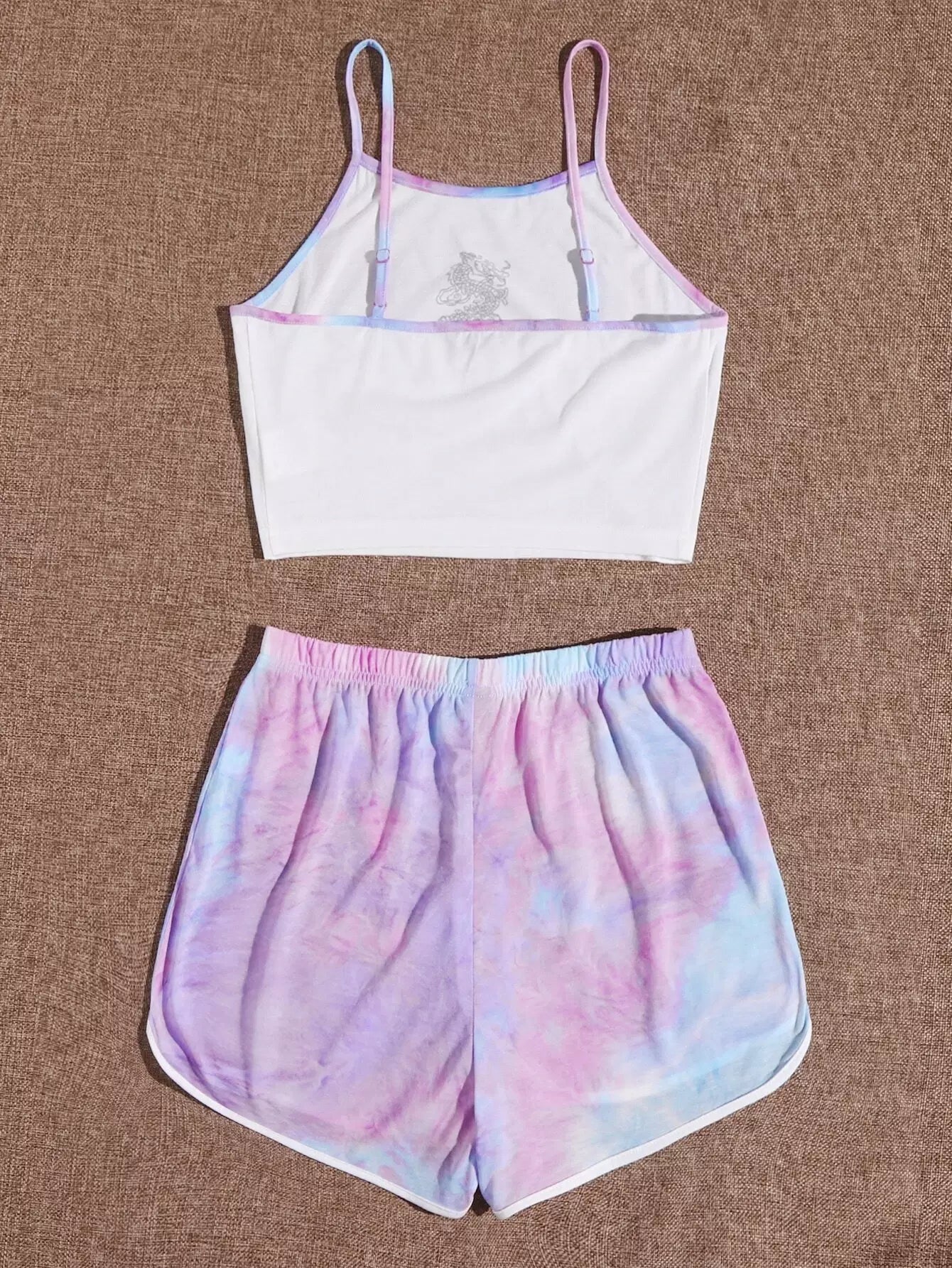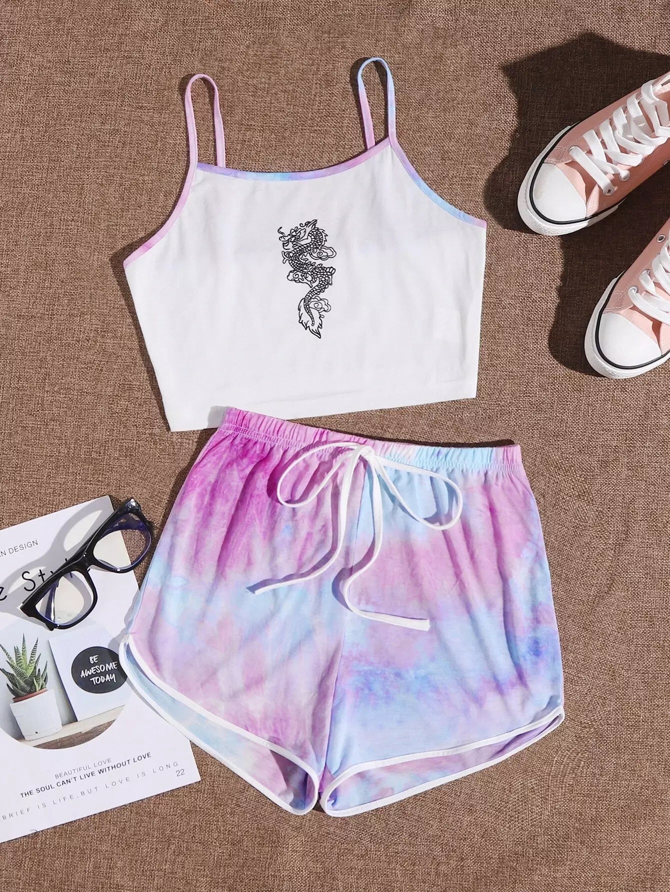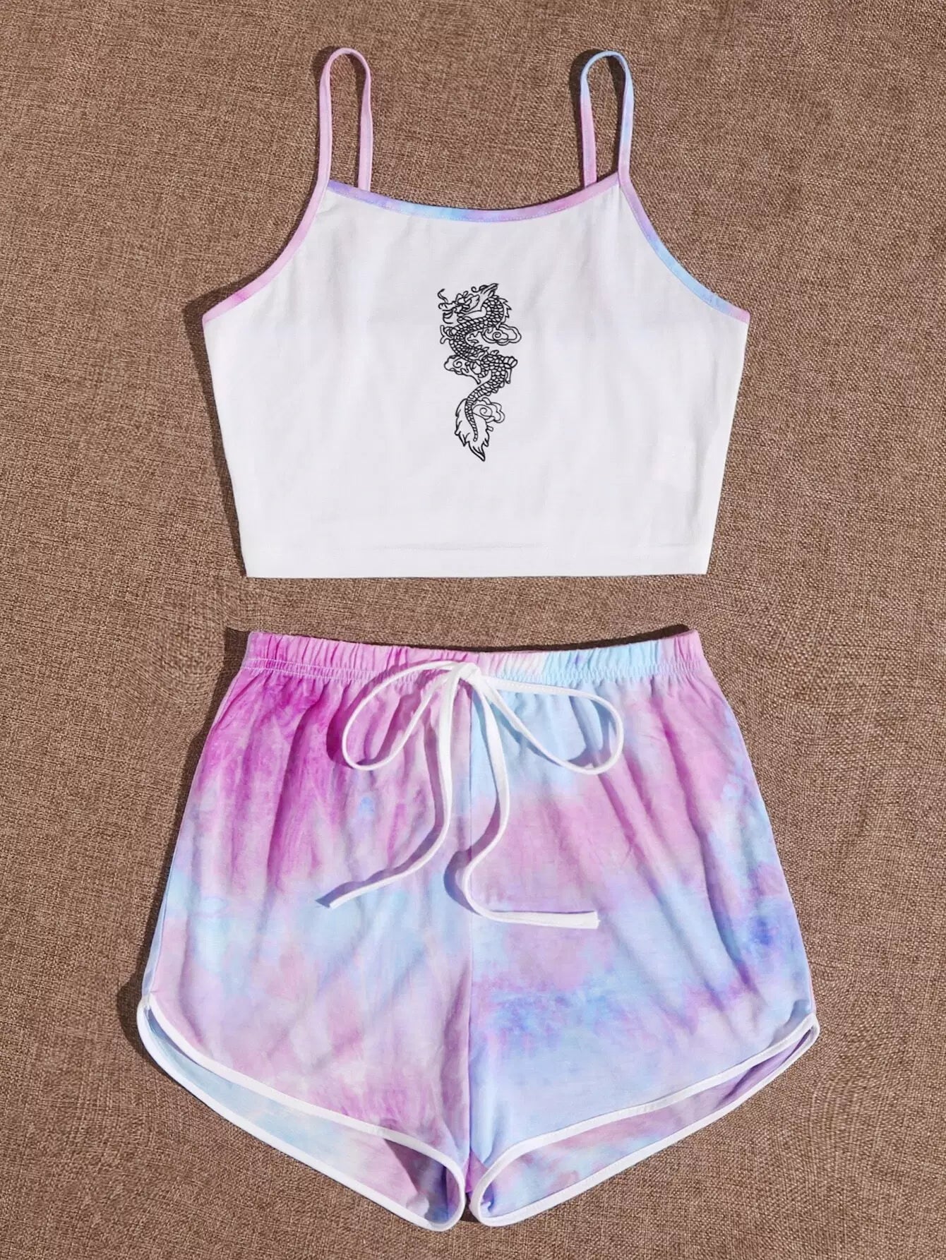 طقم قميص كامي مزين برسومات التنين الصيني بلون مغاير وشورت رياضي مصبوغ بربطة عنق