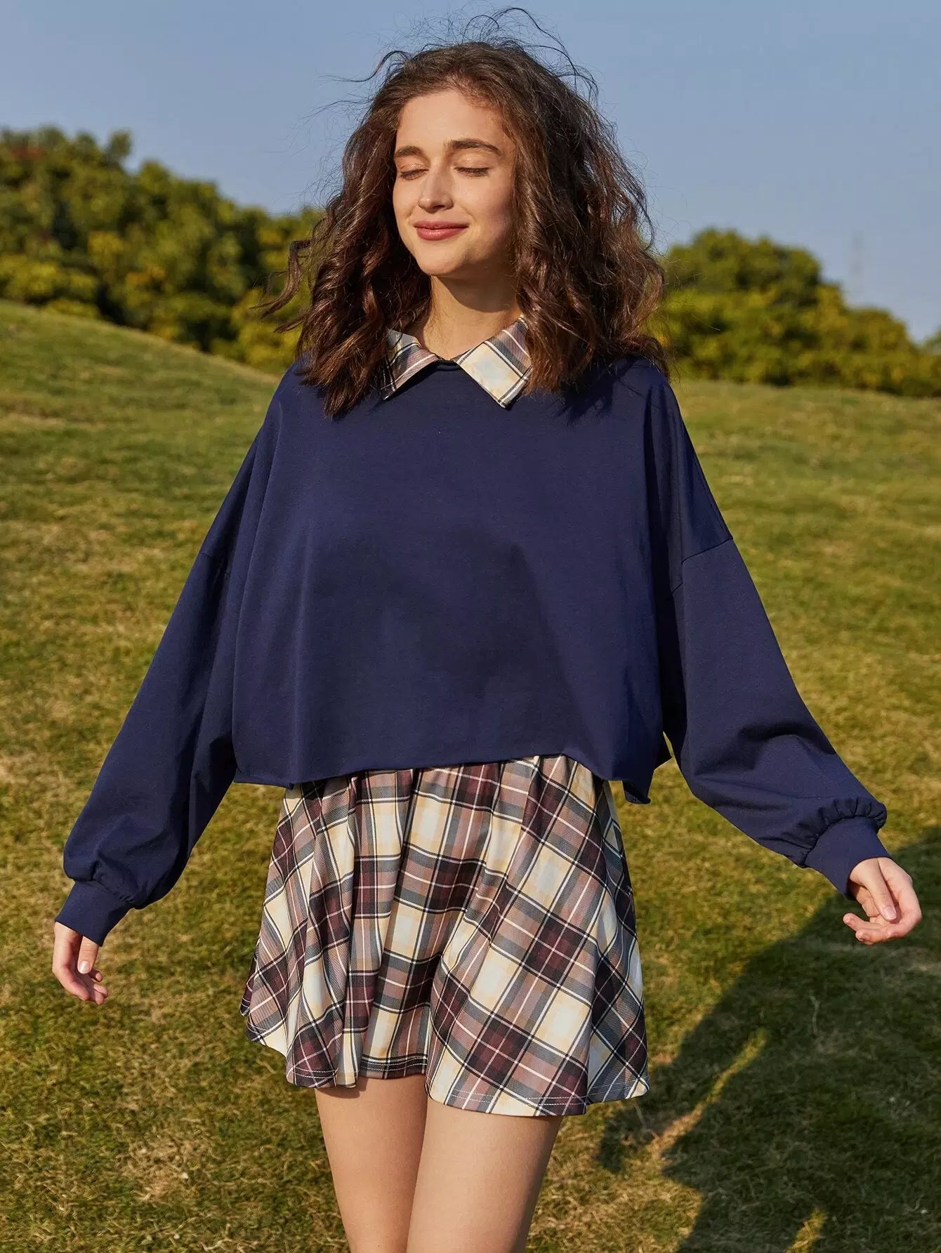 سويت شيرت بياقة متباينة وتنورة منقوشة