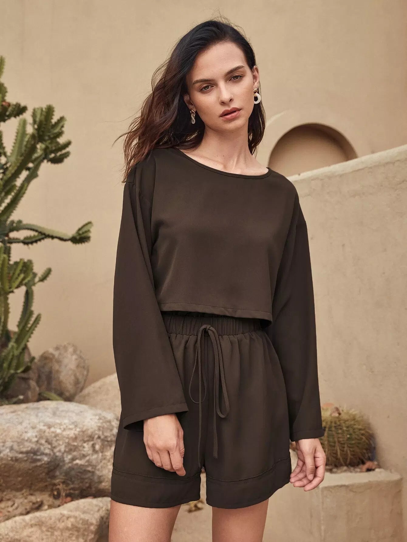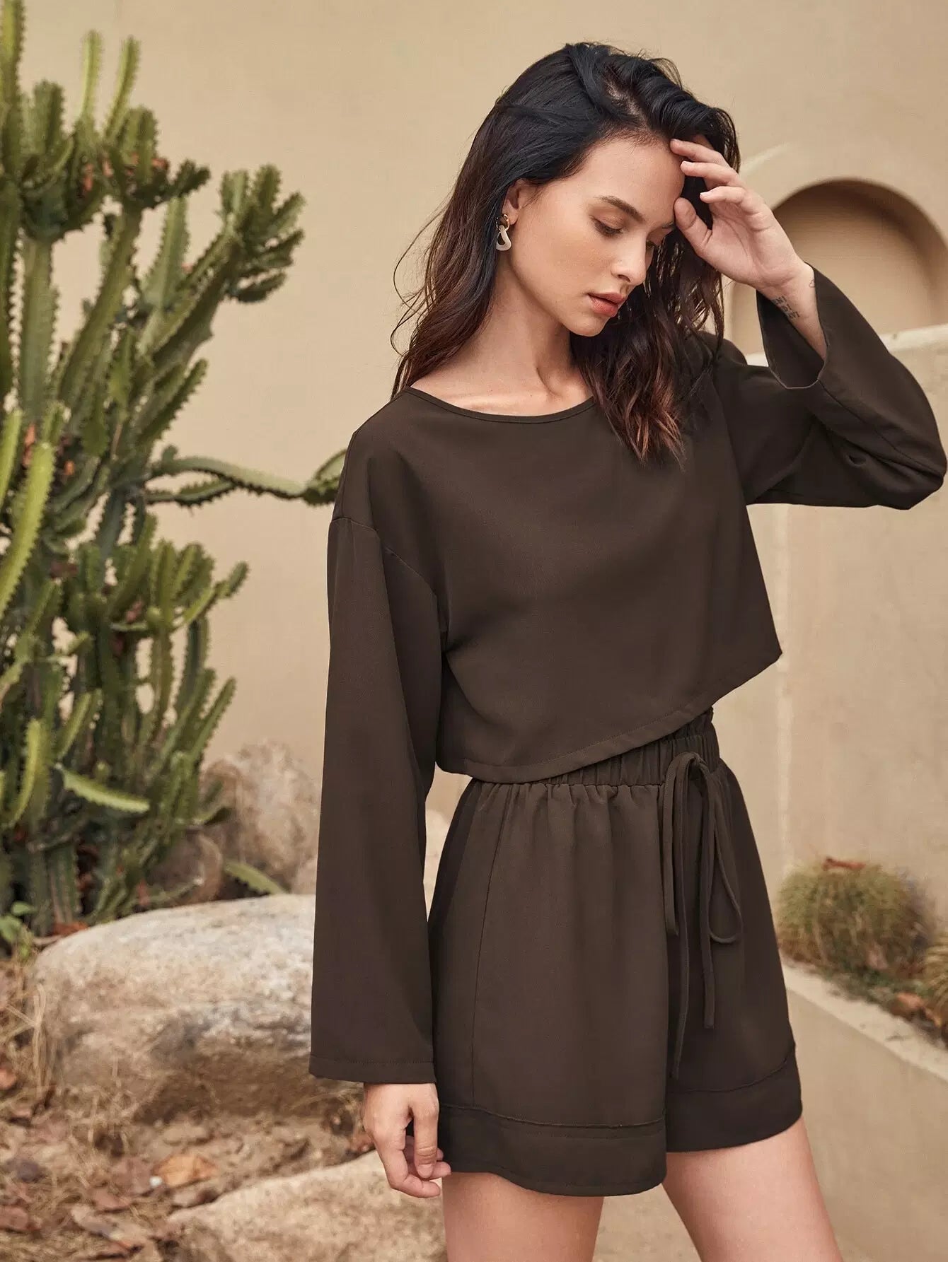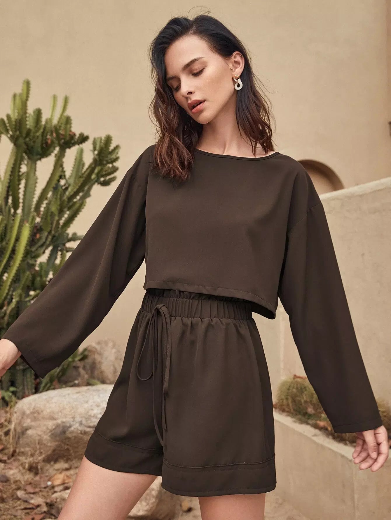 طقم بلوزة قصيرة وشورت بخصر مربوط