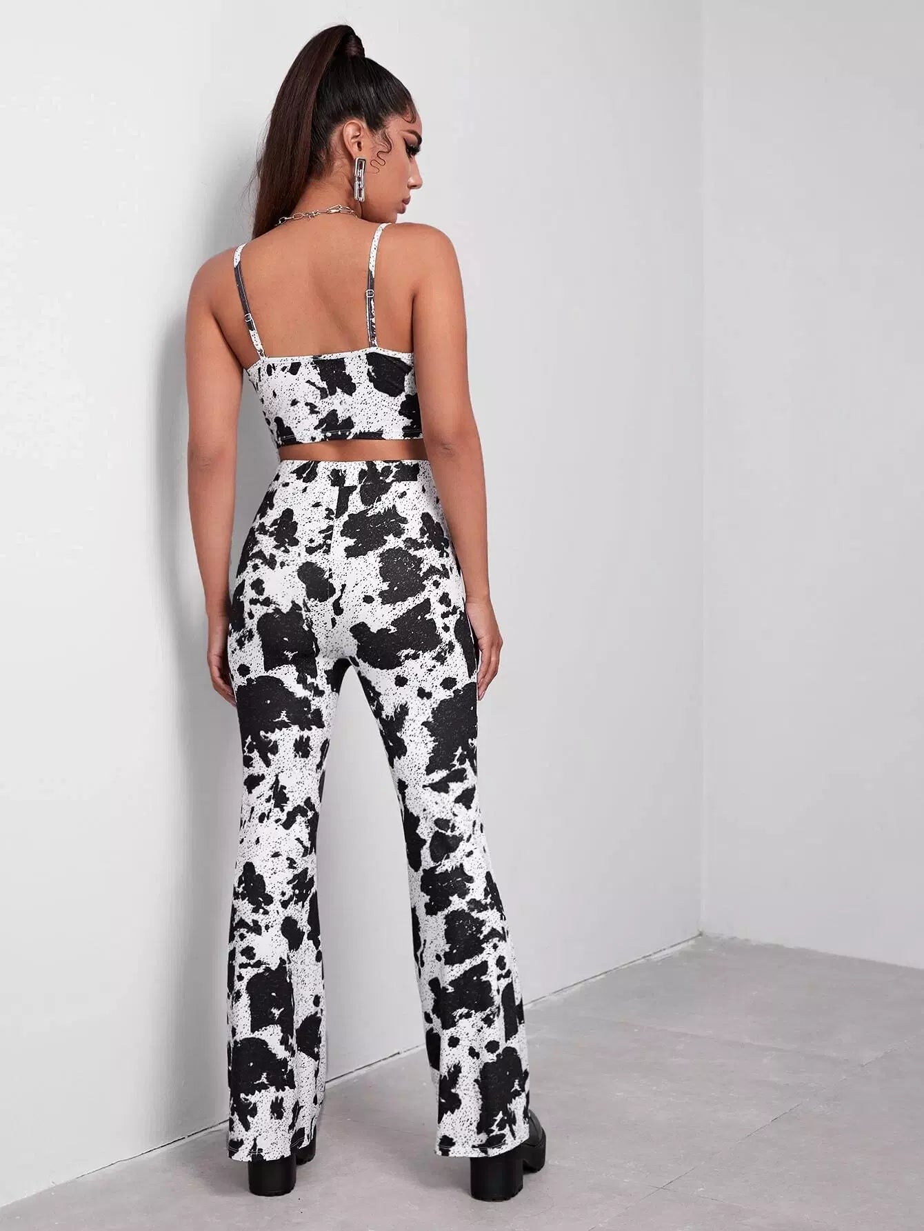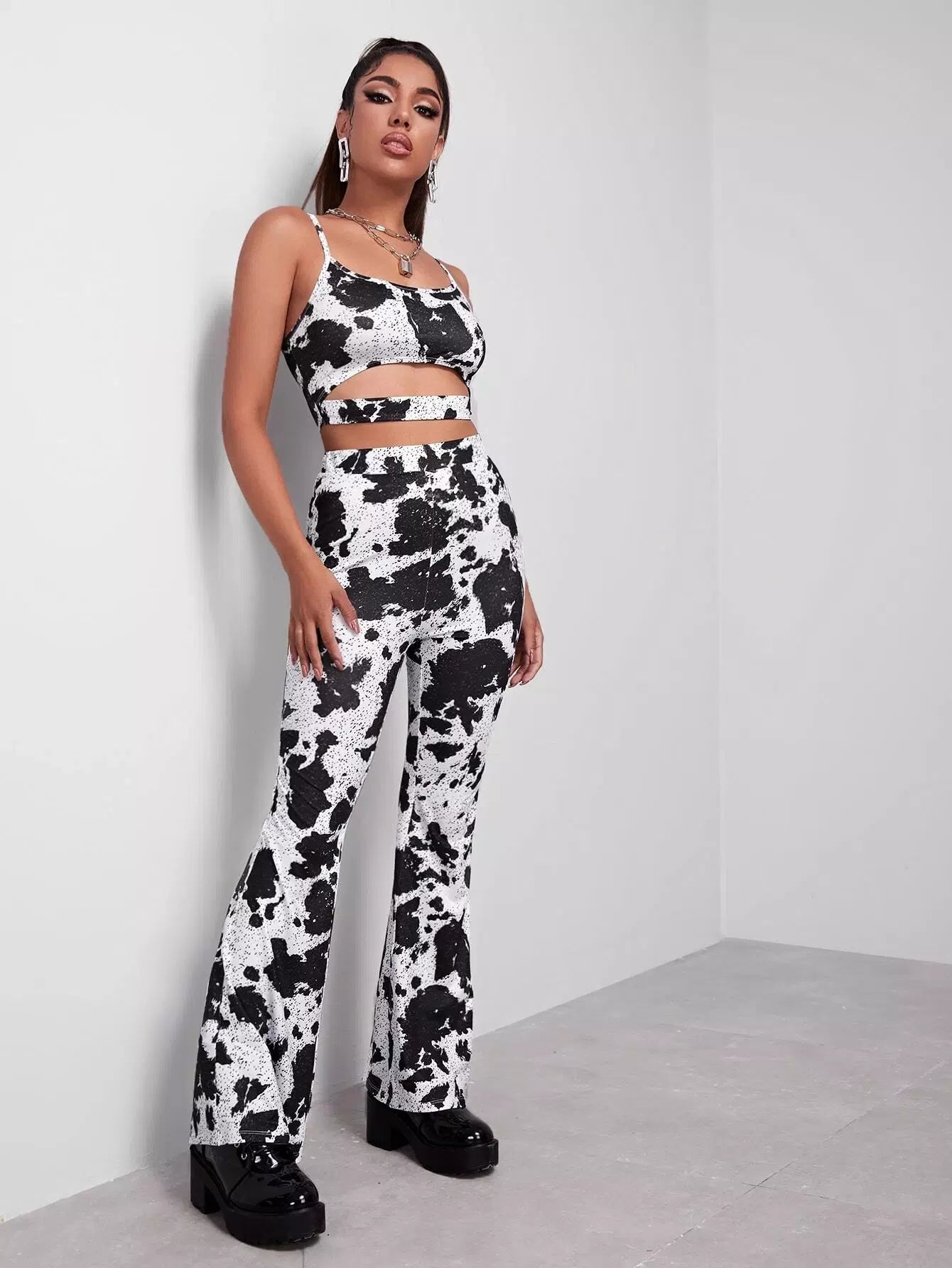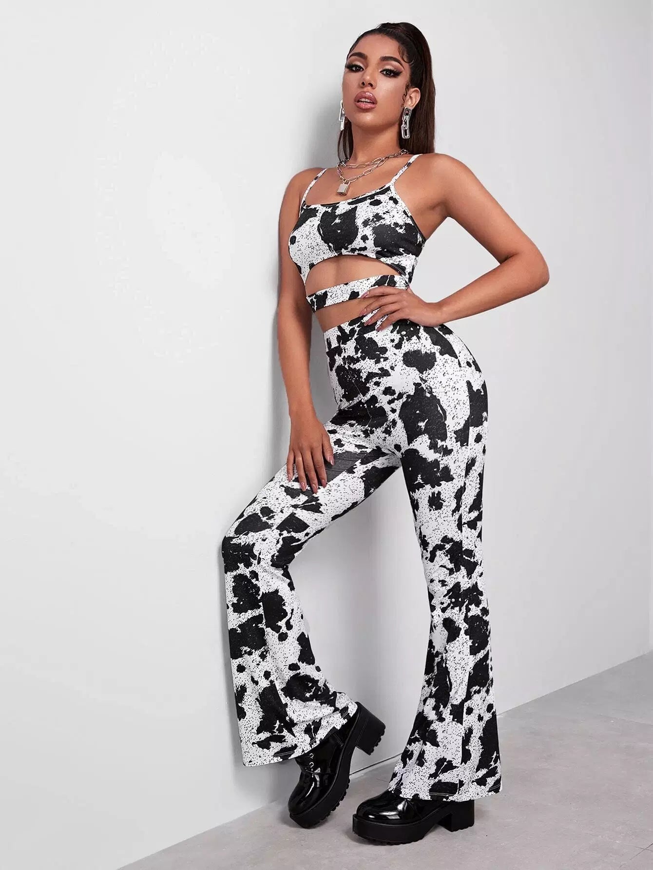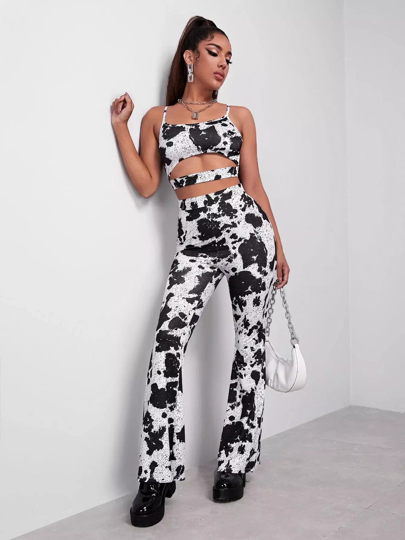 طقم بلوزة كامي بطبعة بقرة مقطوعة وبنطال بساق واسعة