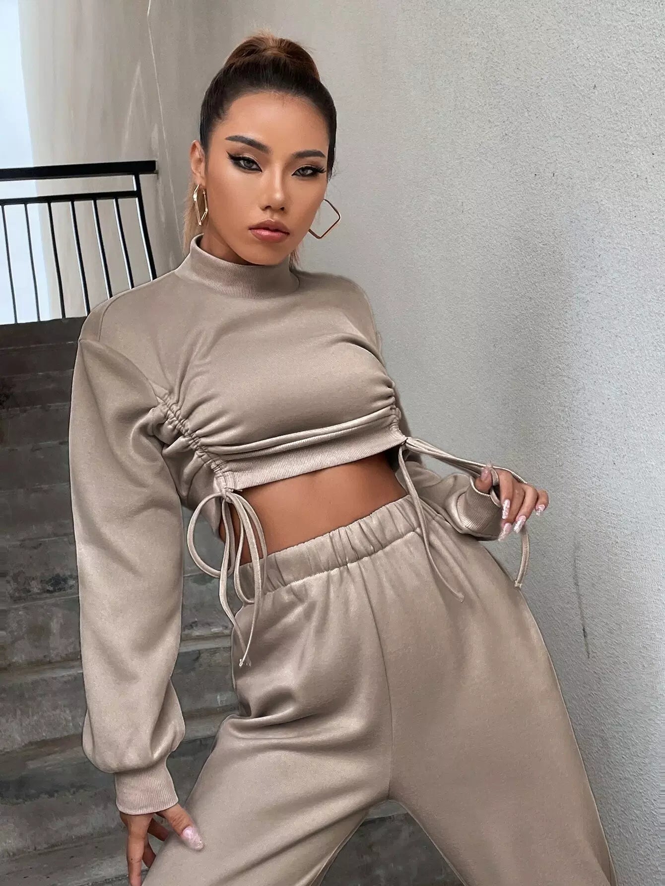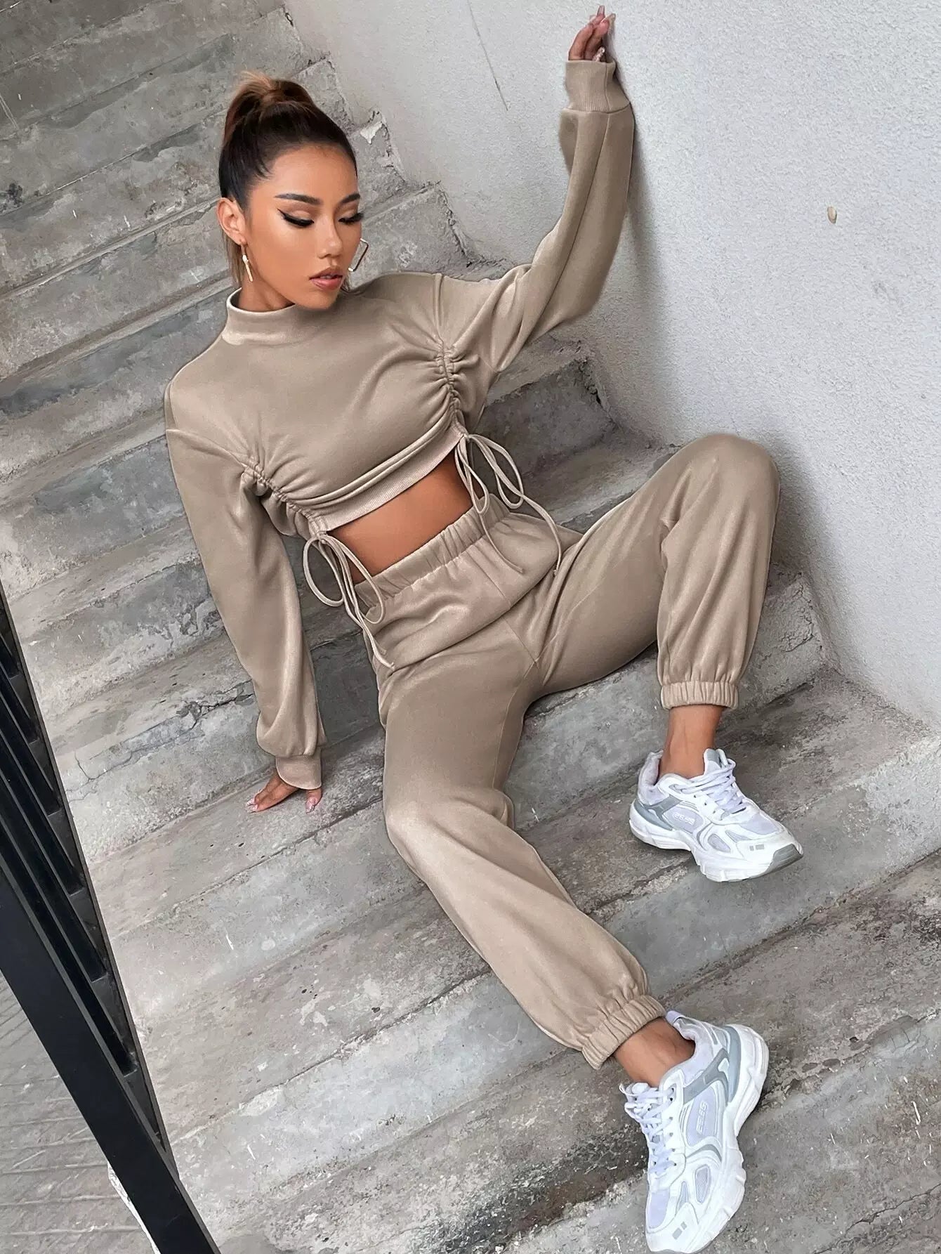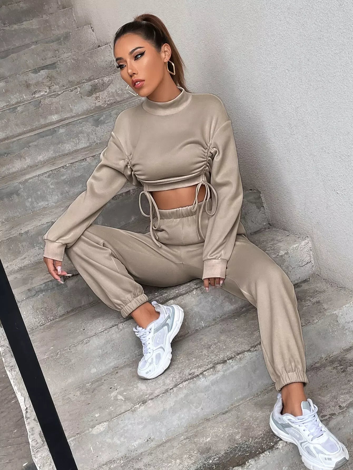 كنزة صوفية برباط أمامي برقبة ضيقة من الأمام وبنطال رياضي قصير