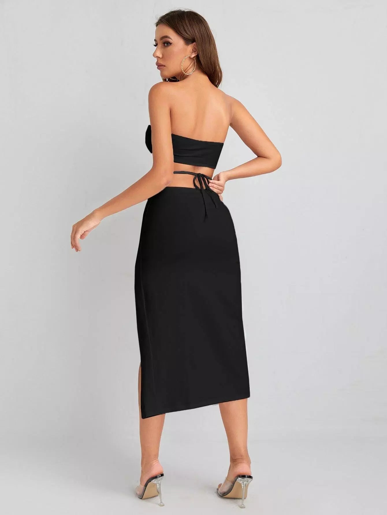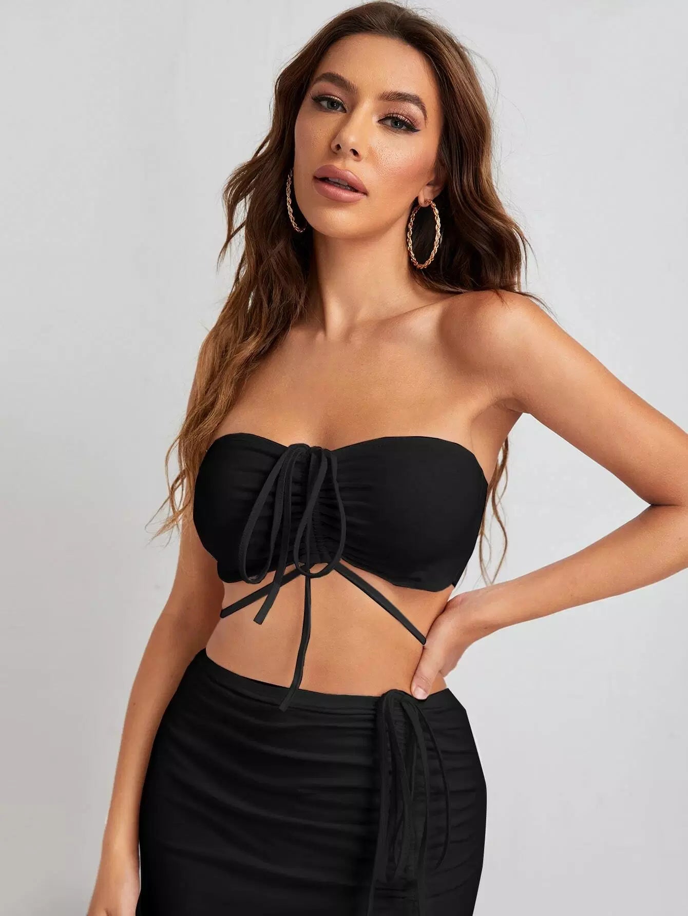 طقم بلوزة أنبوبي برباط مكشكش برباط رباط مع تنورة