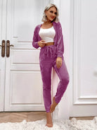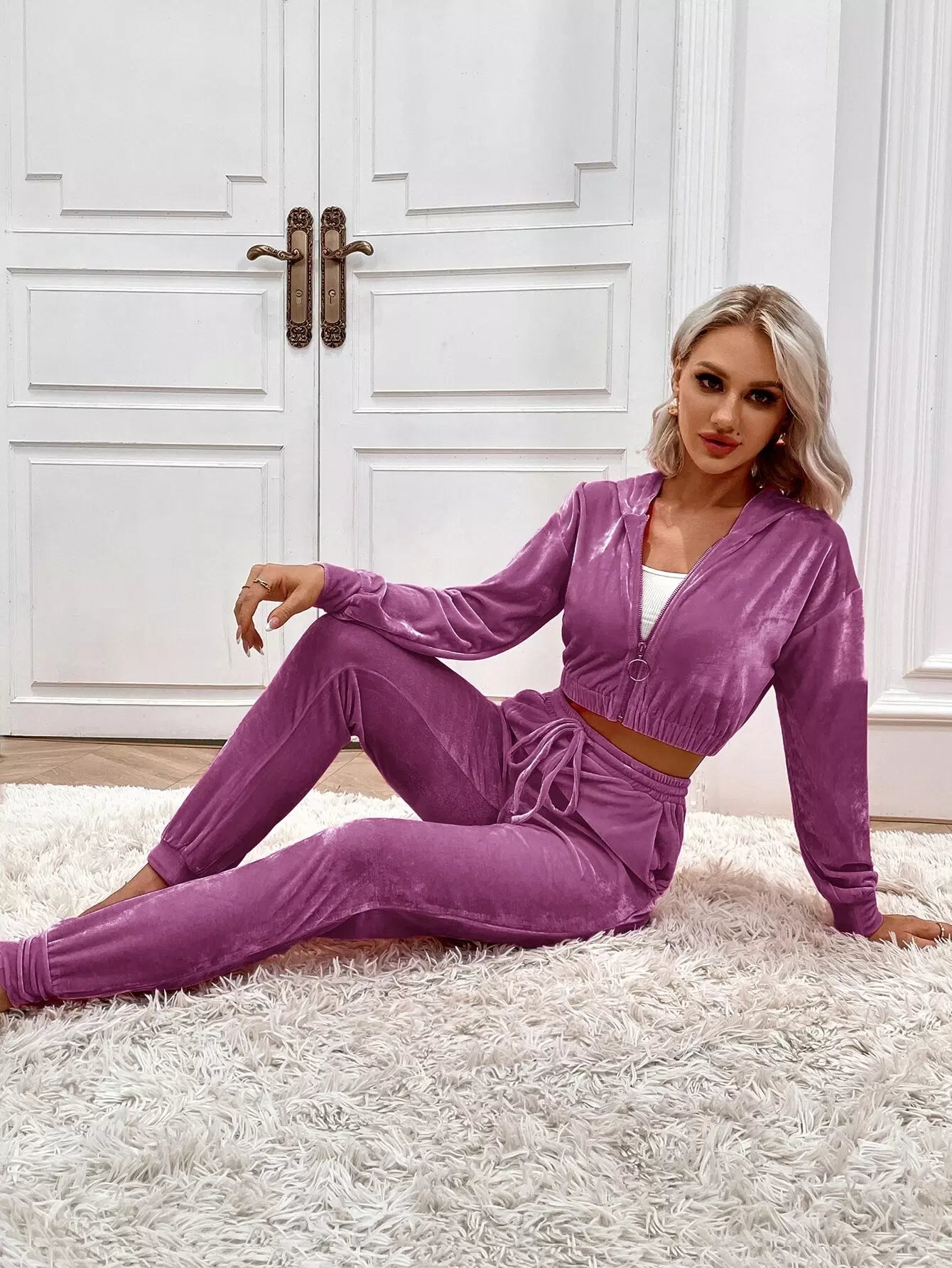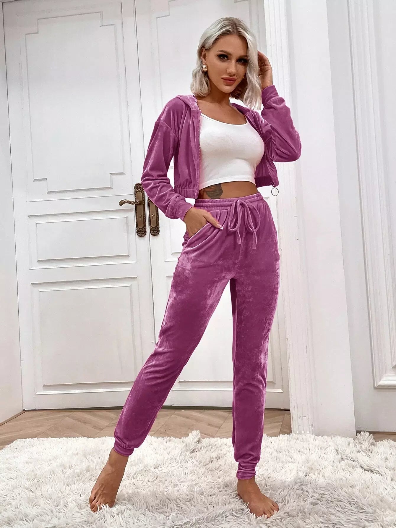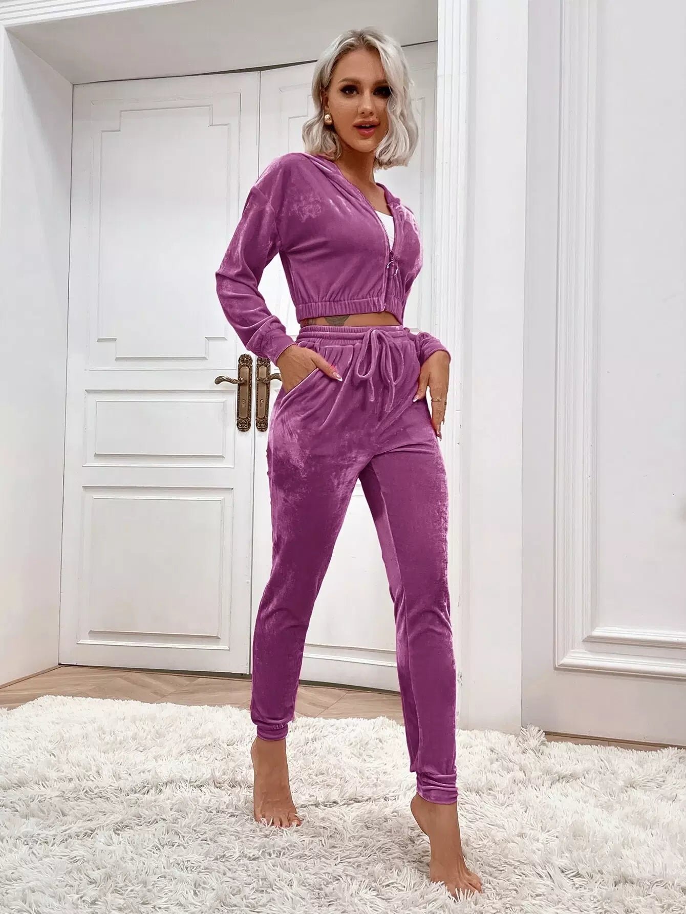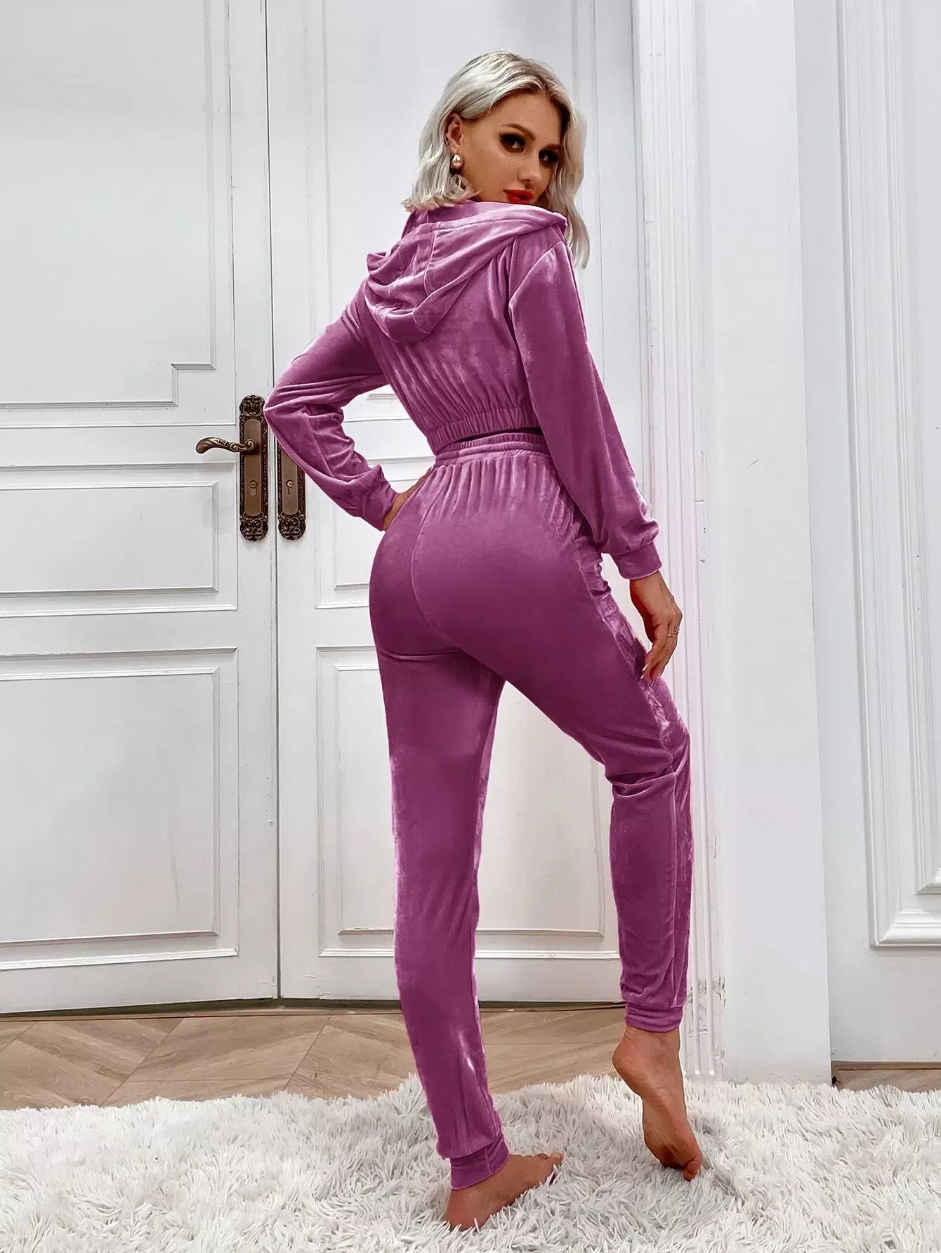 بلوزة مخملية بغطاء رأس وسحّاب على شكل حلقة دائرية وبنطلون رياضي برباط على الخصر