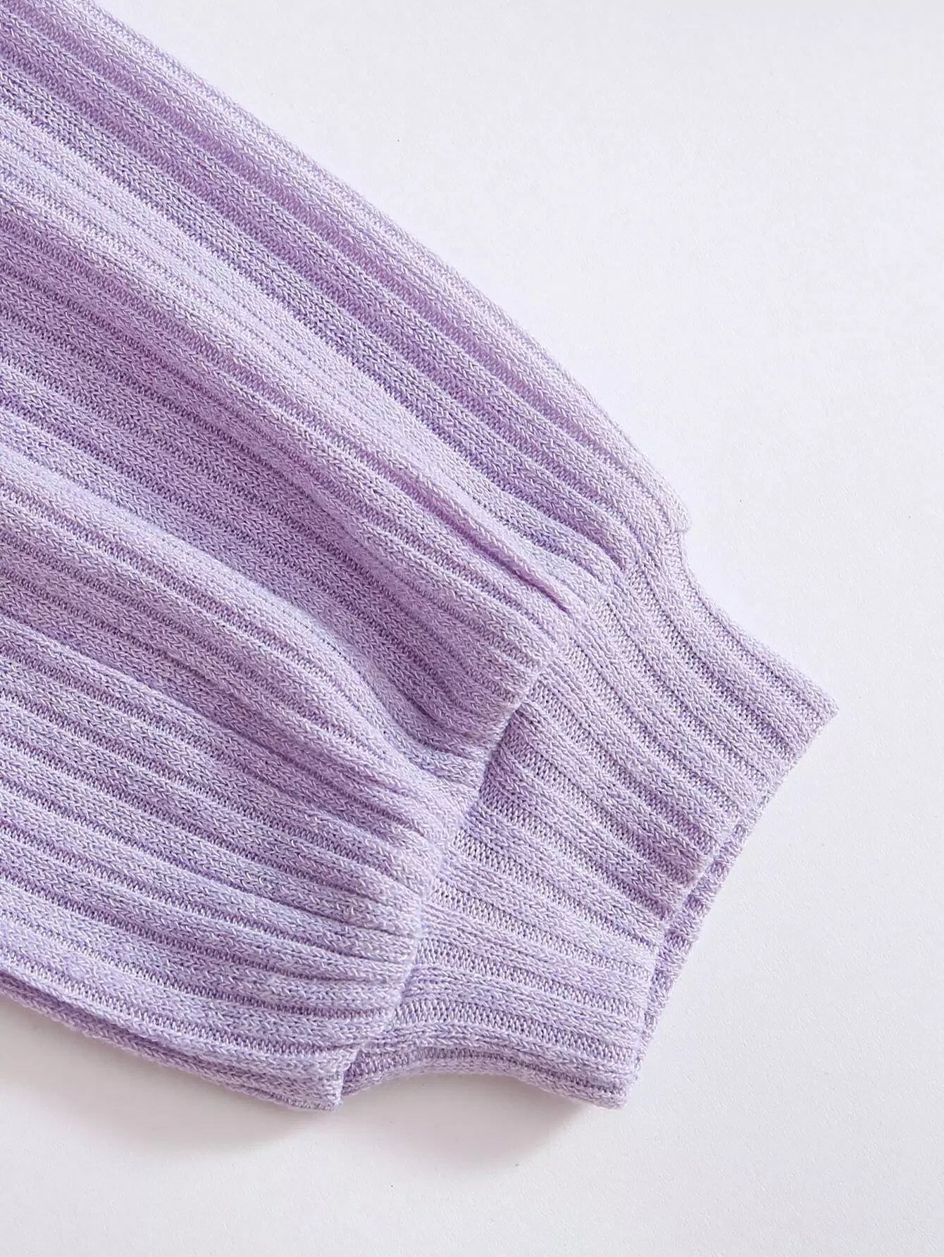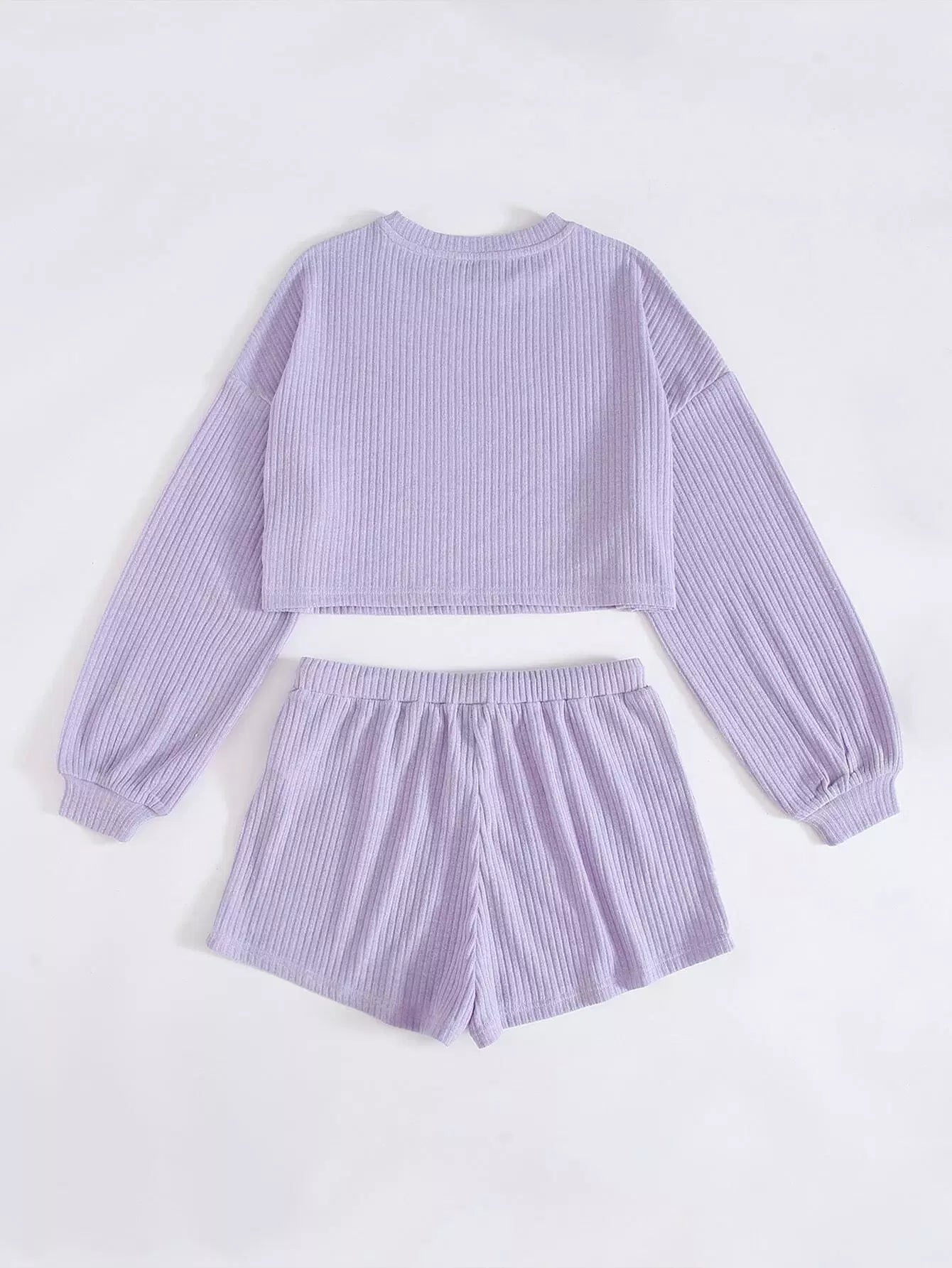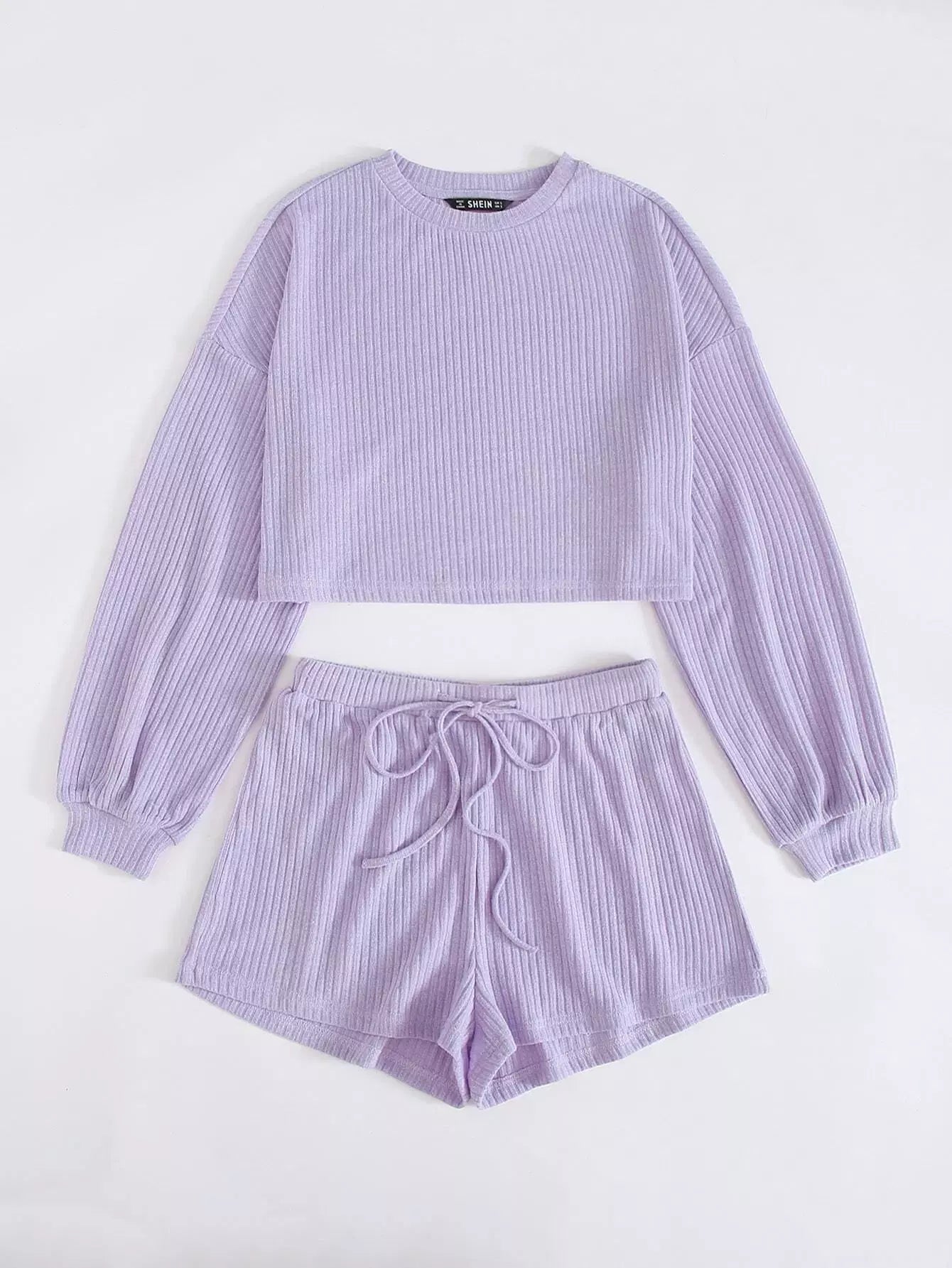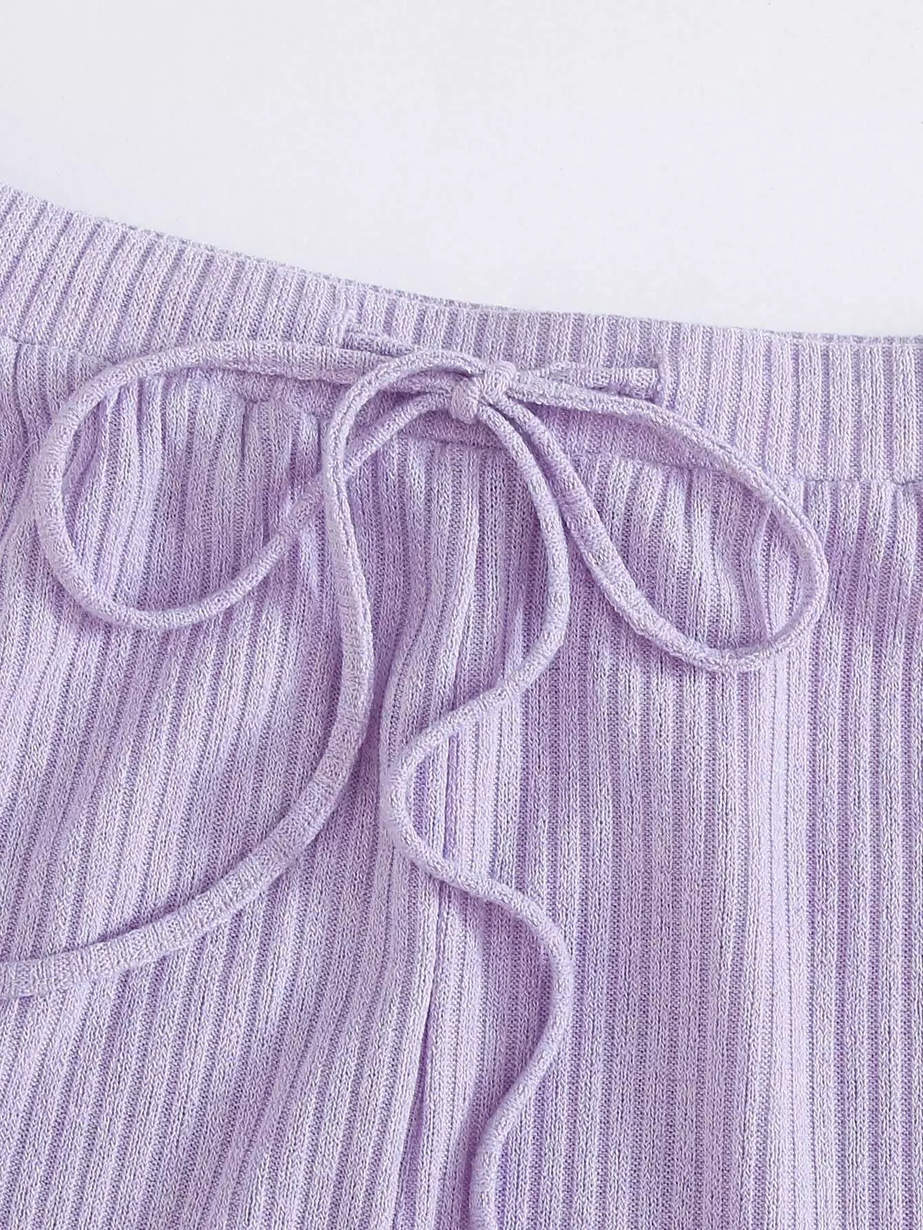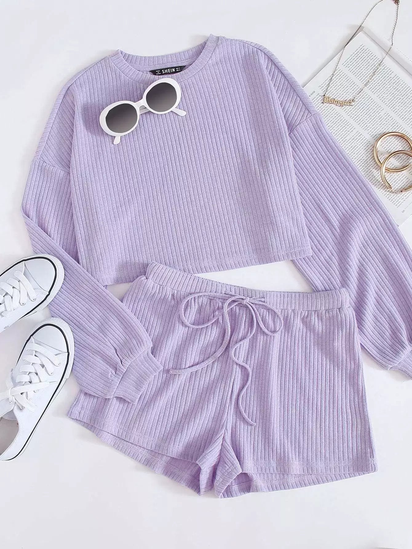 طقم بلوزة محبوكة بكتف منسدل وشورت بعقدة عند الخصر