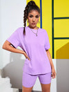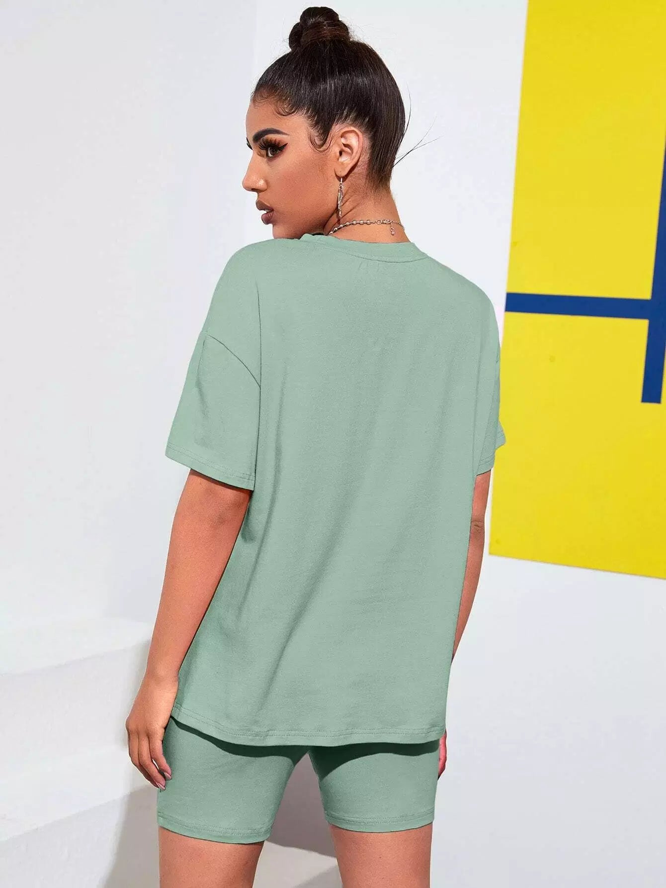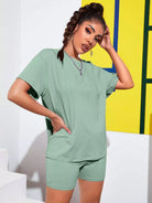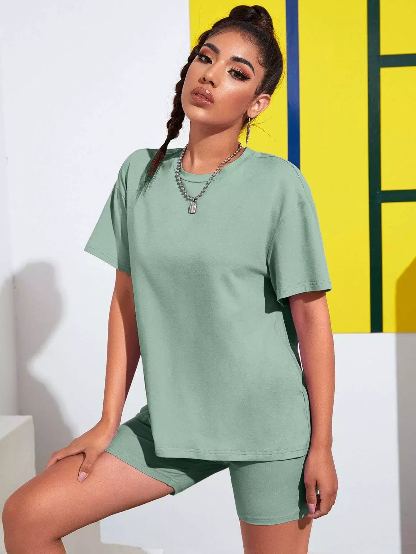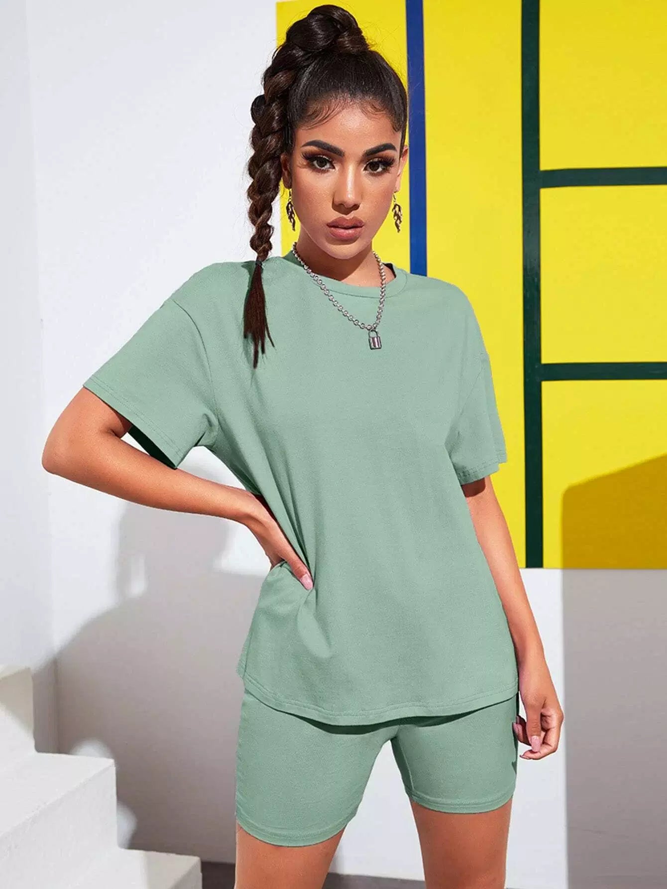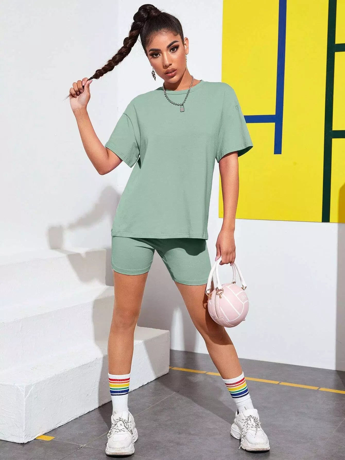 طقم بلوزة منسدلة الكتفين سادة منسدلة الكتفين وشورت راكب الدراجة النارية
