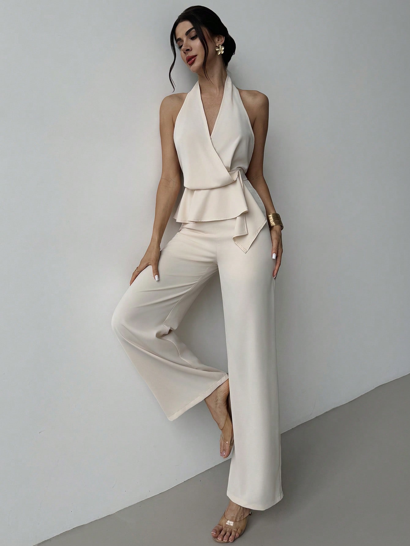 طقم صيفي أنيق ورومانسي من قطعتين من فيريري للنساء، يتضمن بلوزة فضفاضة بدون أكمام بياقة على شكل حرف V وقصة غير منتظمة.