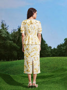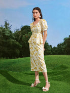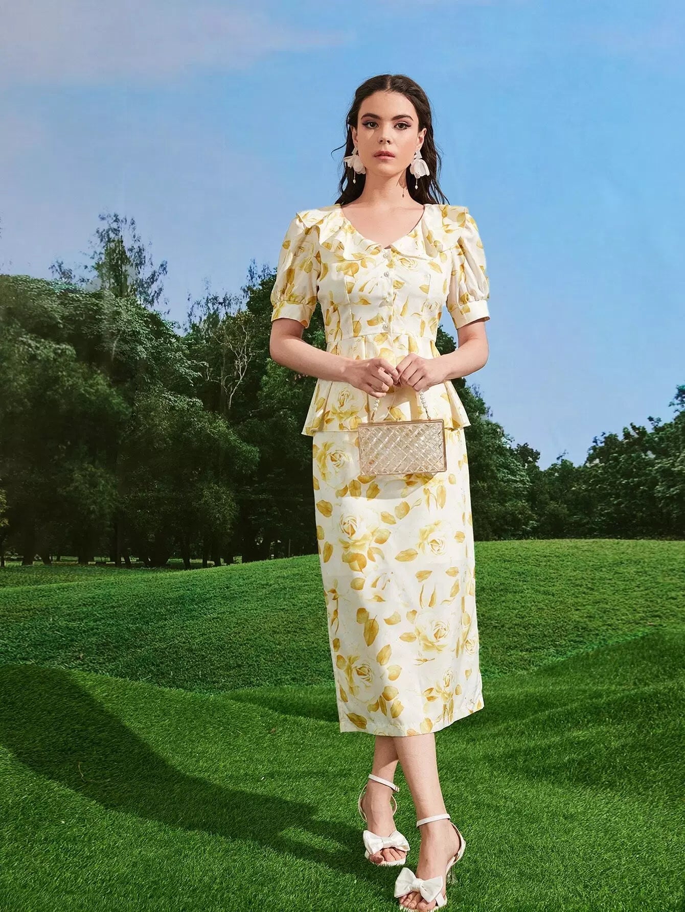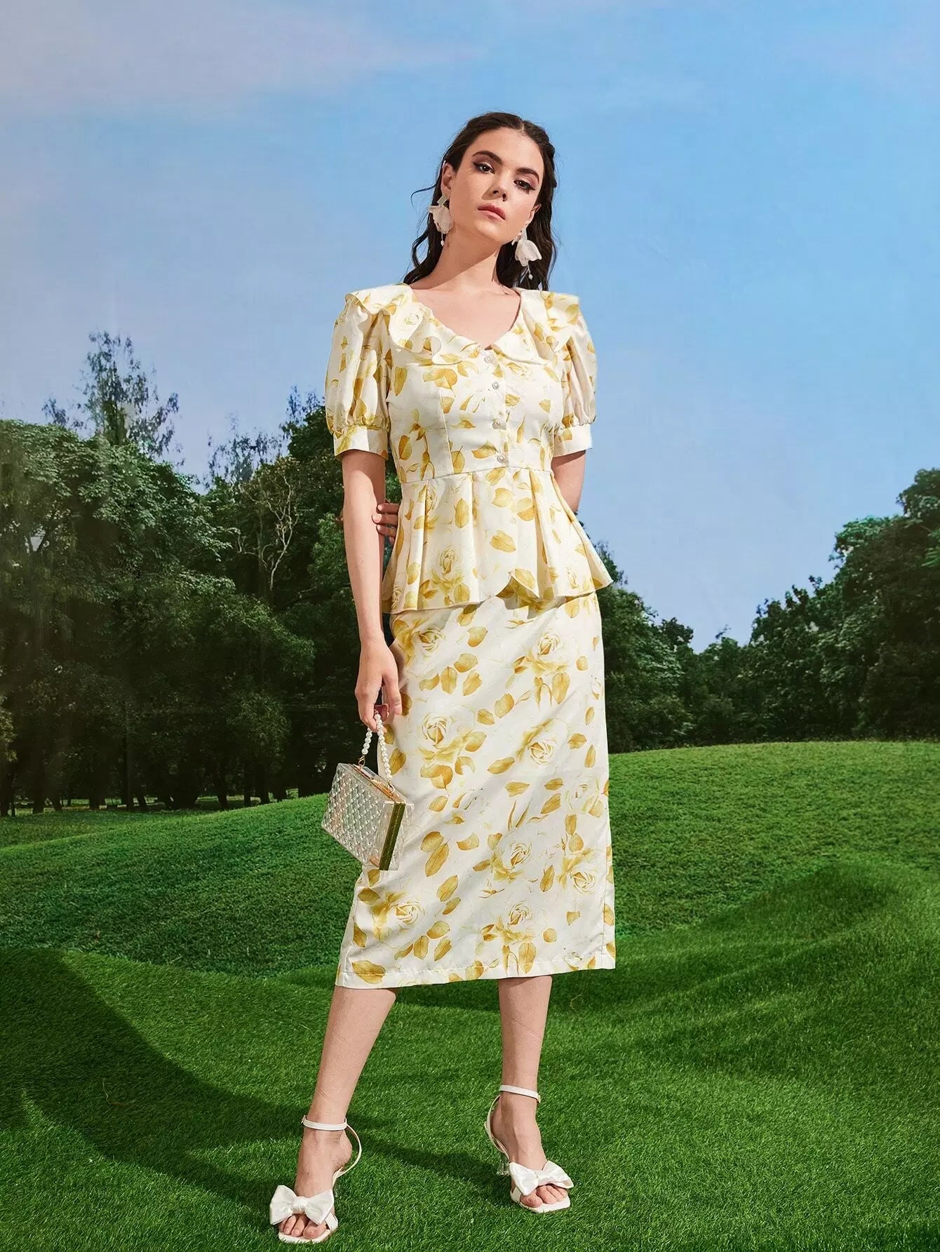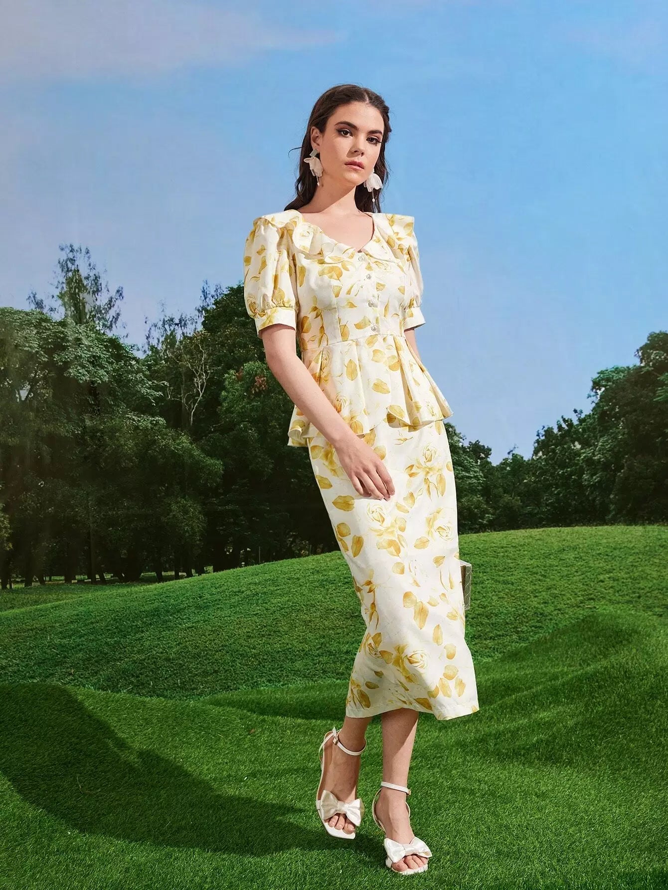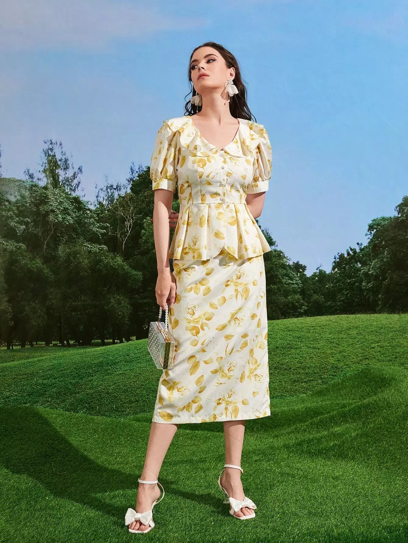 بلوزة مزينة بكشكش مطبوع عليها زهور وتنورة ذات حواف منقسمة