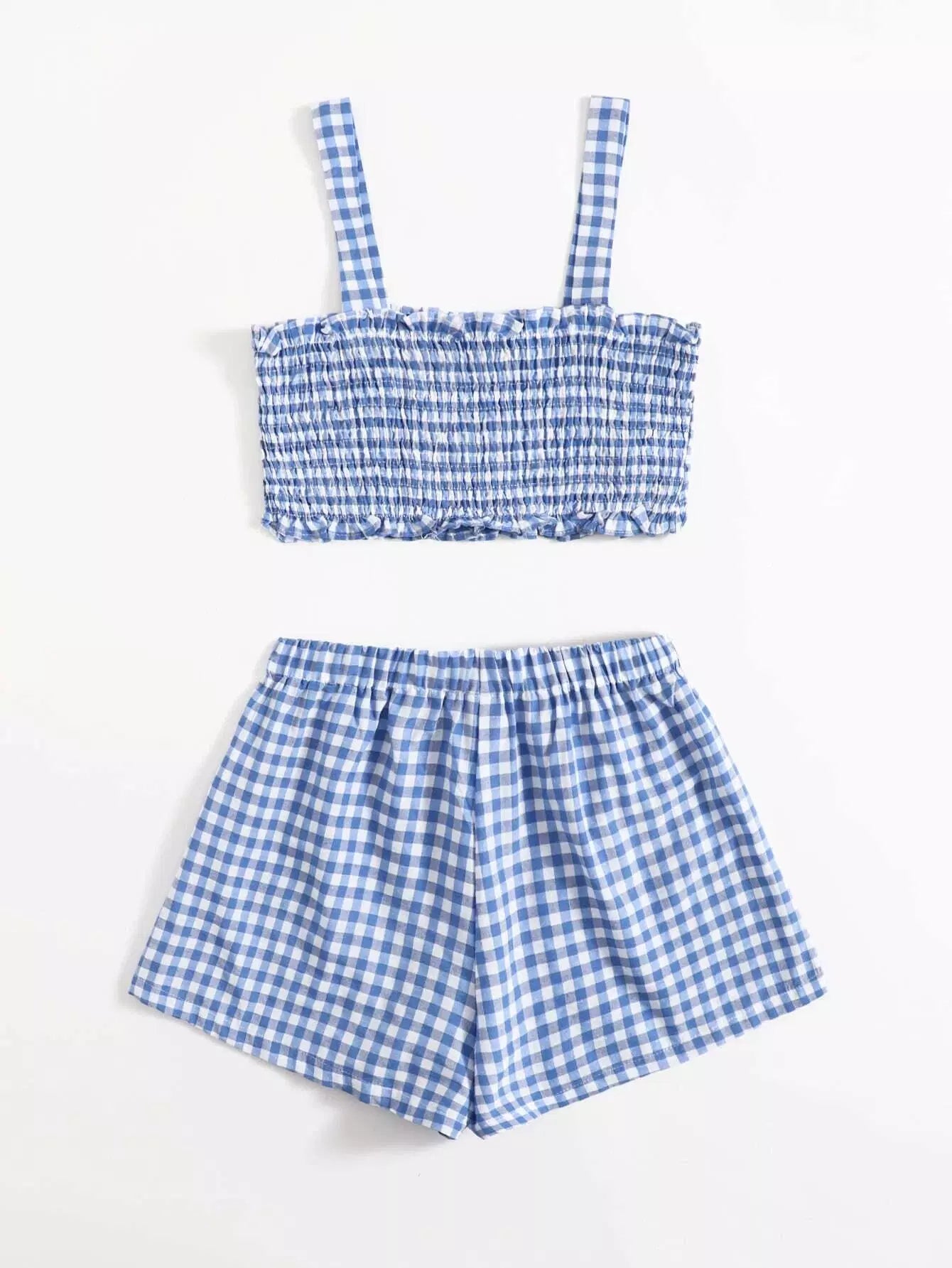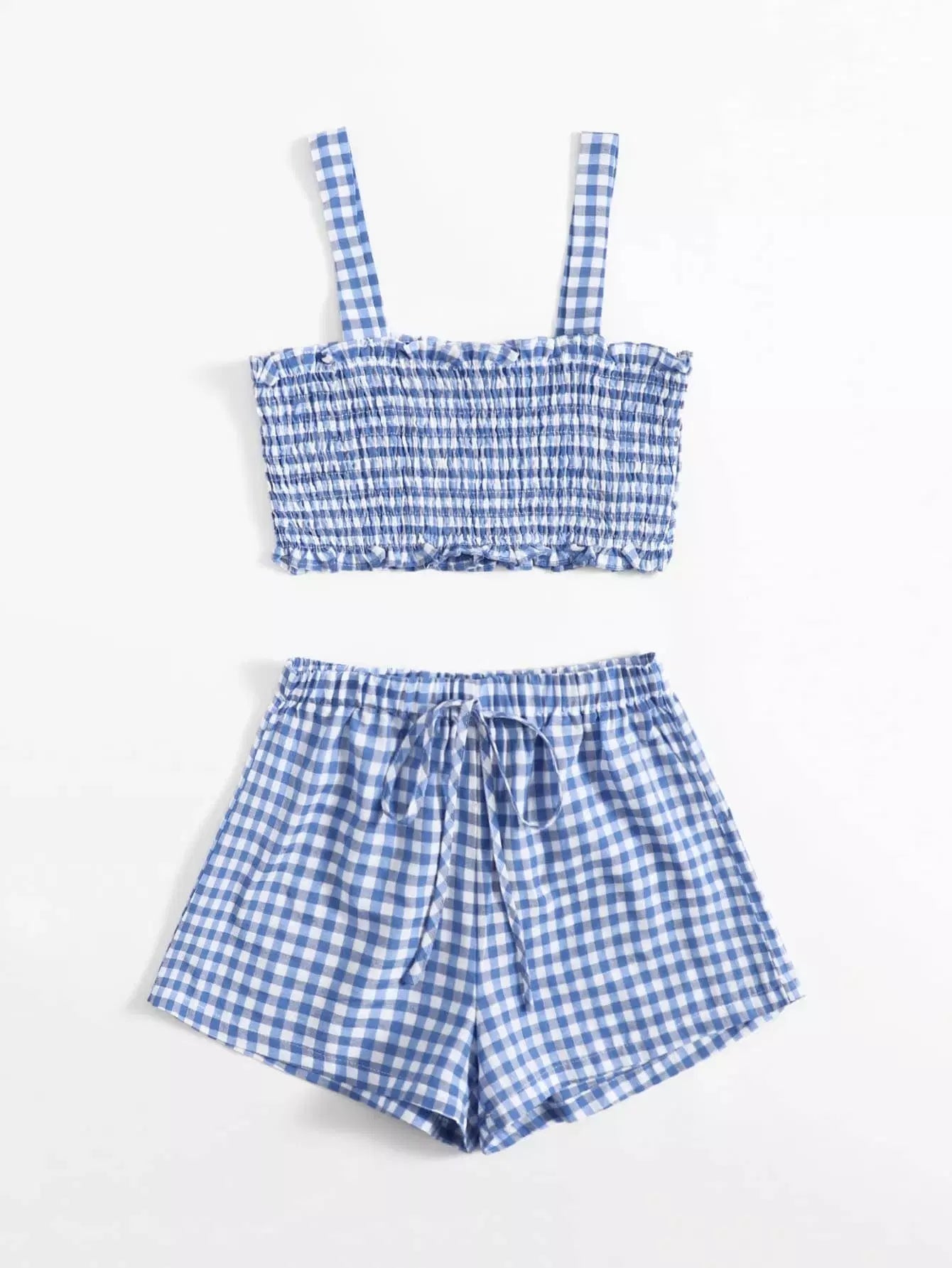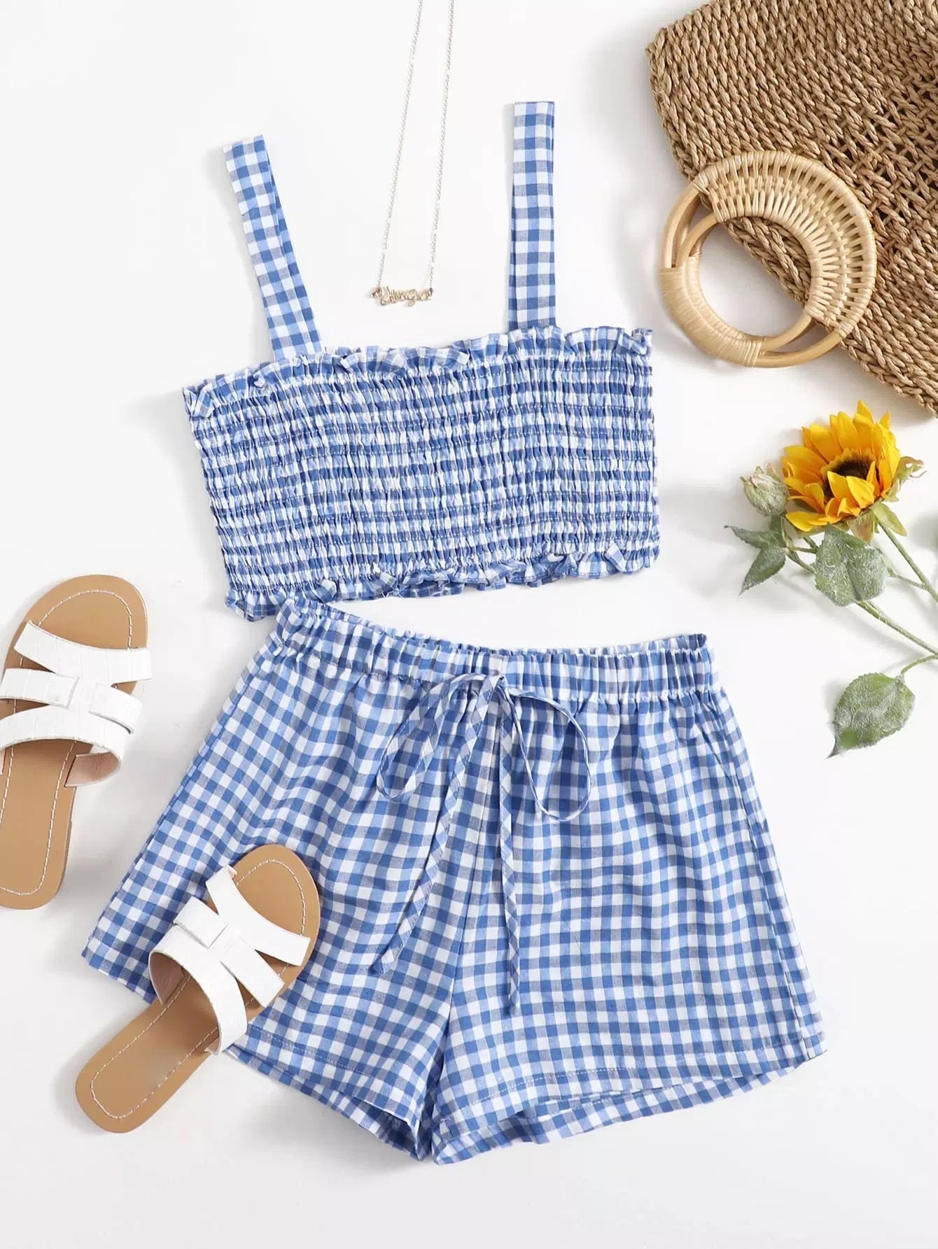 طقم قميص قصير كشكش بحواف كشكش وشورت بخصر مع عقدة