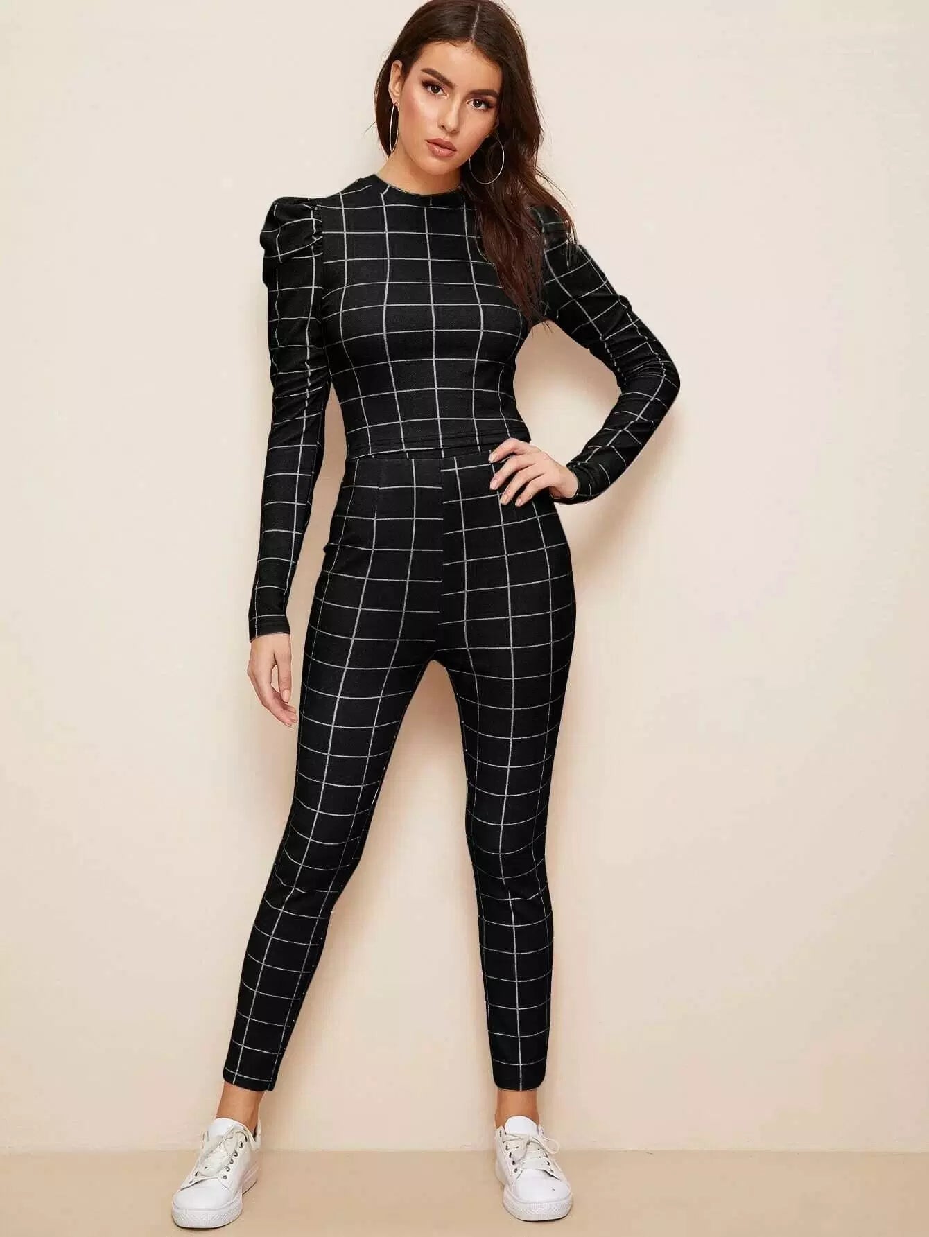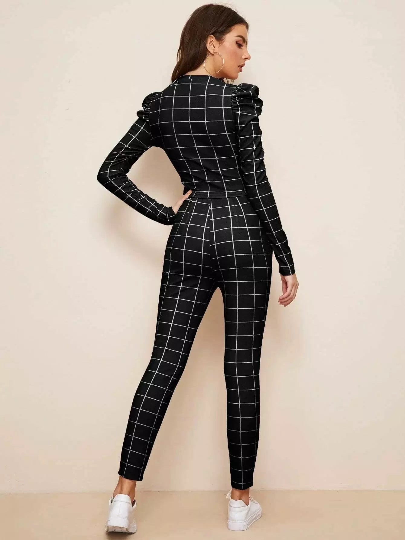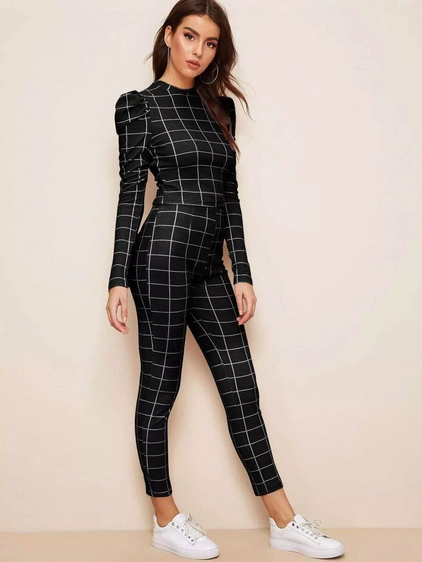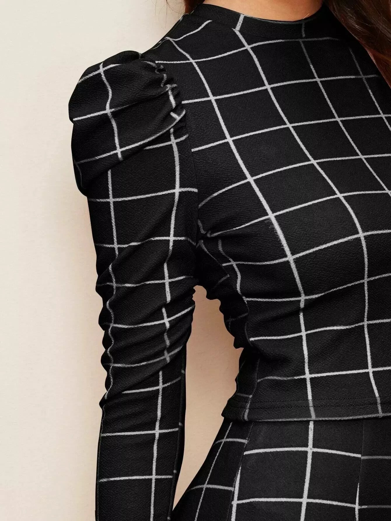 طقم بلوزة بأكمام جيجوت وبنطال ضيق قصير بطبعة شبكية