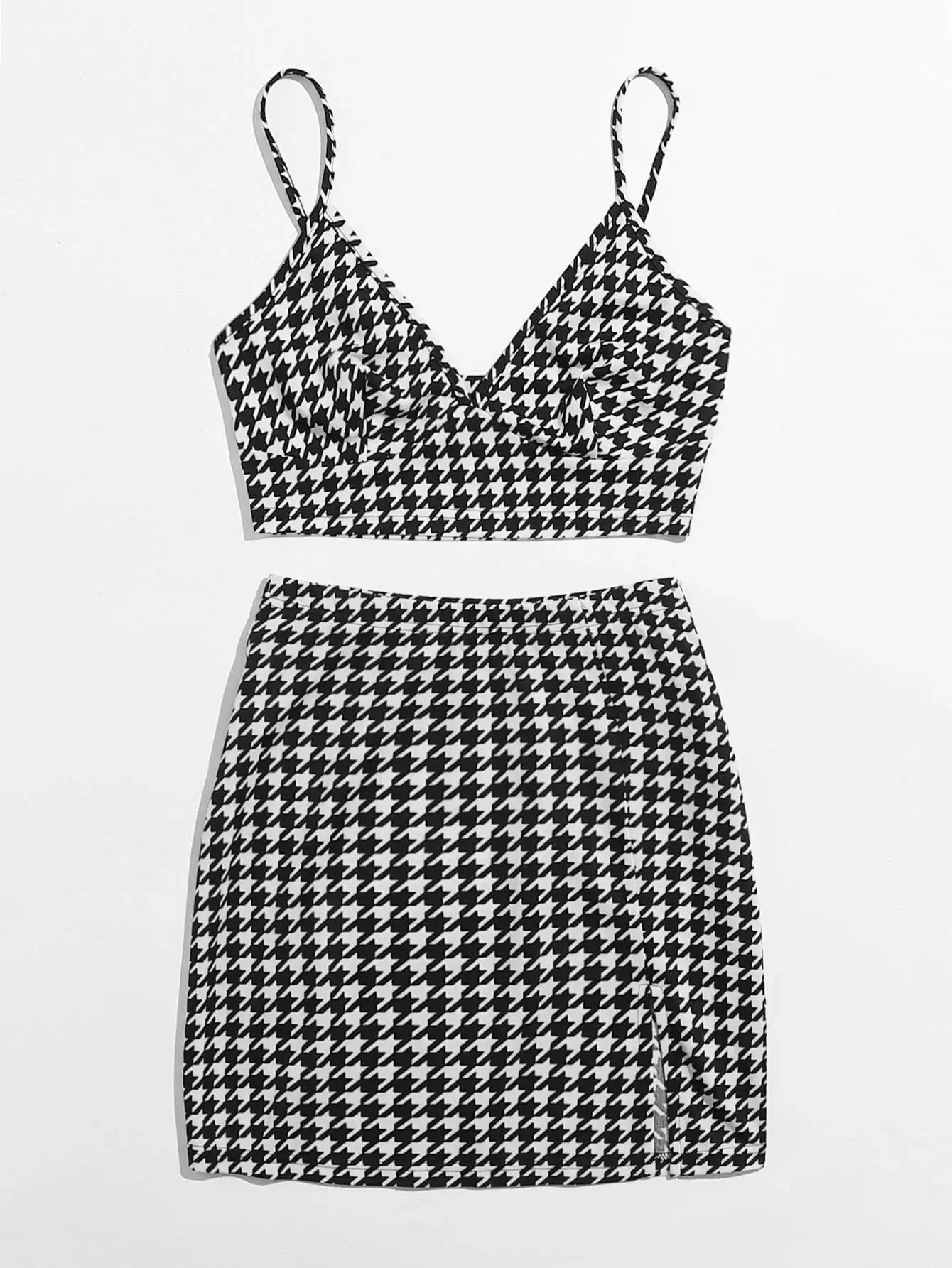 طقم قميص قصير بقصّة هاوندستوث مع تنورة بحافة منقسمة