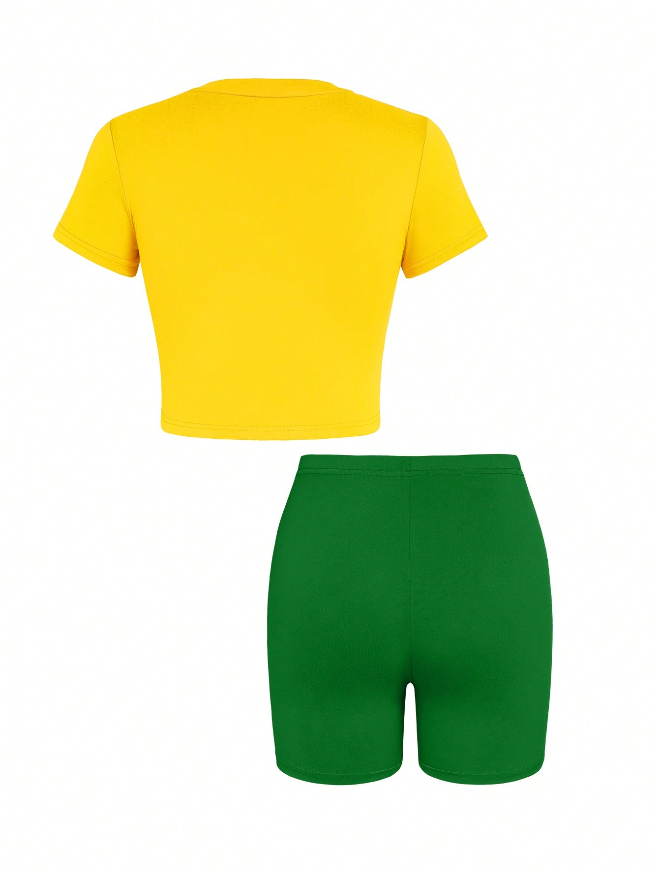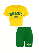 women INAWLY Women Brazilian Flag Printed Short Sleeve T-Shirt And Shorts Tight-Fitting Summer Two-Piece Set