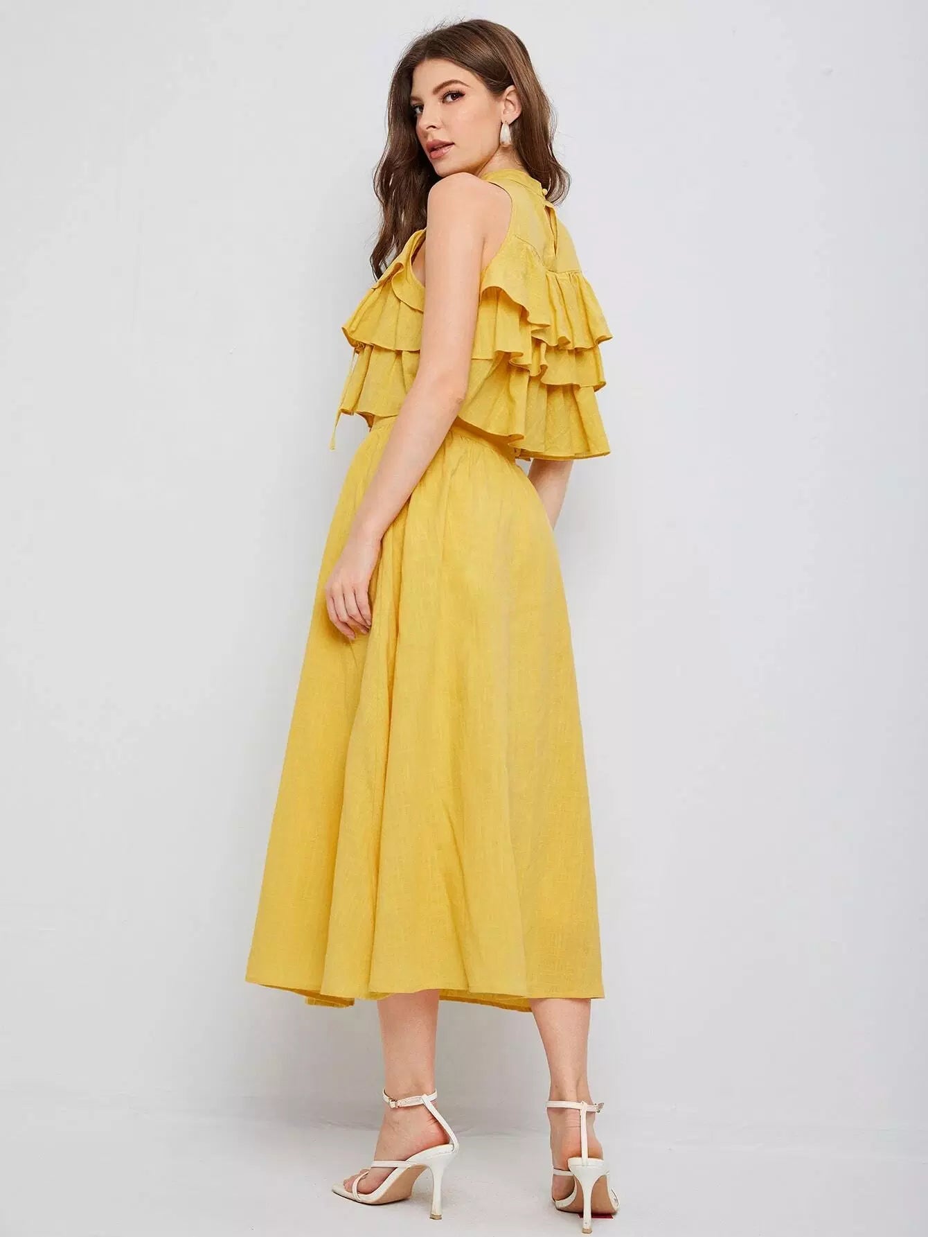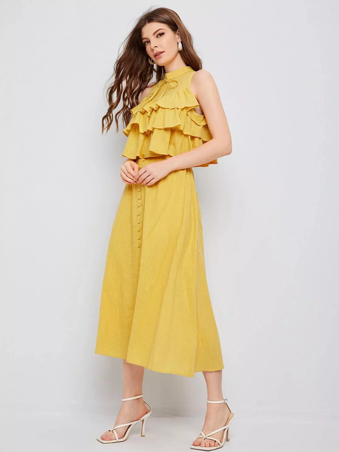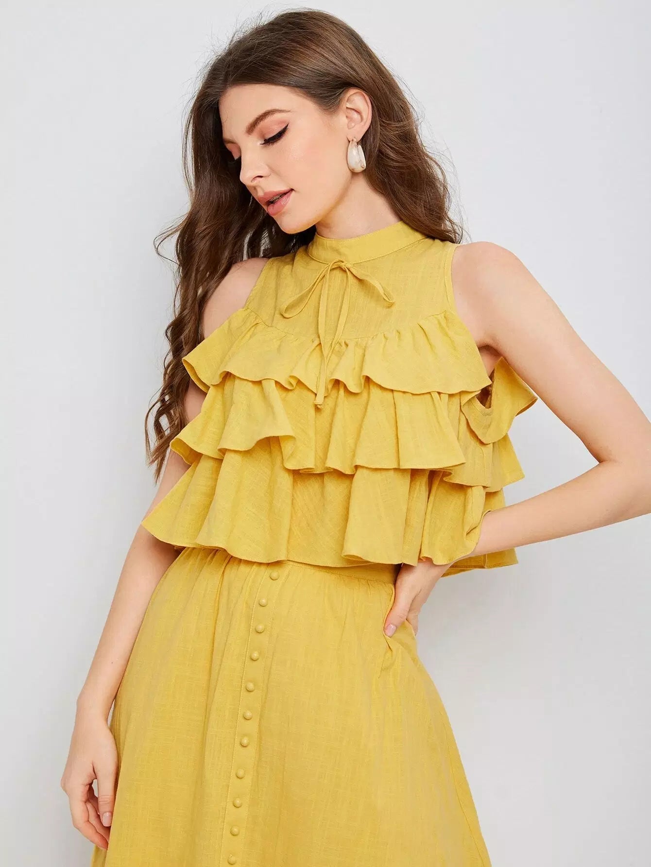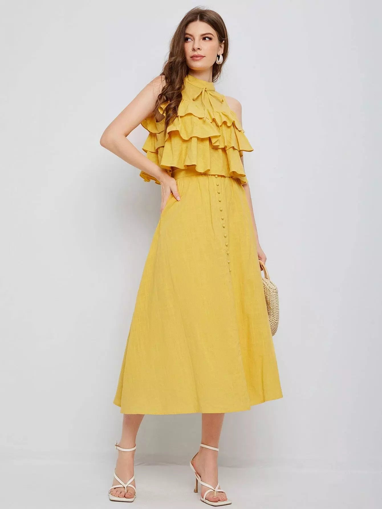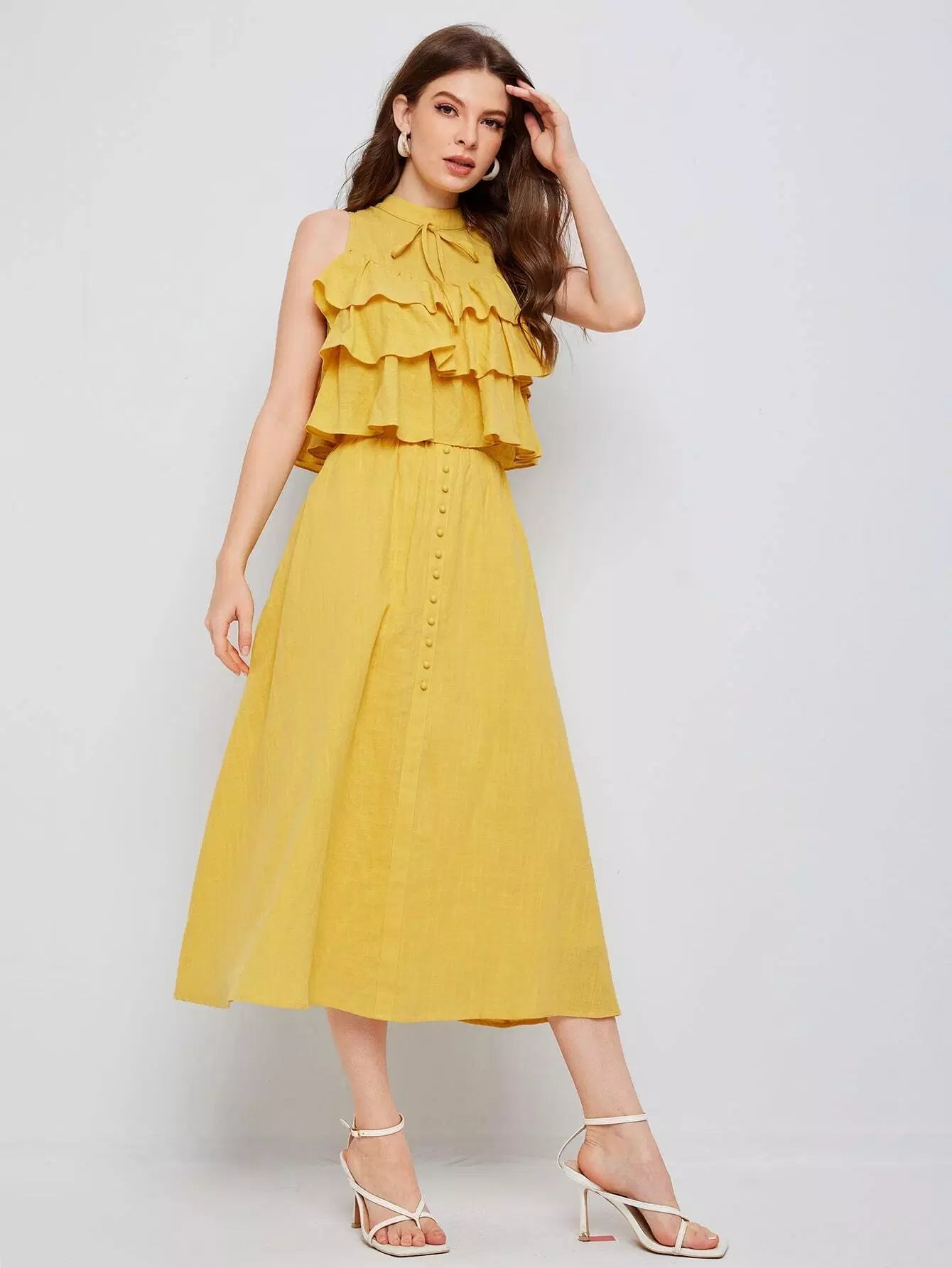 طقم بلوزة بحاشية أمامية متعددة الطبقات مع تنورة بأزرار أمامية