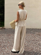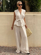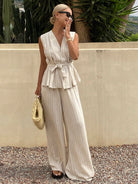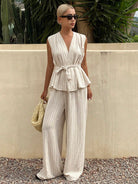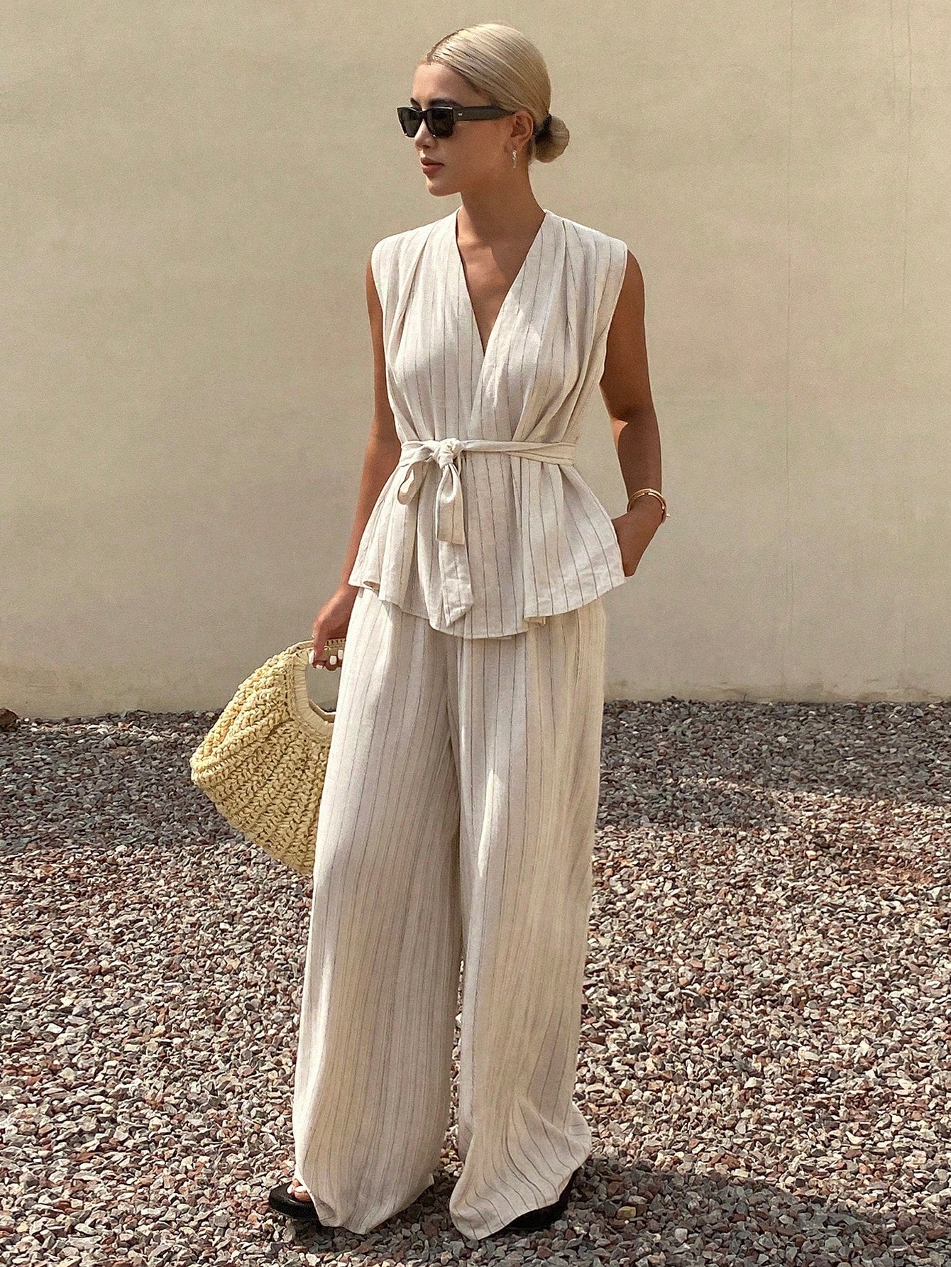 Livesso 2pcs Summer New Casual Waisted Women's Striped Vest And Wide-Leg Pants Set Linen