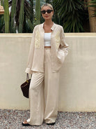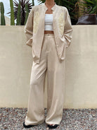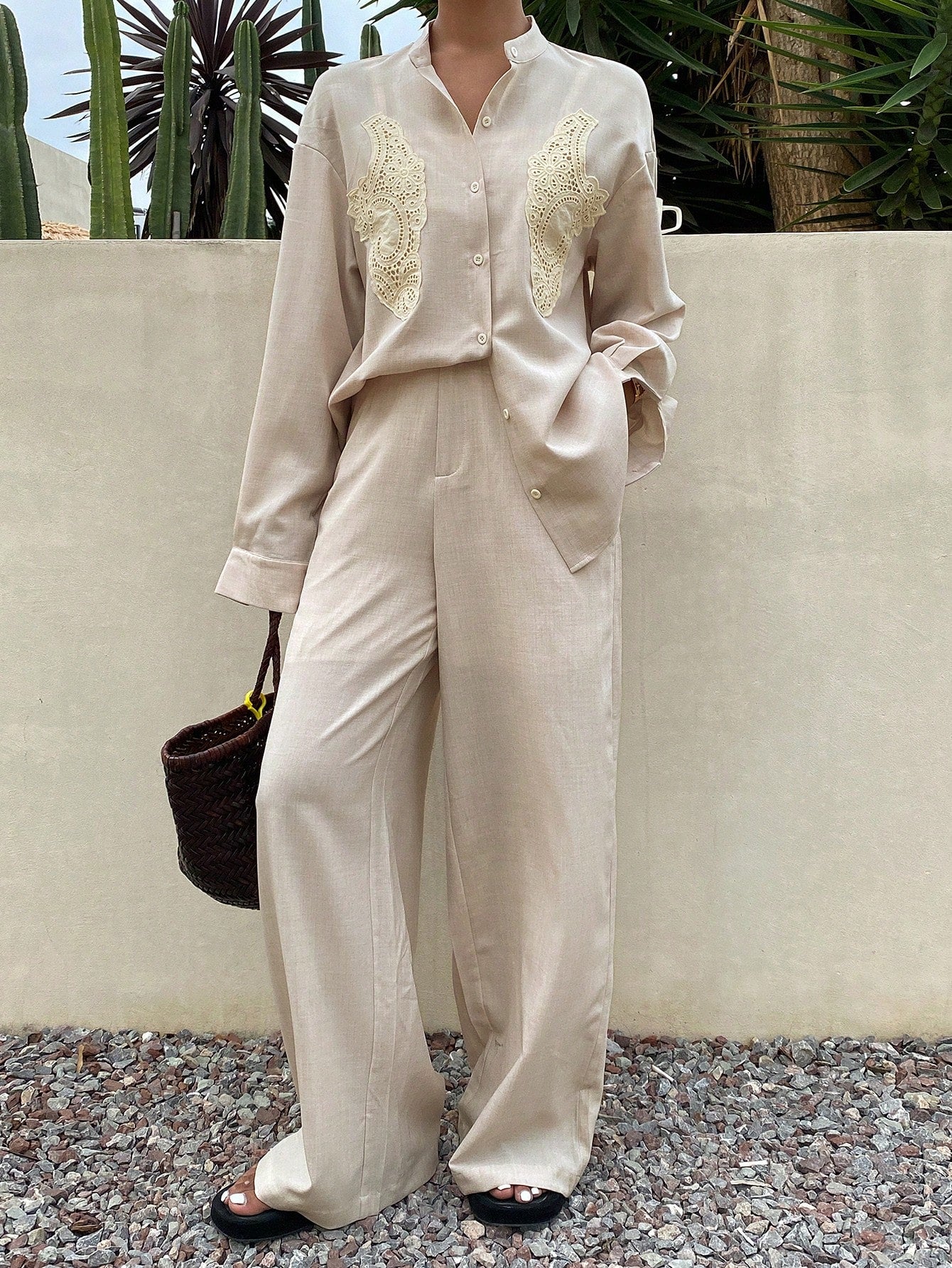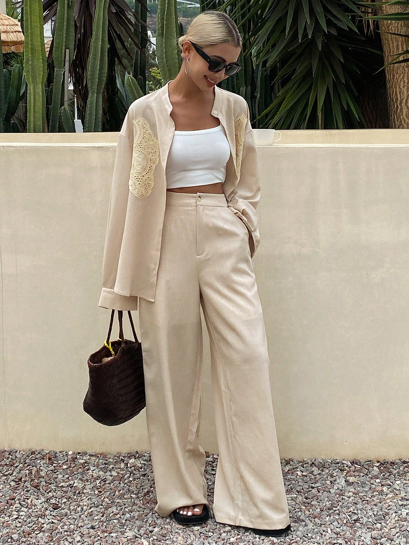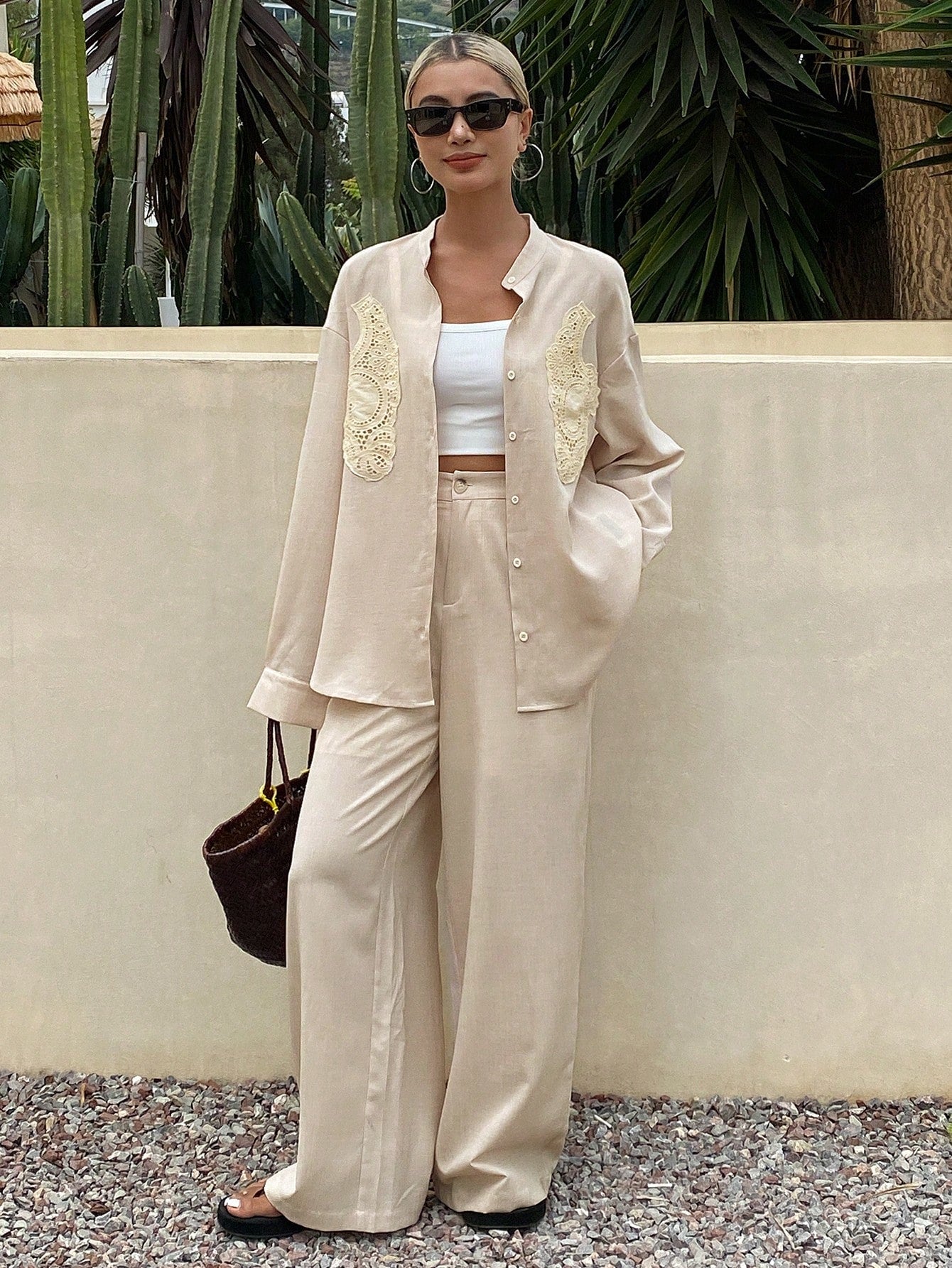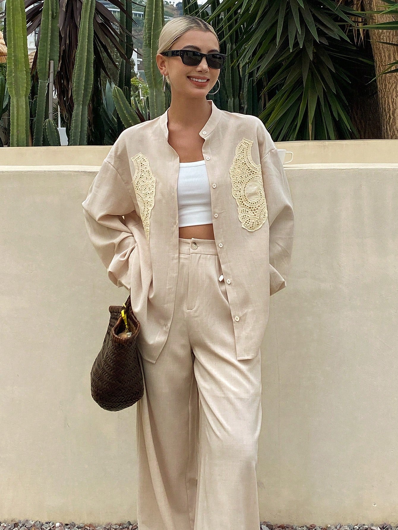 طقم بدلة وشورت فضفاض من ليفيسو صيفي كاجوال للنساء من الدانتيل المرقعة برقبة دائرية، طقم مكون من قطعتين للنساء