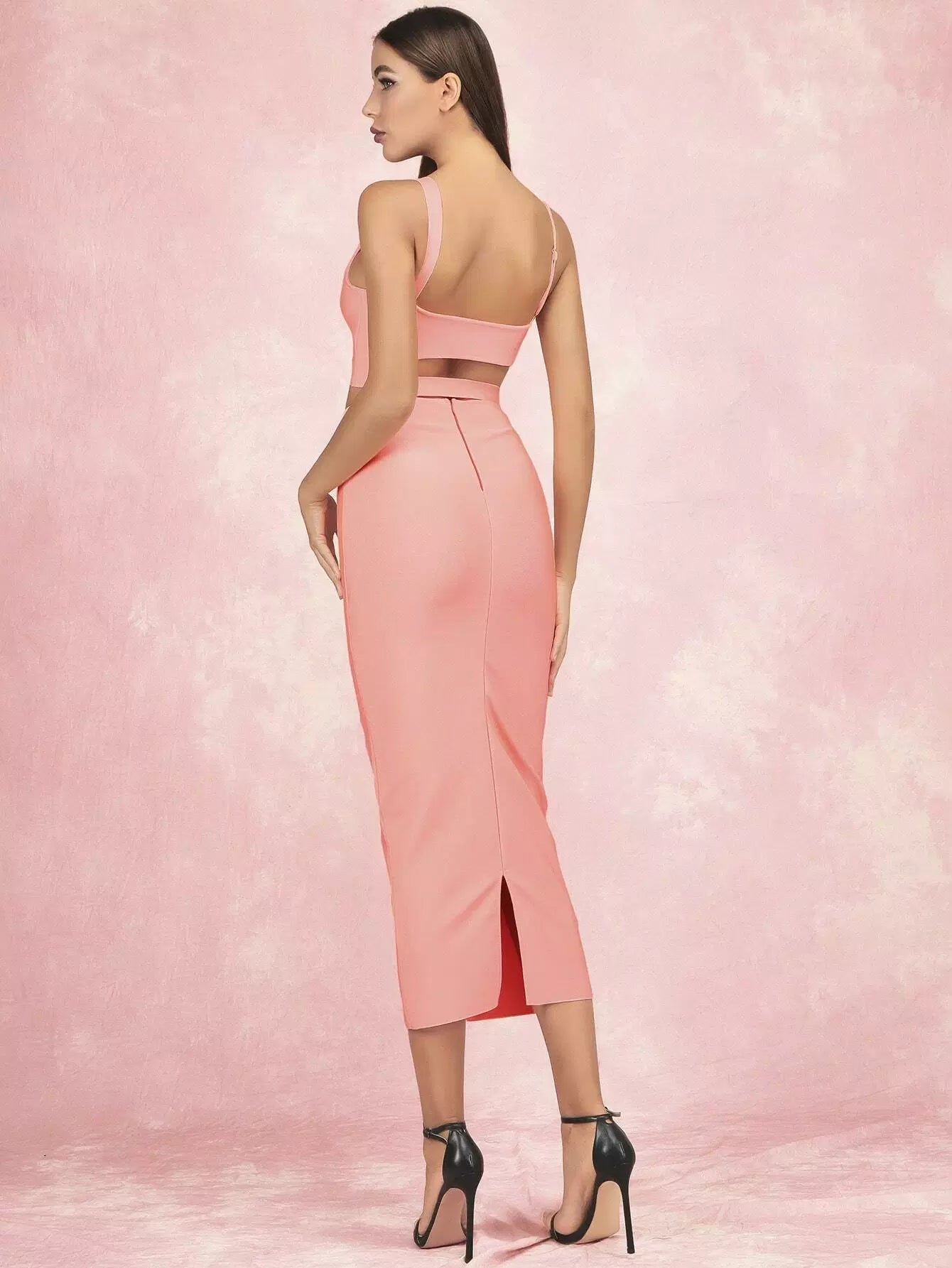طقم لوكرا بلوزة بفتحة قصيرة، وتنورة بحافة منقسمة من لوسرا