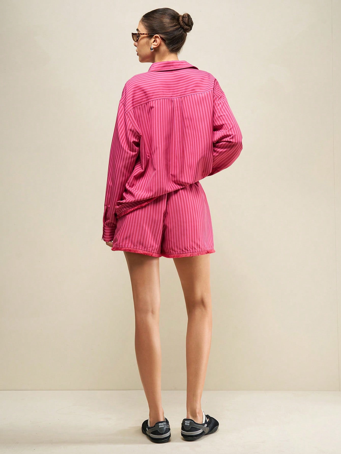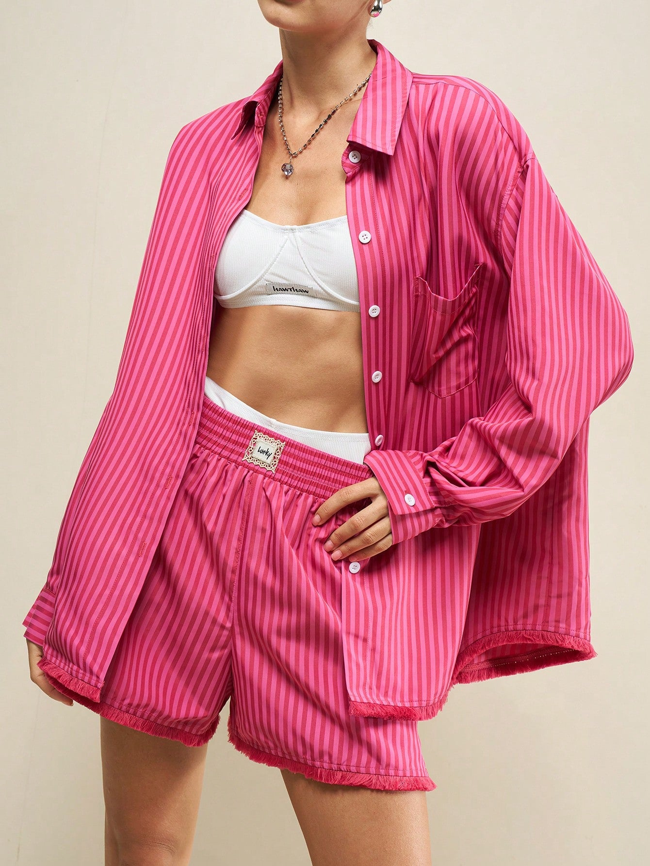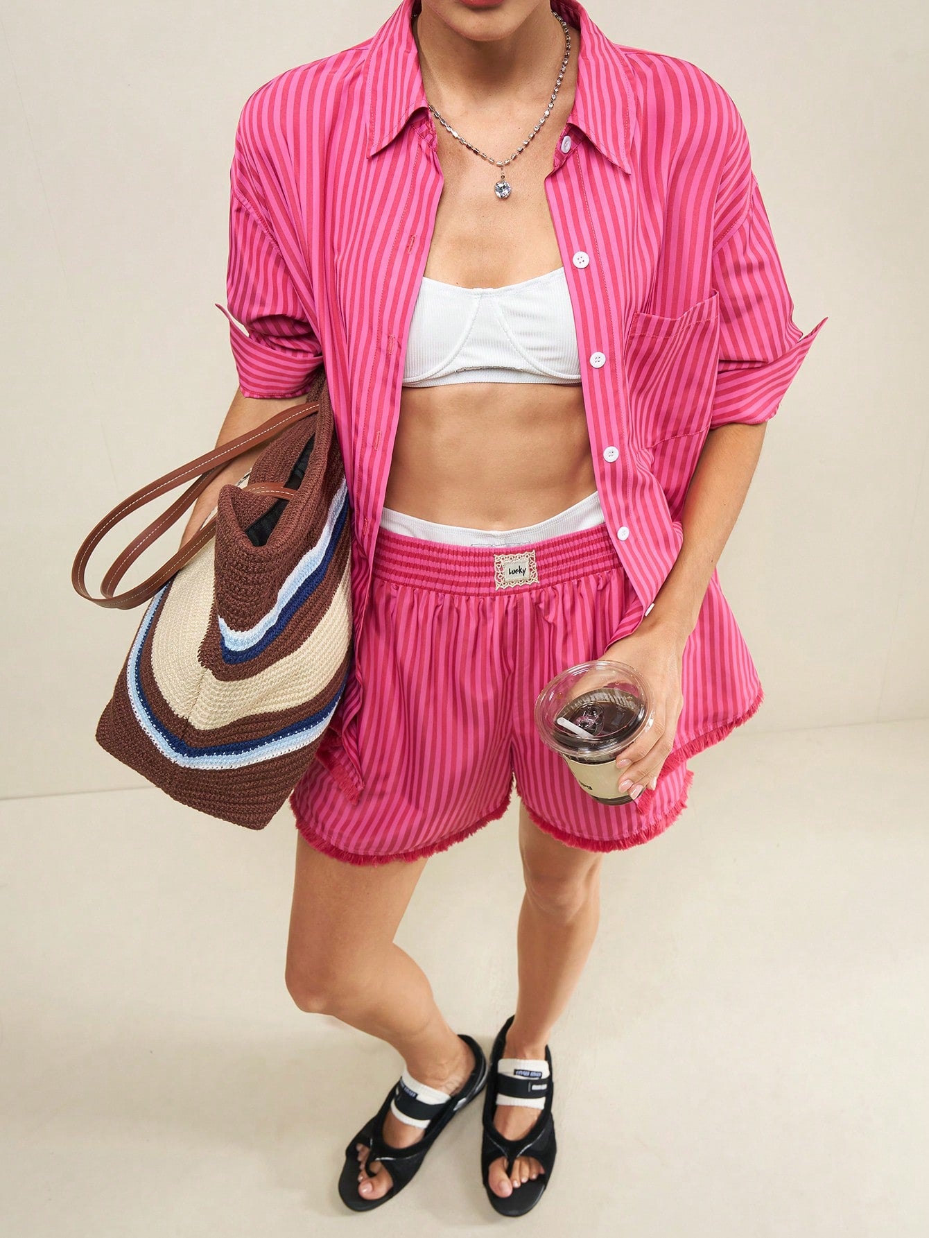 Muvela 2pcs/Set Women Striped Button-Up Blouse & Loose Shorts Set, Summer