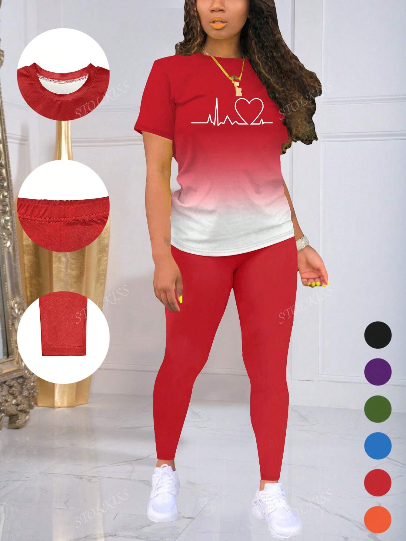 Ombre Heart Pattern Short Sleeve T-Shirt And Leggings Sports Set