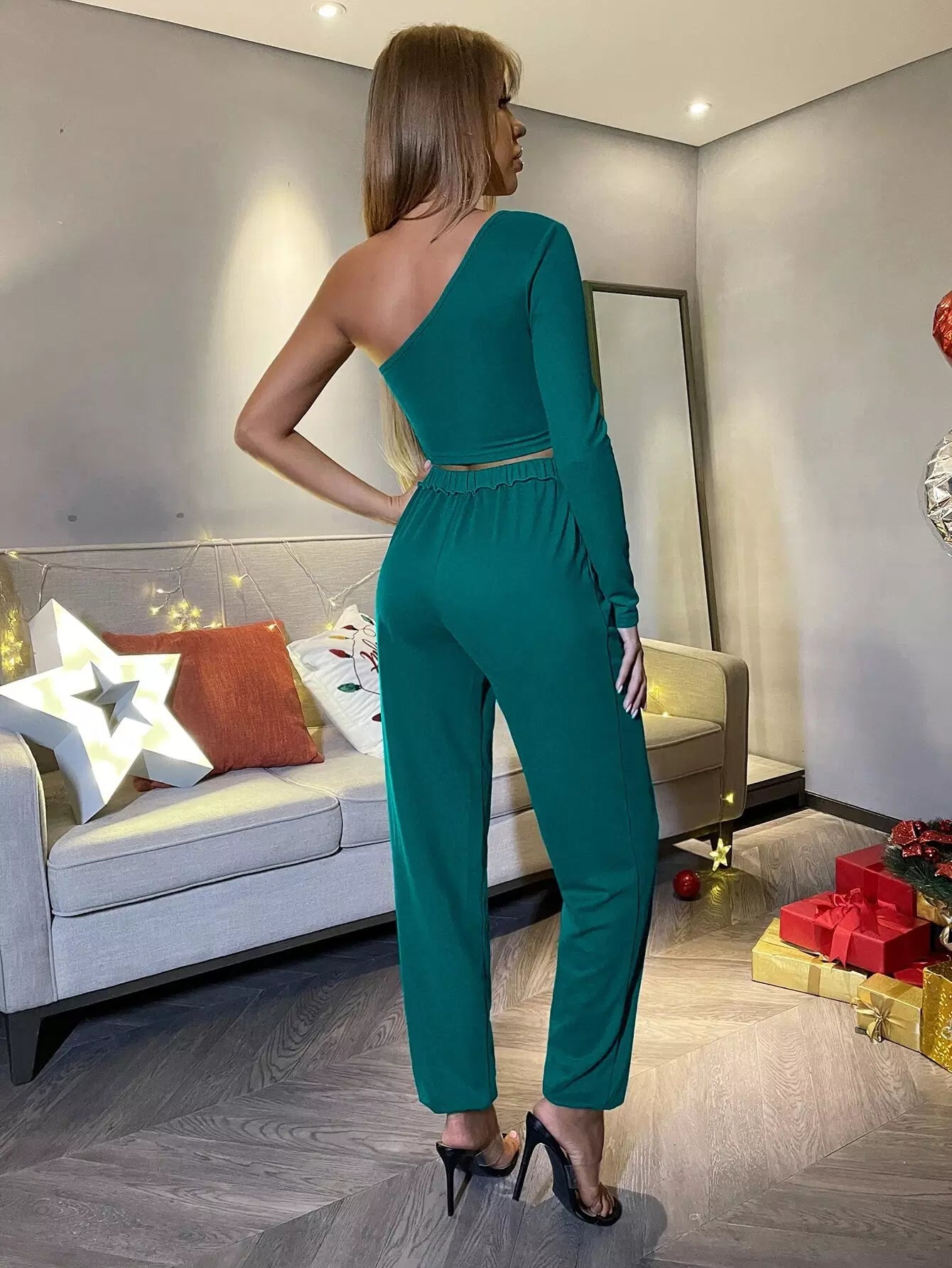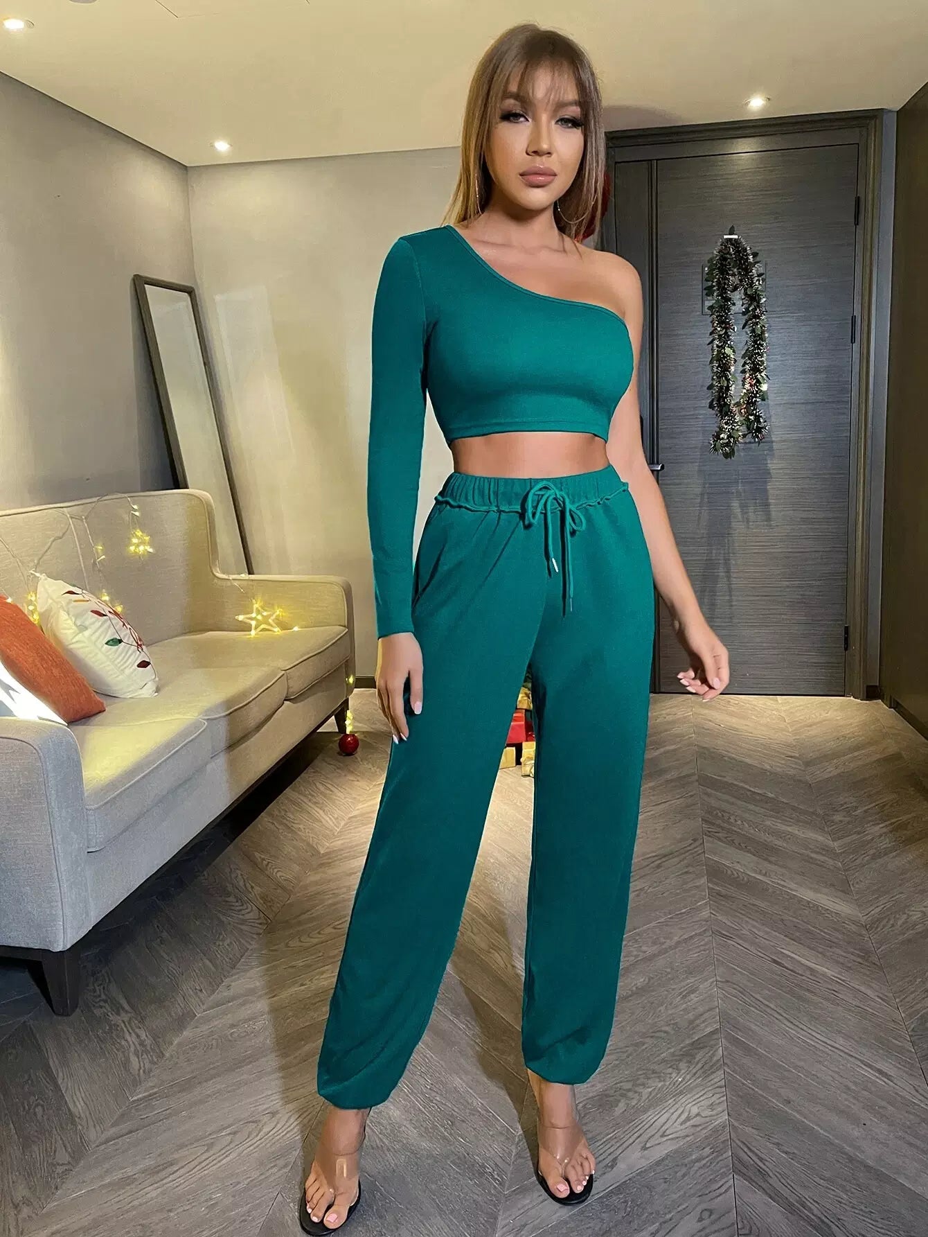 بلوزة قصيرة ذات كتف واحد وبنطال رياضي بخياطة علوية برباط خصر من الأعلى