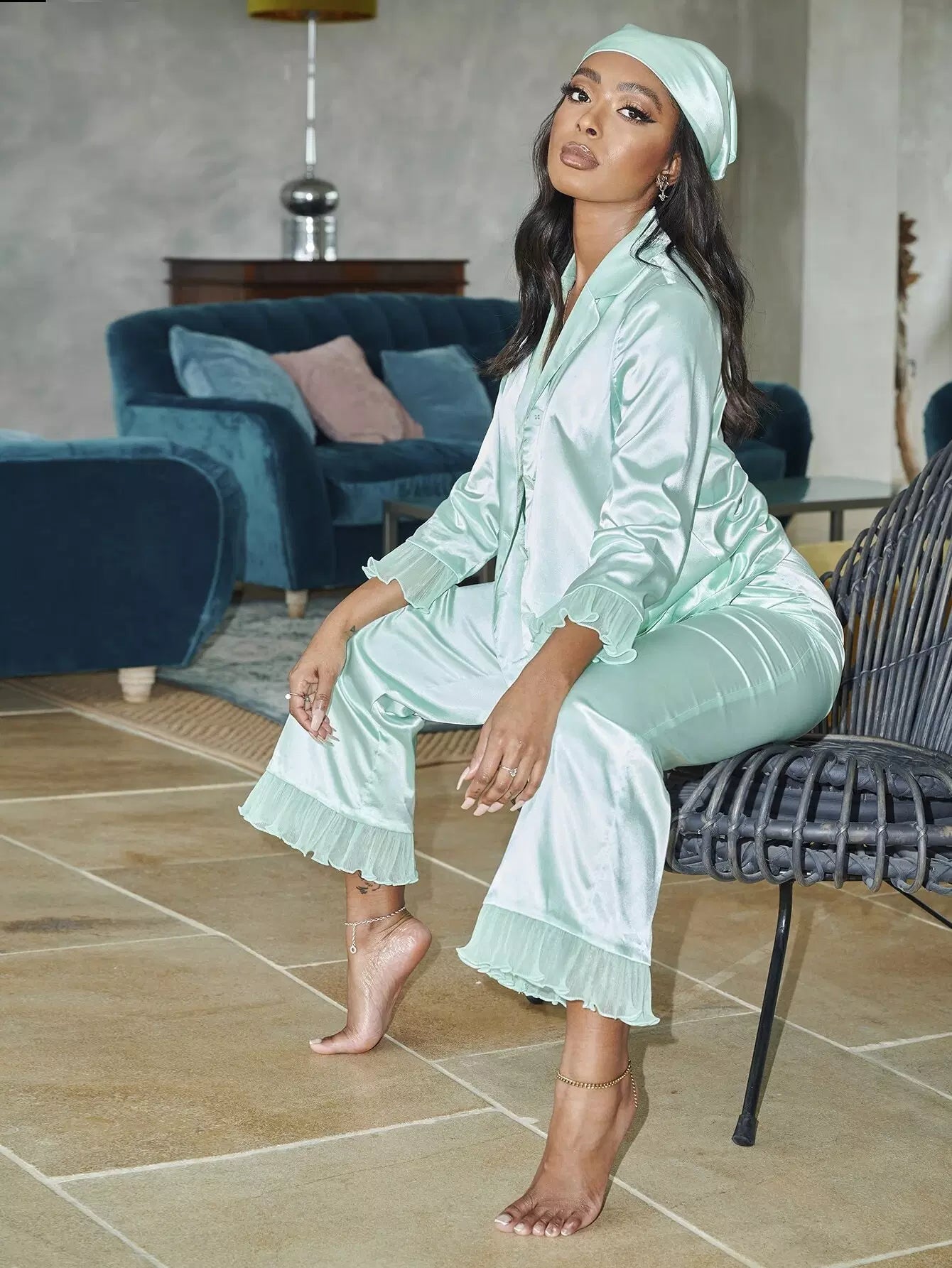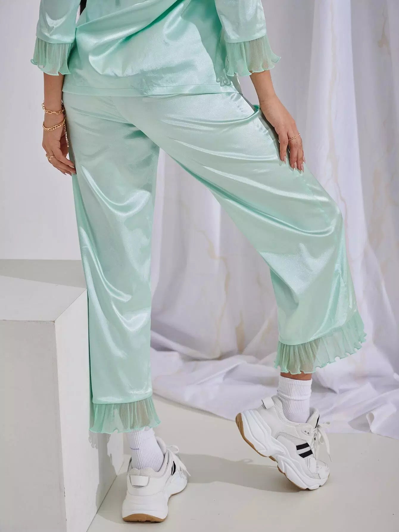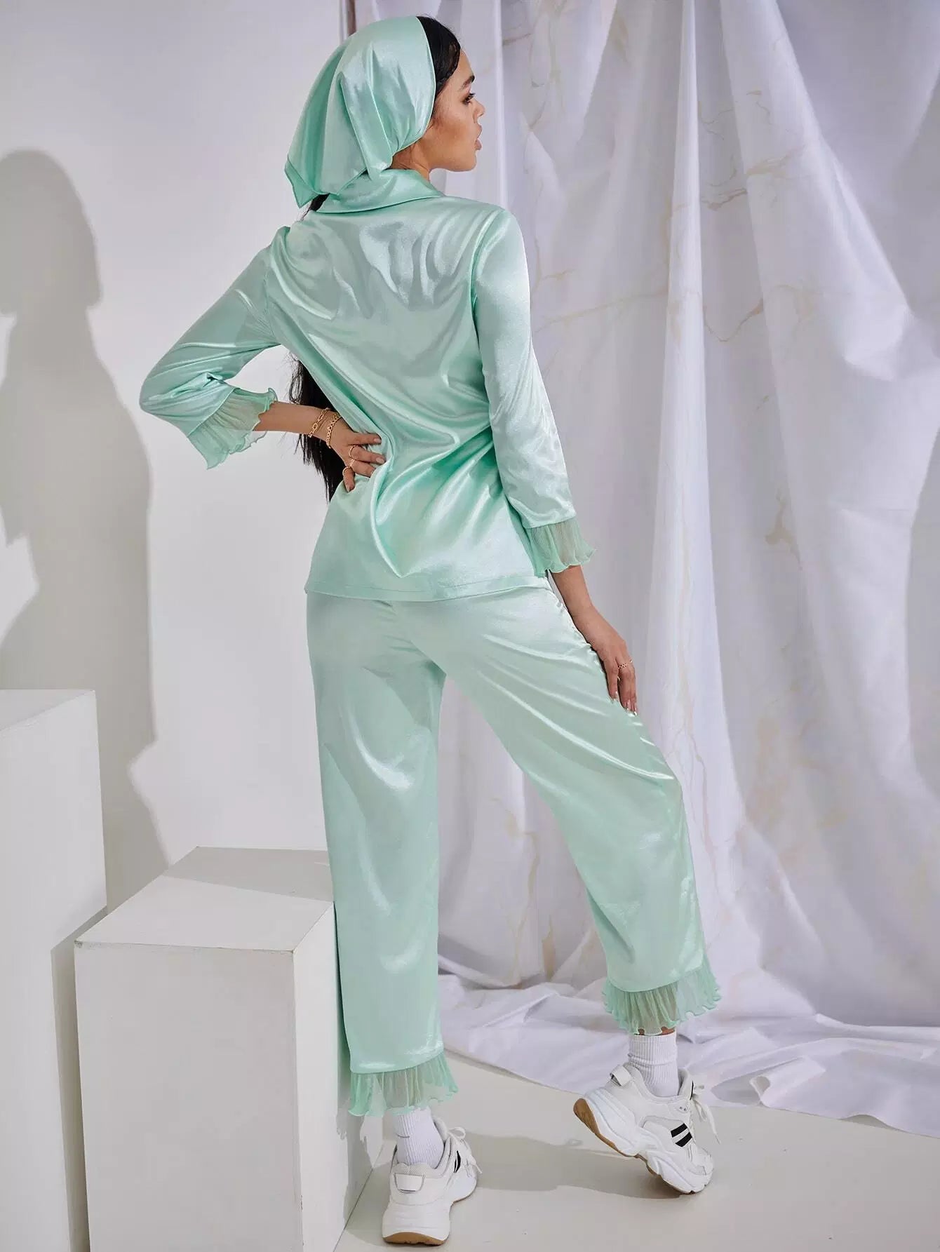 طقم بلوزة وبنطلون من الساتان المزين بكشكشة أمامية بجيب أمامي مع منديل