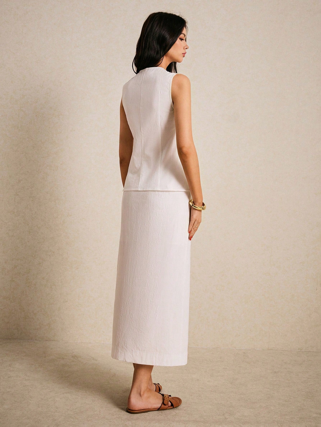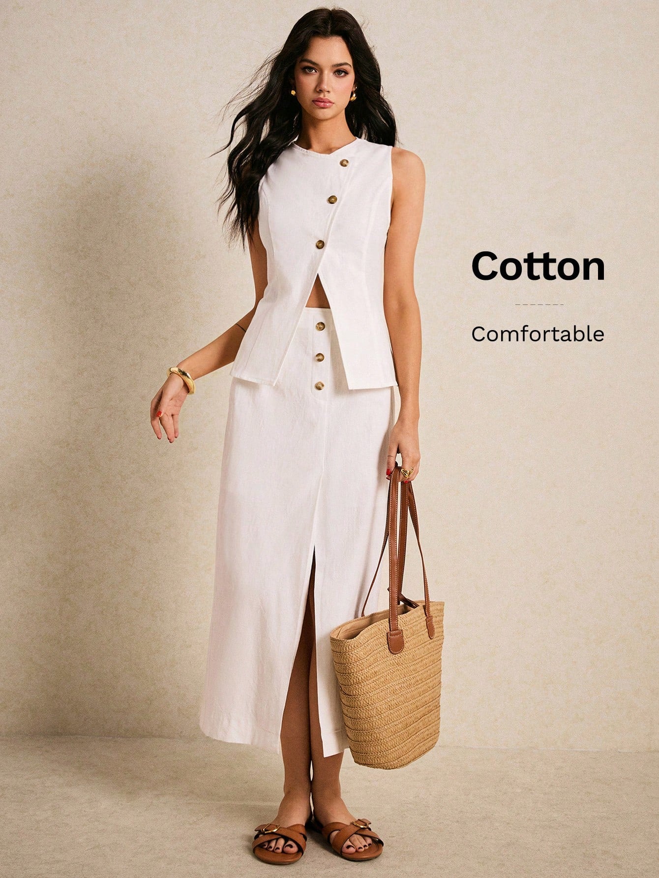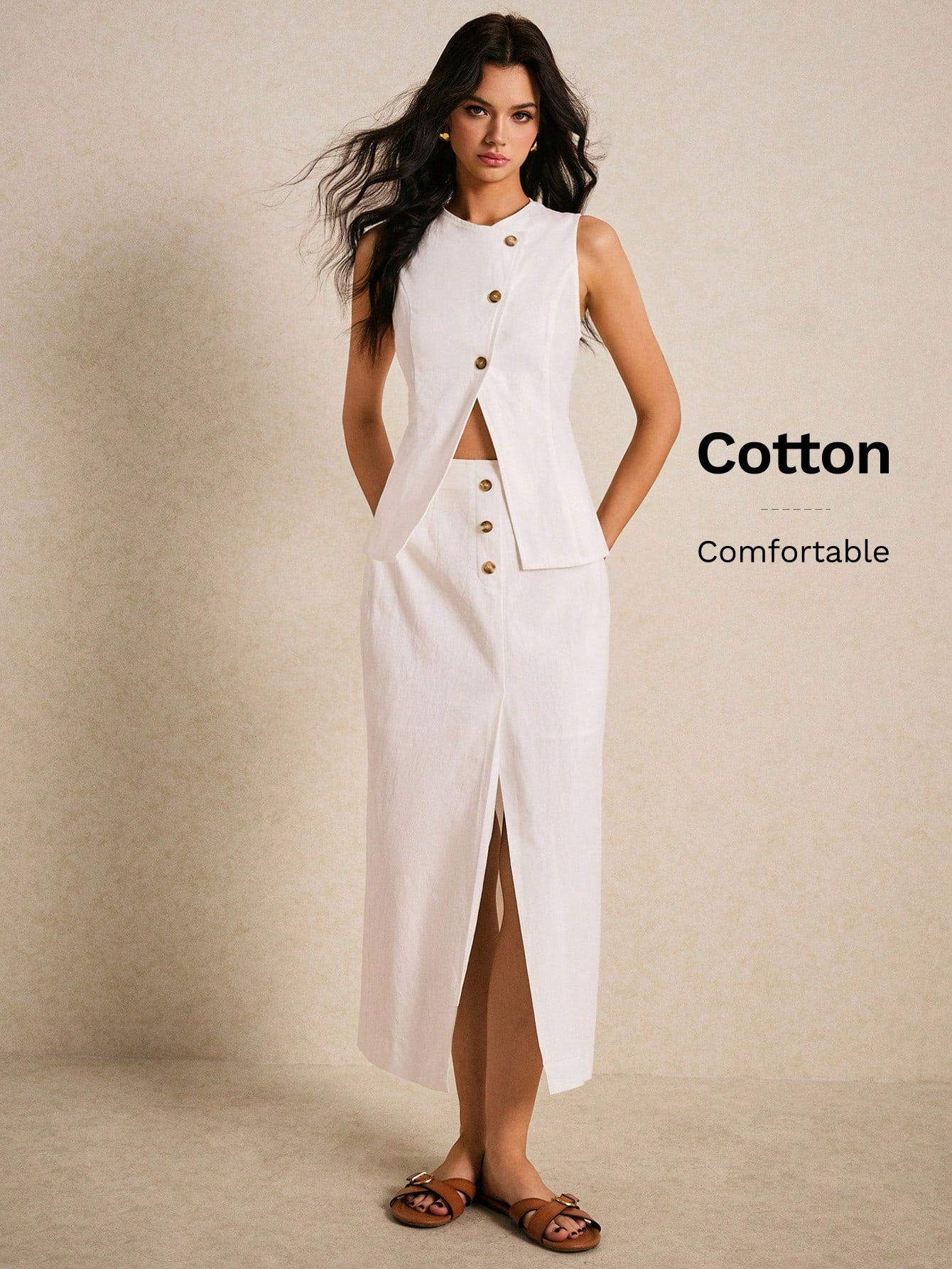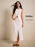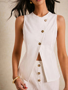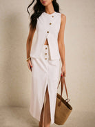 women Poï؟½selle Elegant Two-Piece White Suit With Button Detail And Front Slit