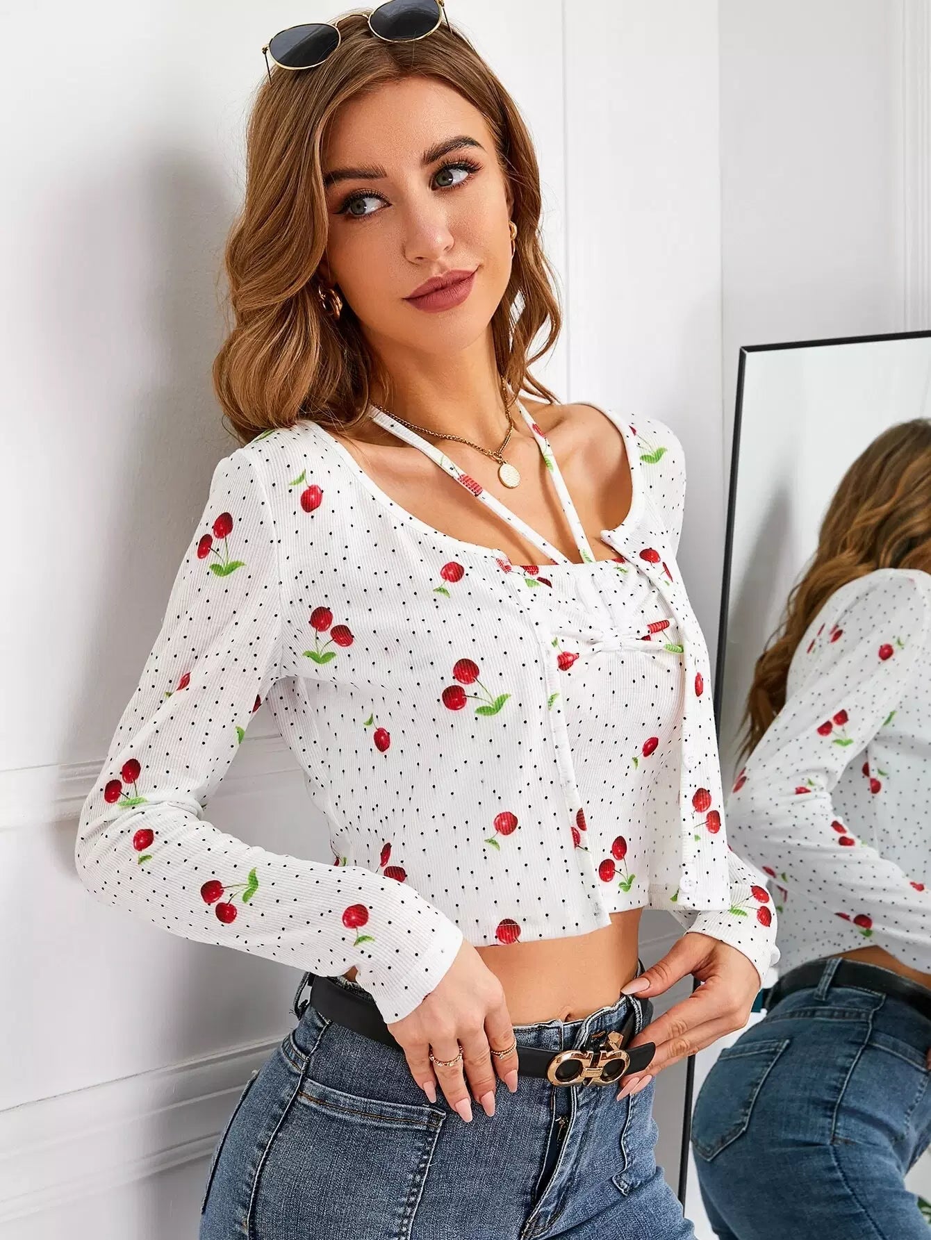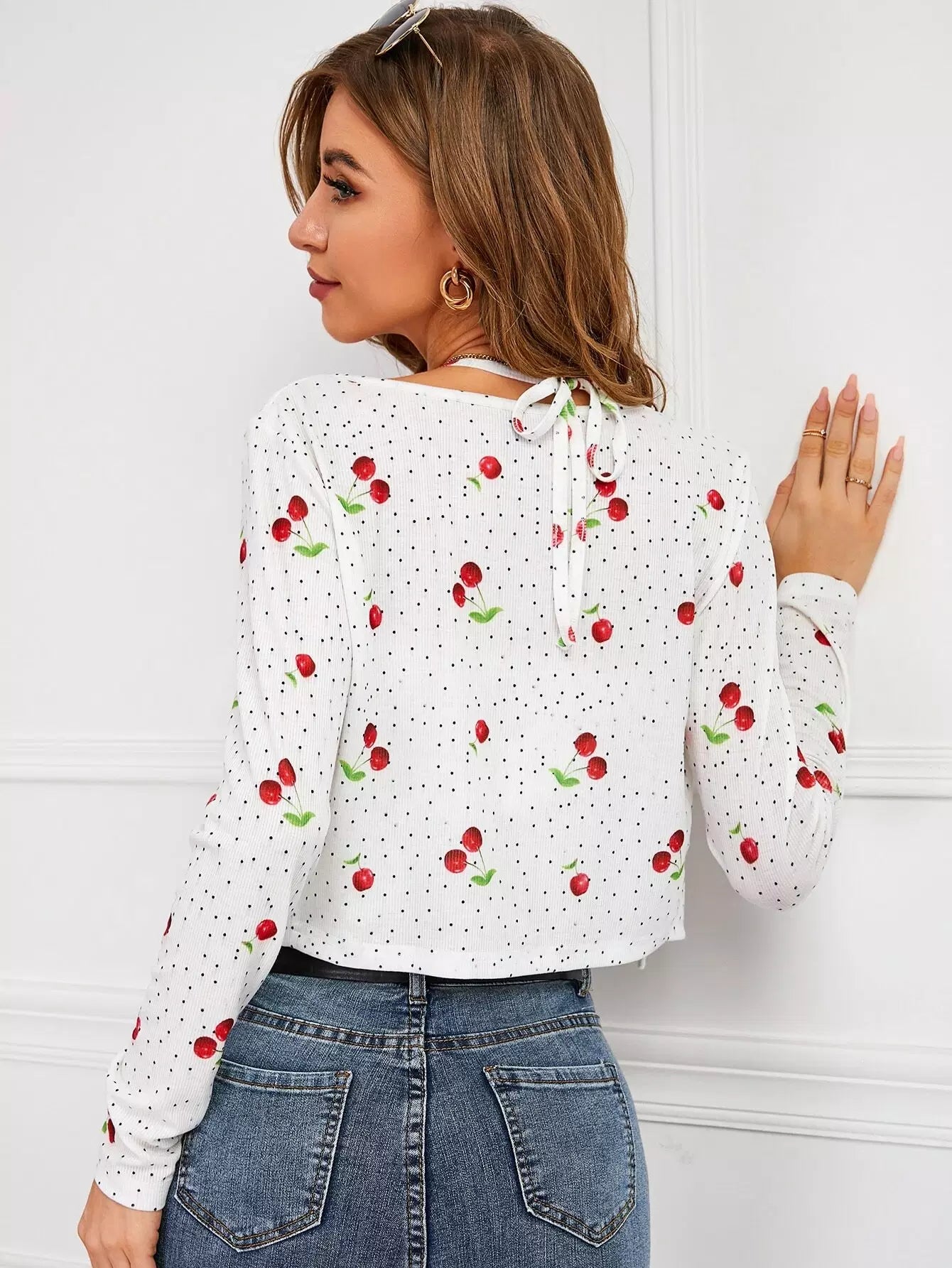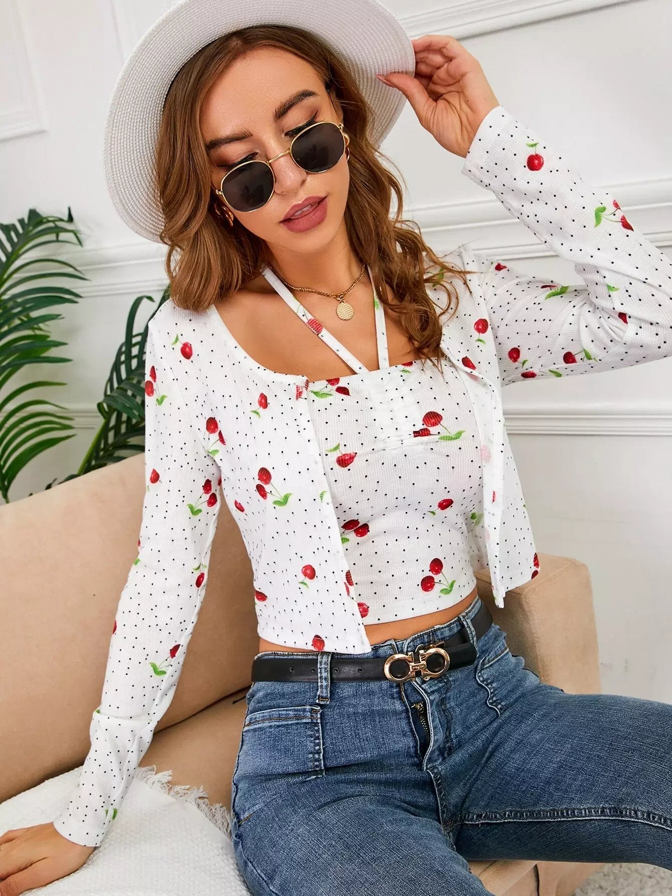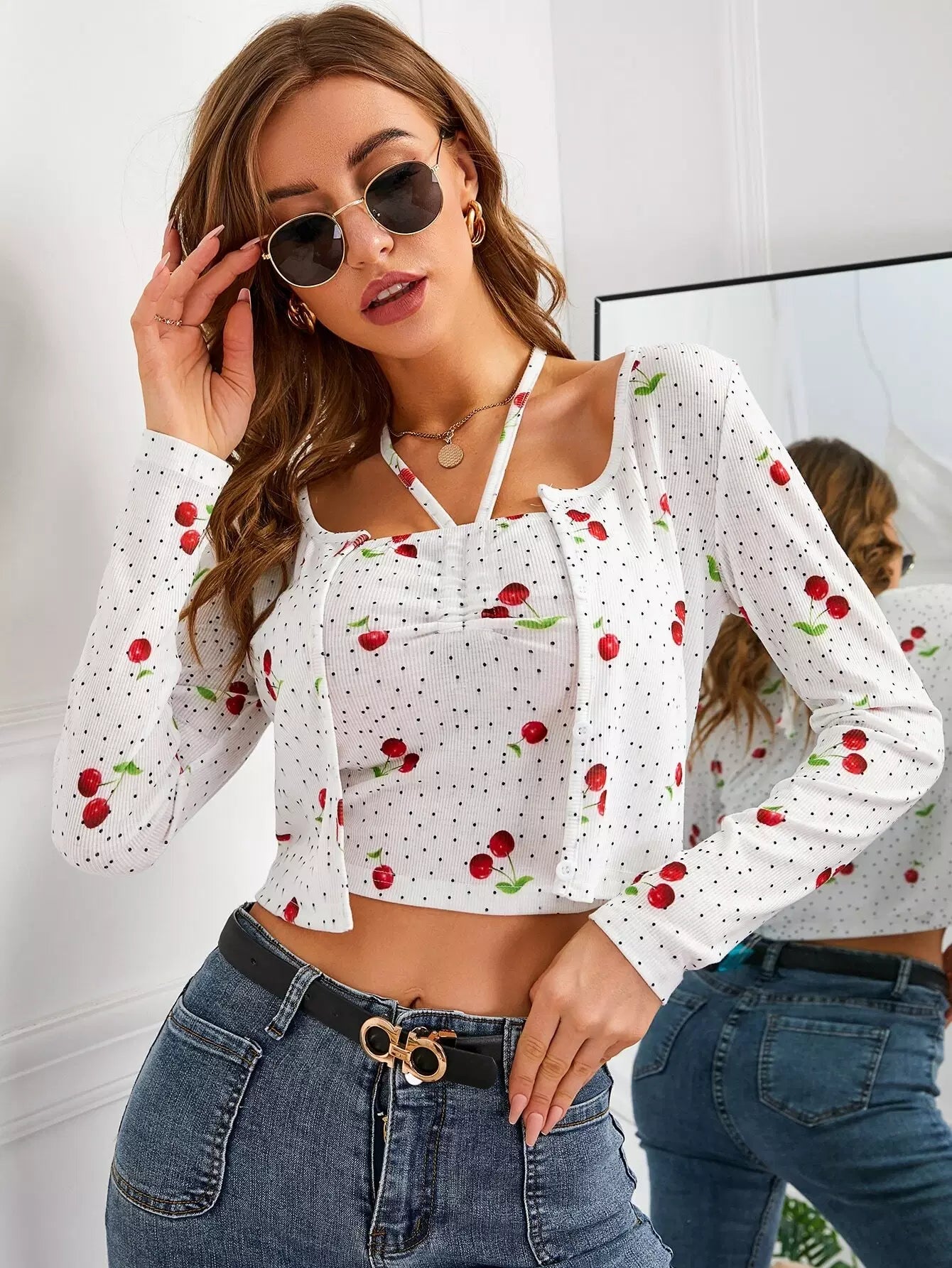 بلوزة وسترة بطبعة كرز منقطة بطبعة كرز منقطة