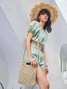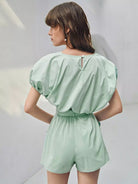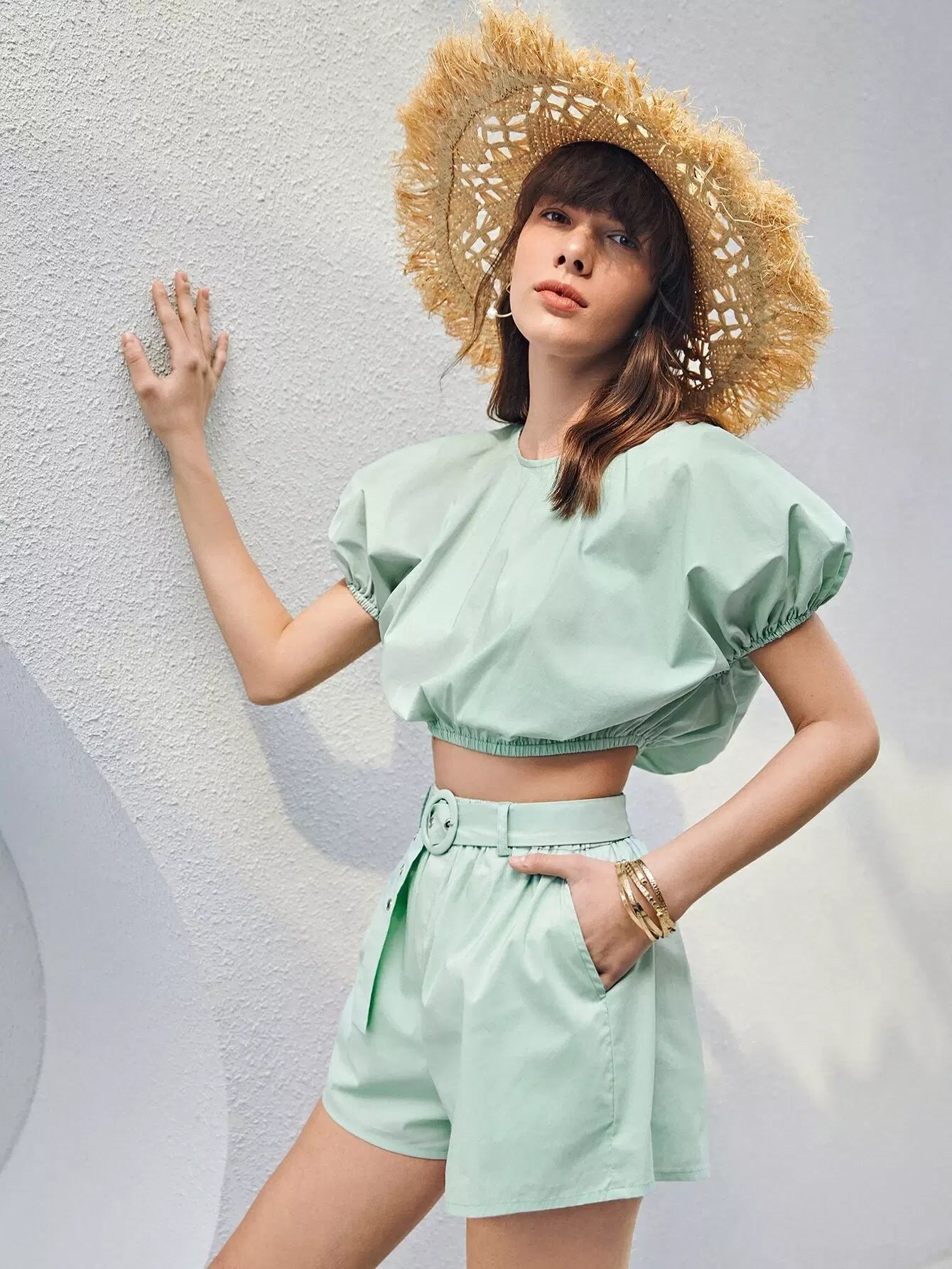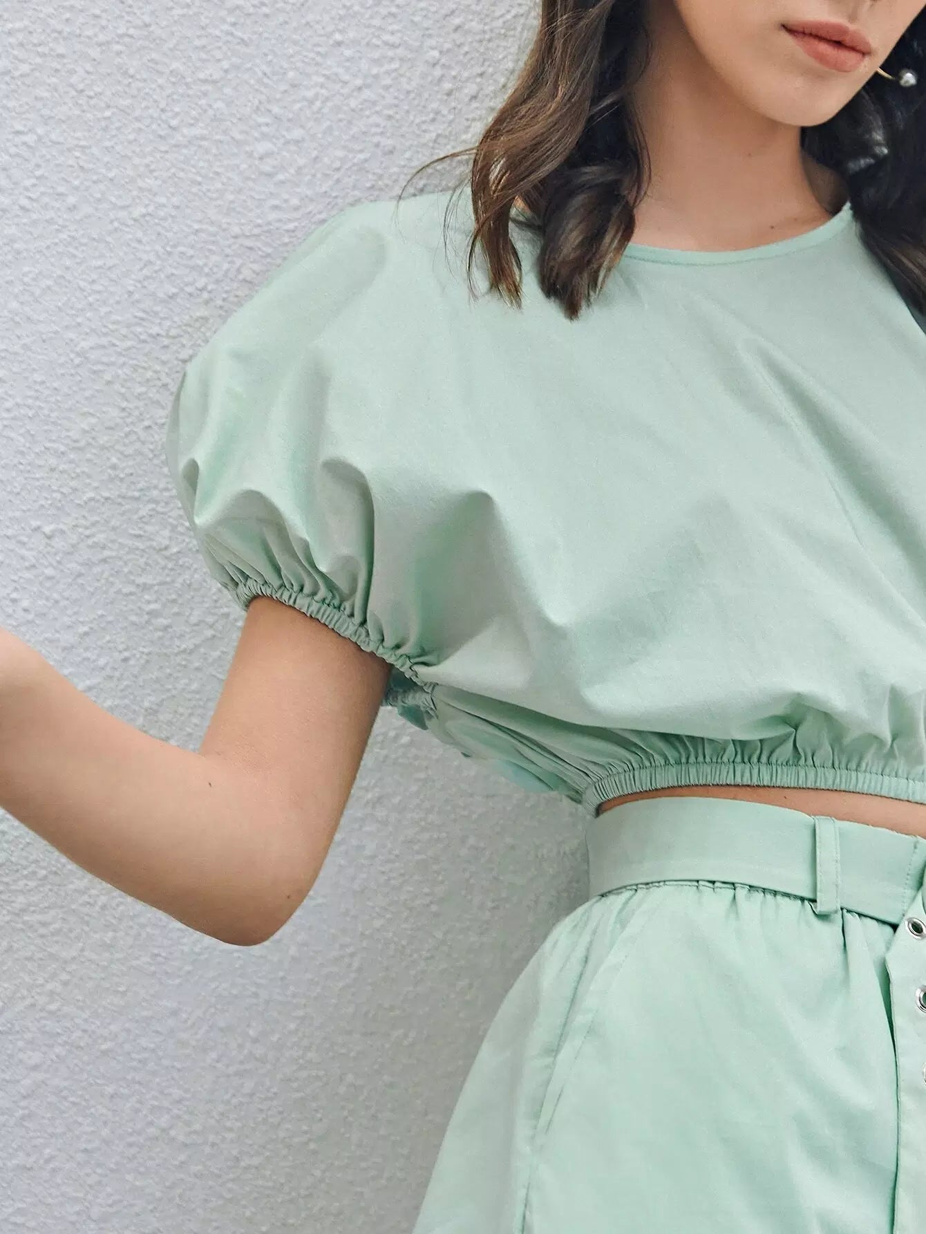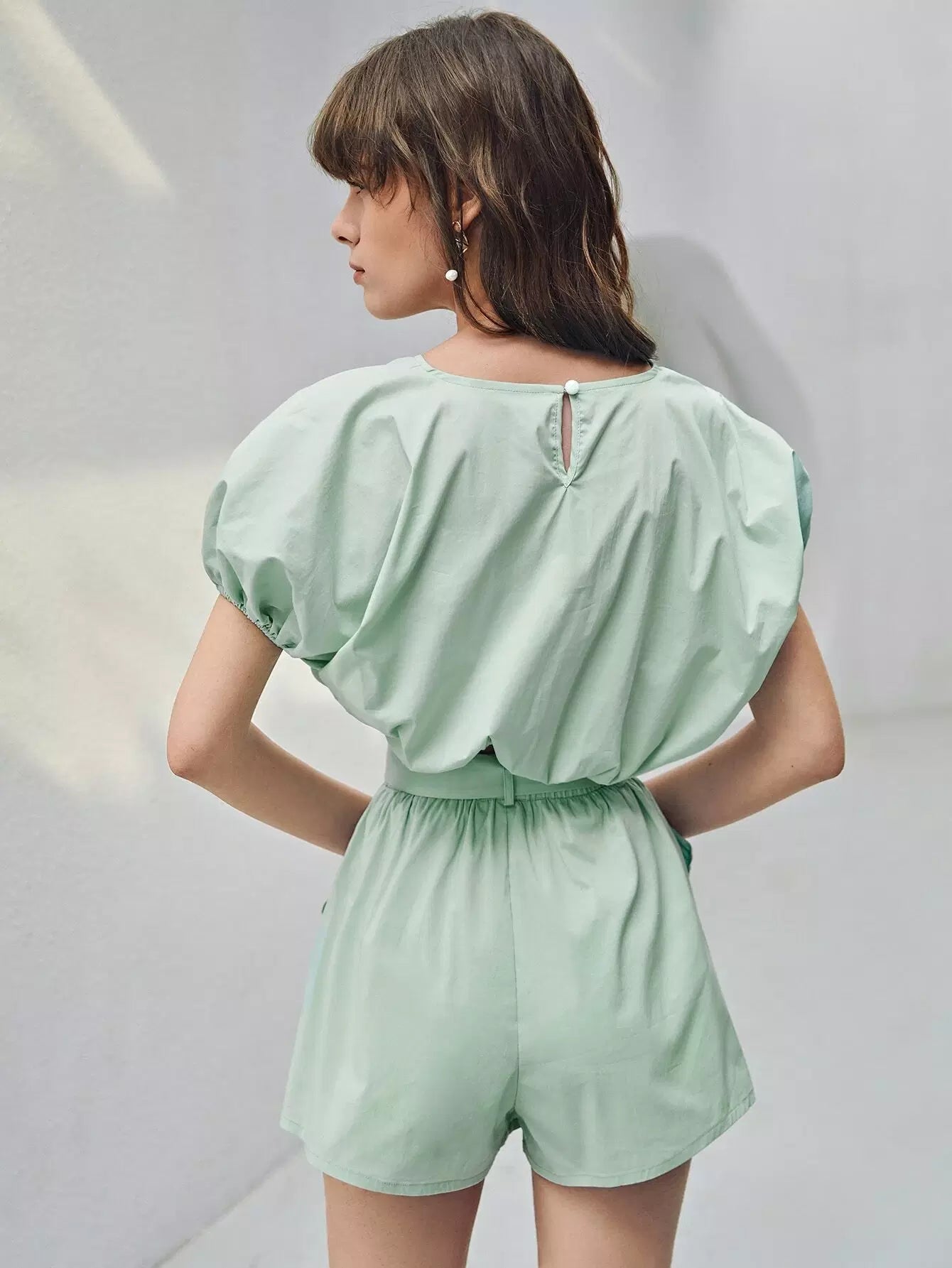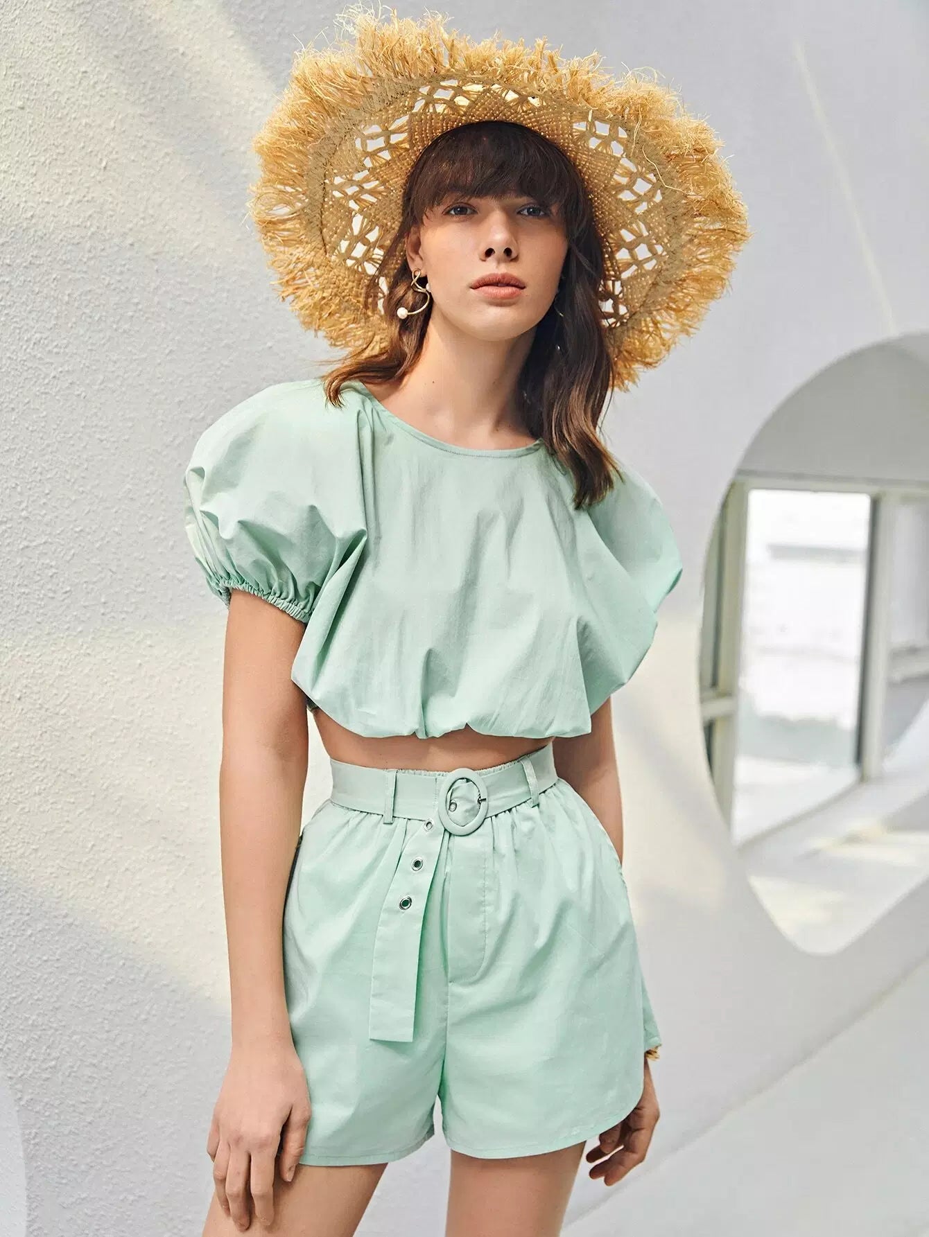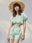 طقم توب قصير بأكمام منتفخة وسروال قصير بدون حزام