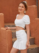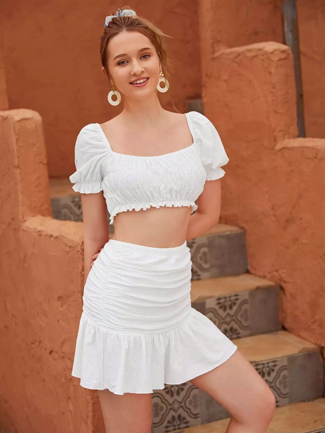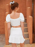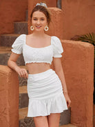 طقم بلوزة قصيرة بأكمام منفوشة بأكمام منفوشة وتنورة قصيرة منفوشة