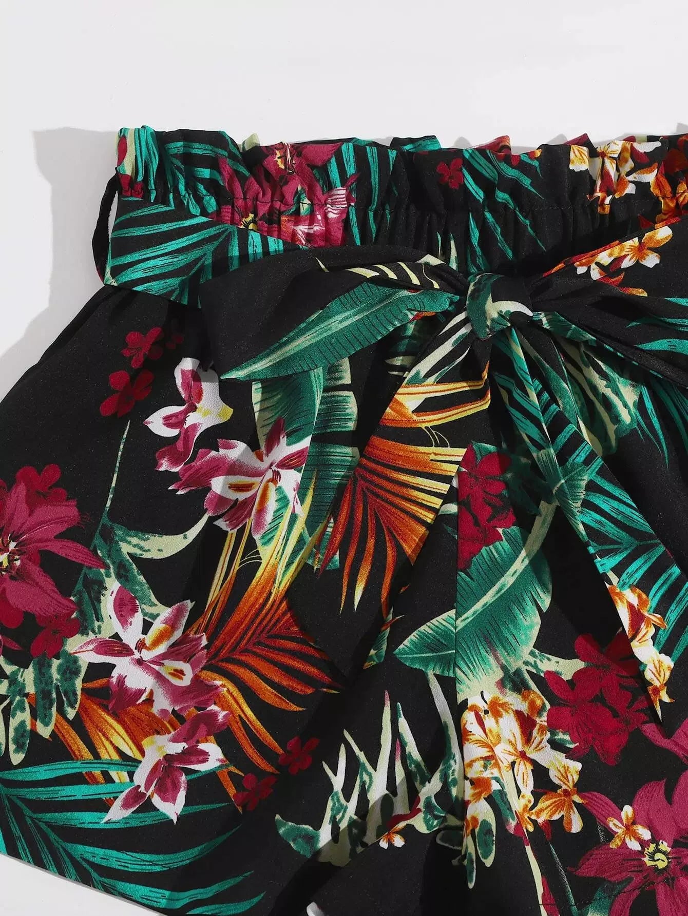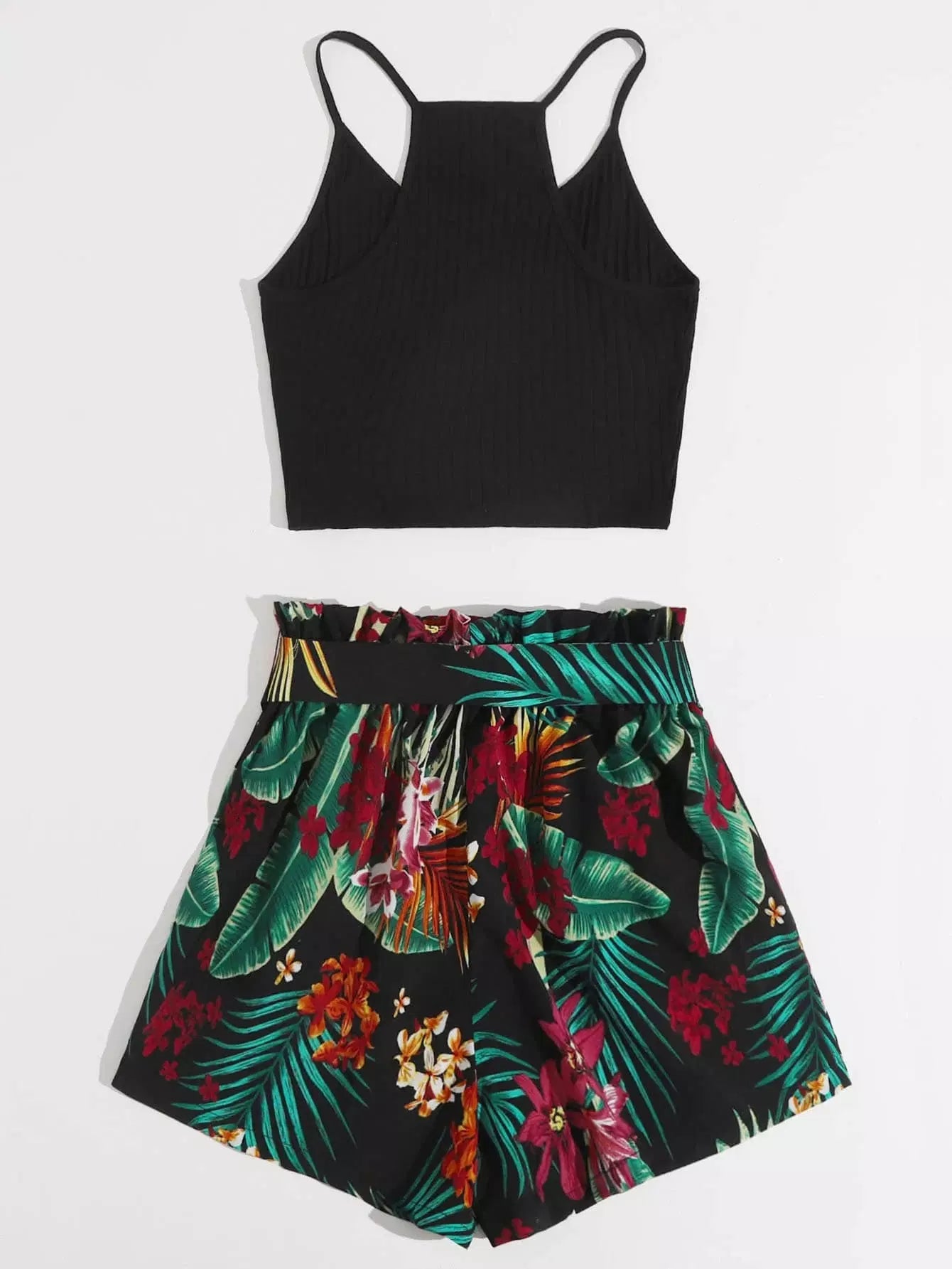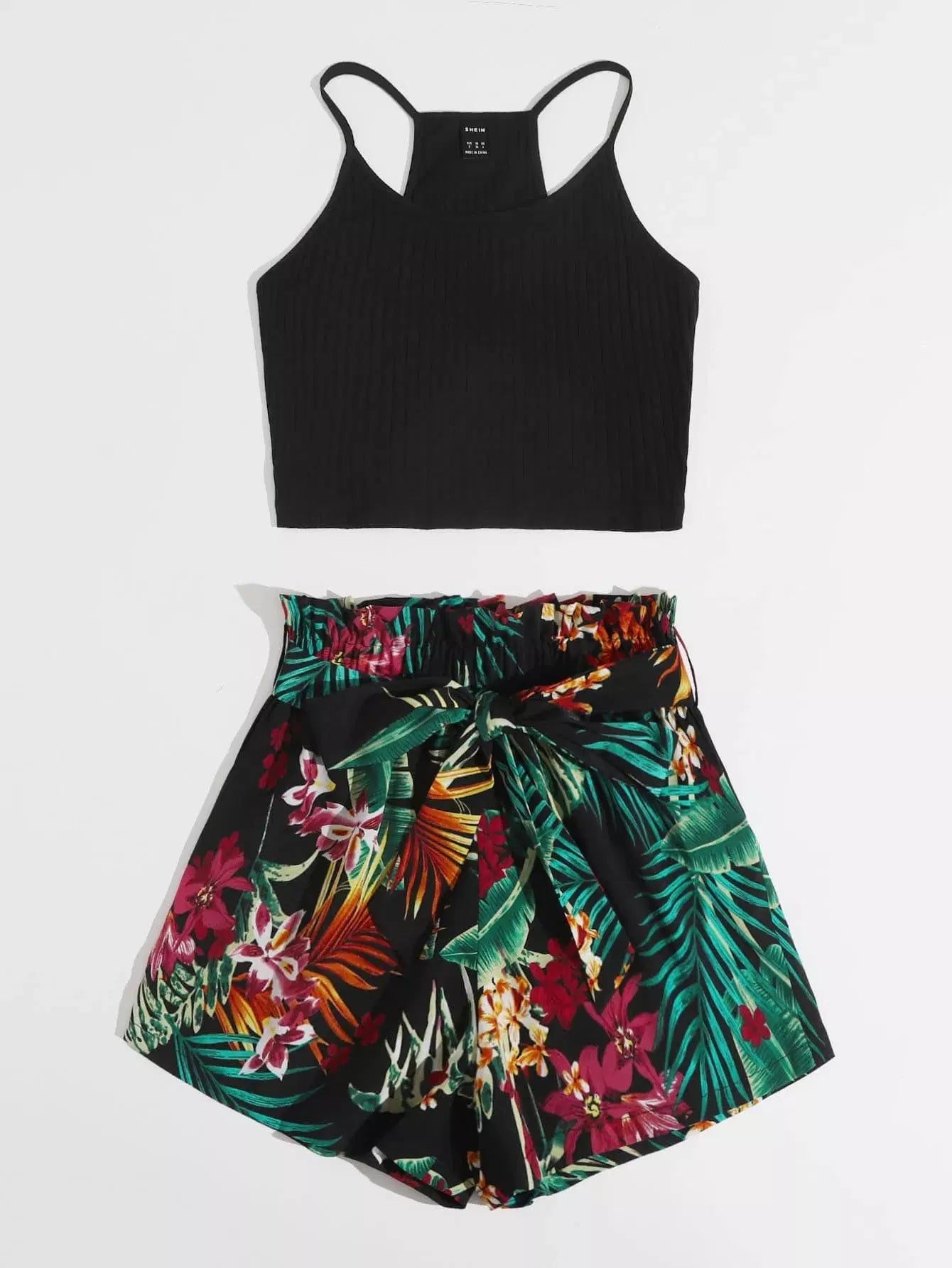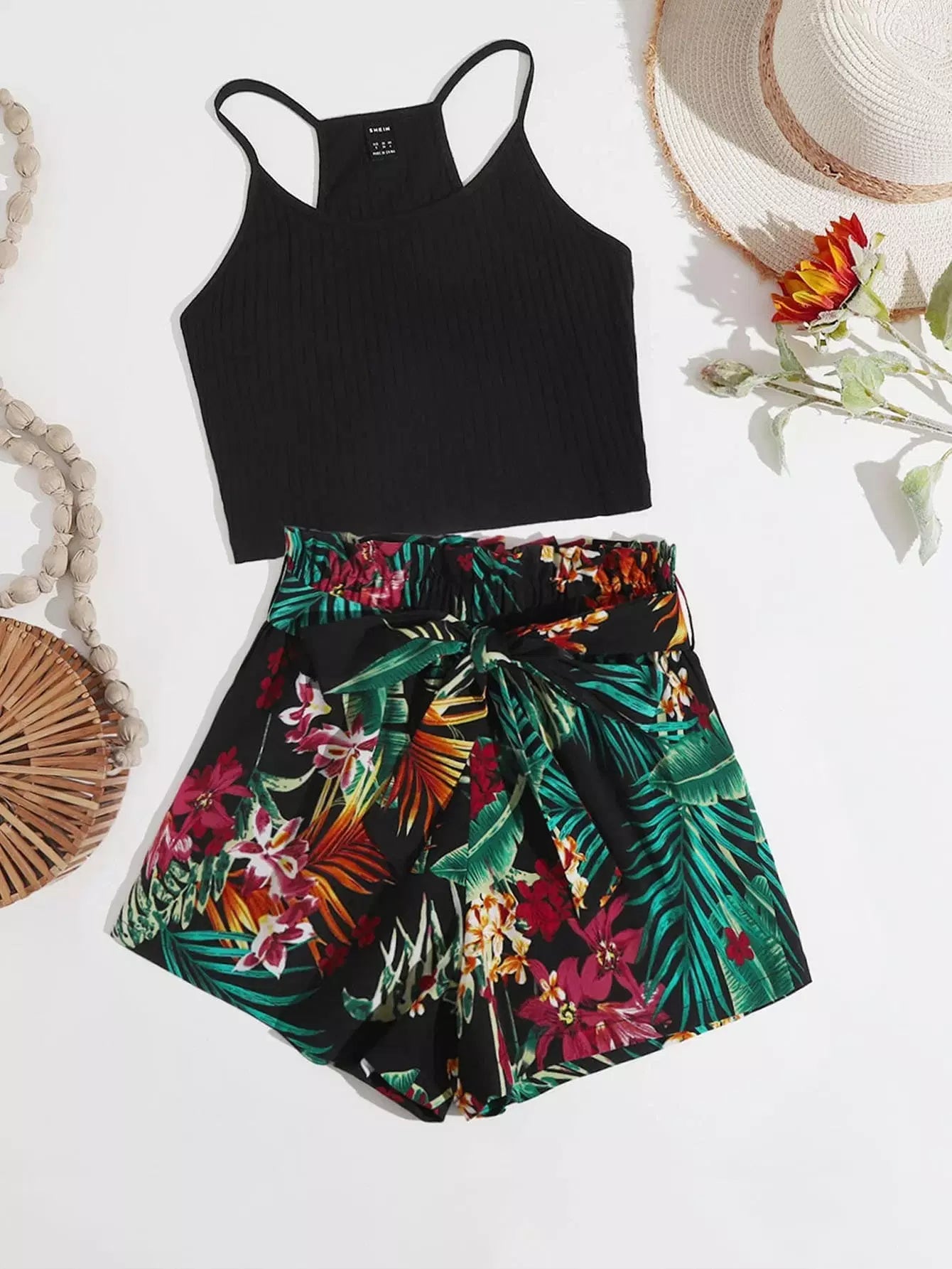 طقم قميص كامي متماسك وسروال قصير للخصر بدون حزام