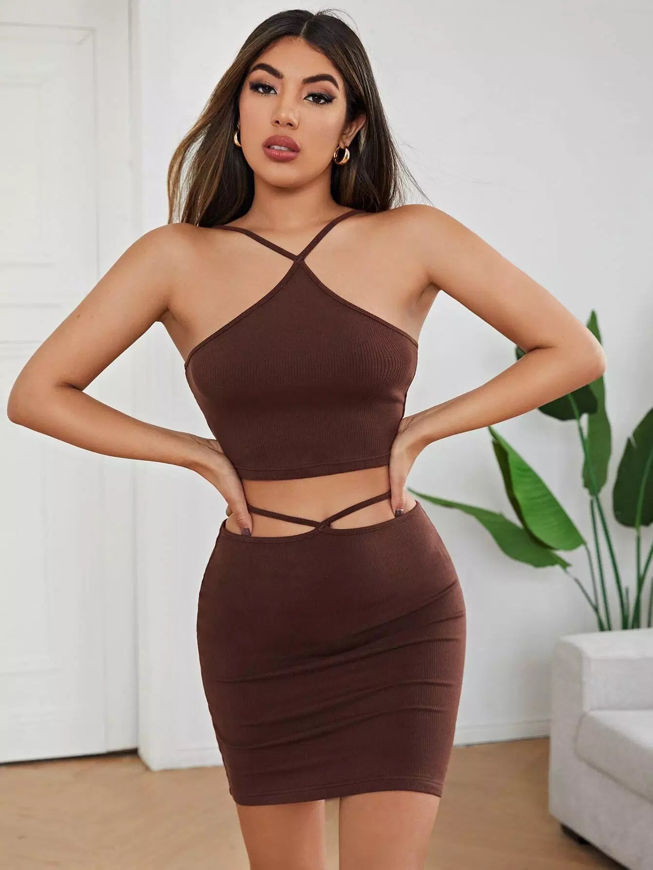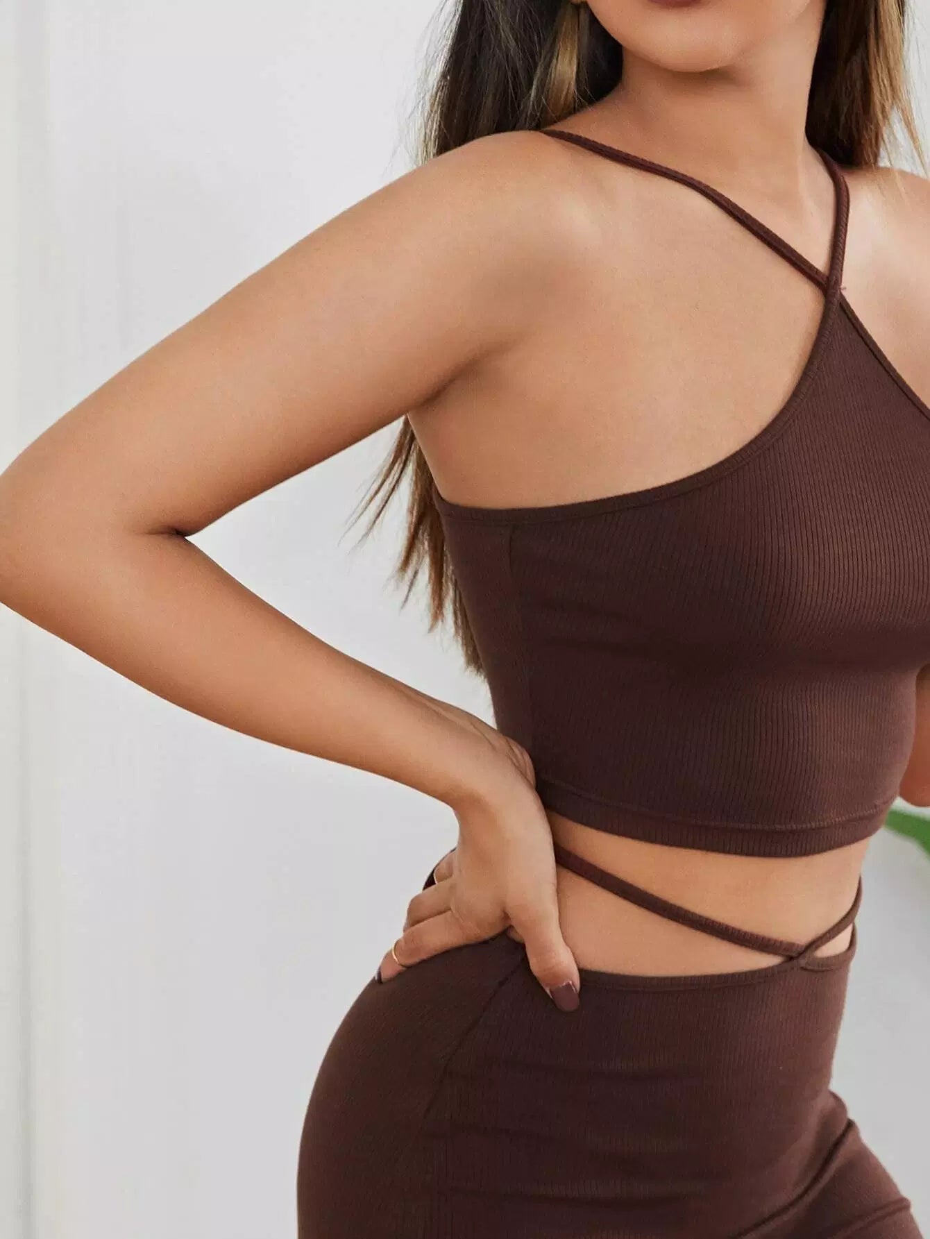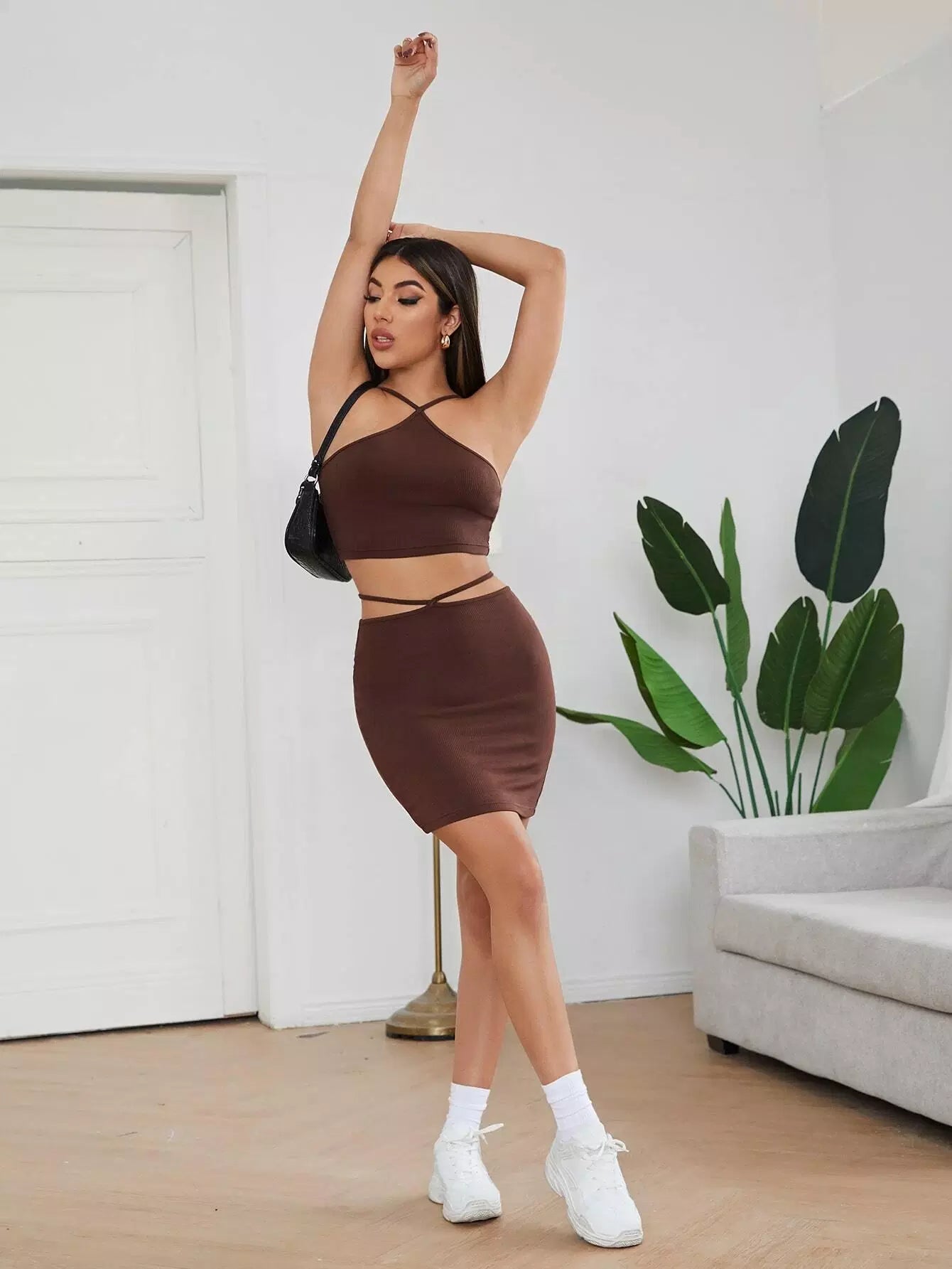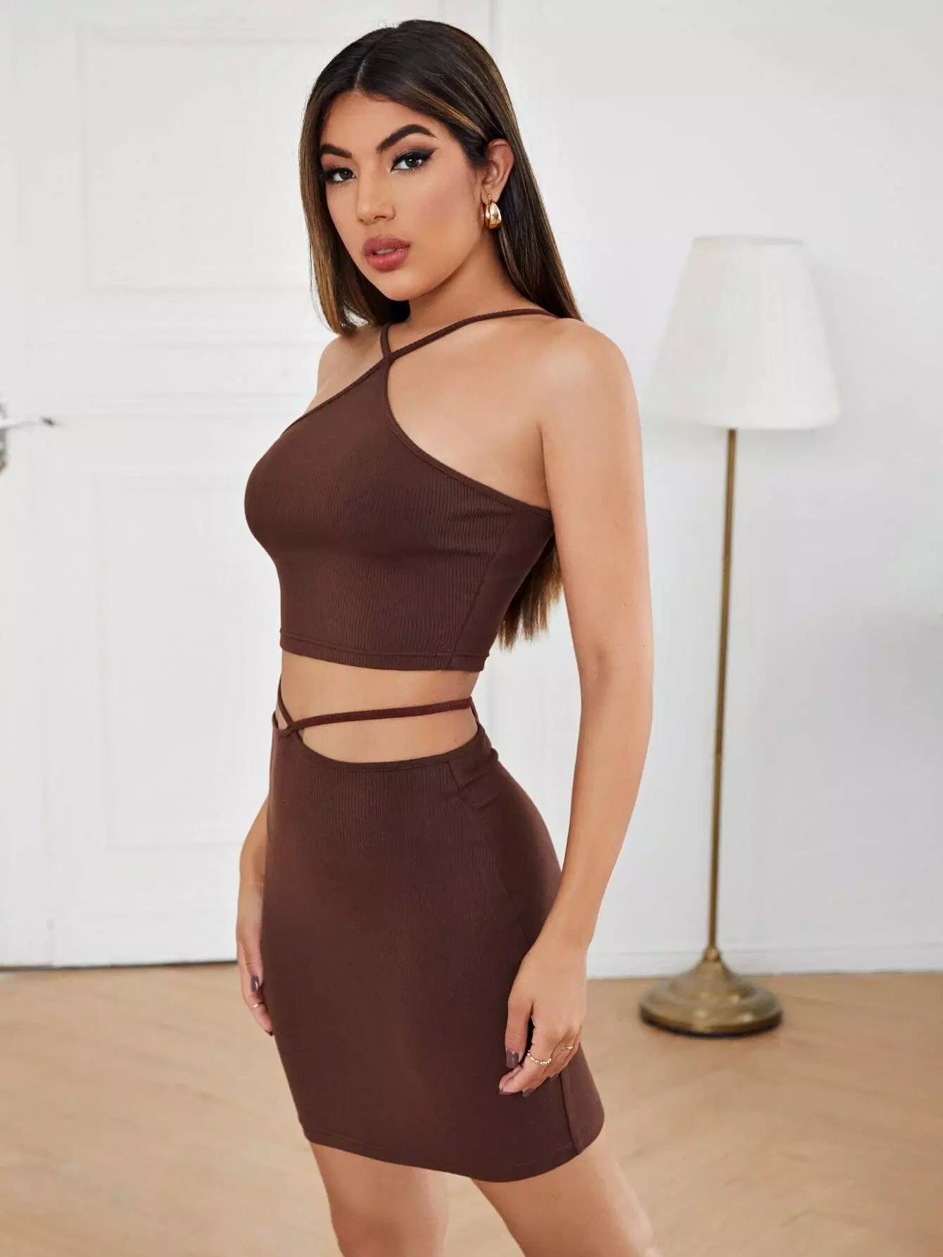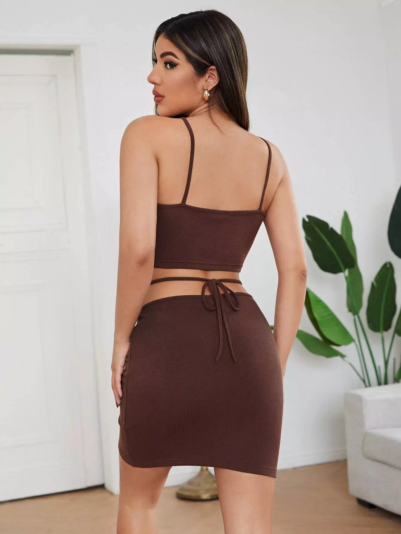 طقم بلوزة محبوكة على شكل ضلع محبوكة على شكل رسن وتنورة دانتيل من الخلف