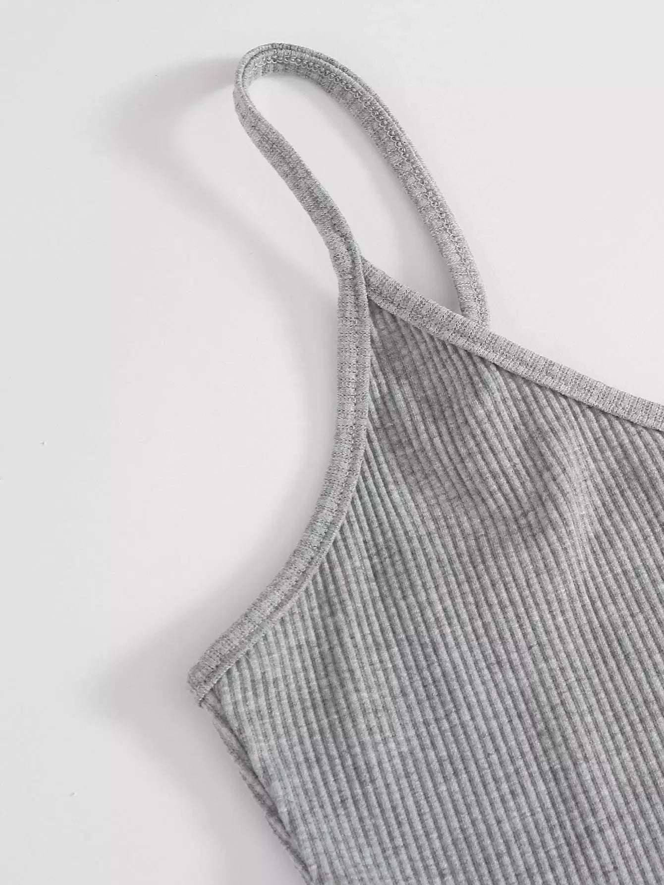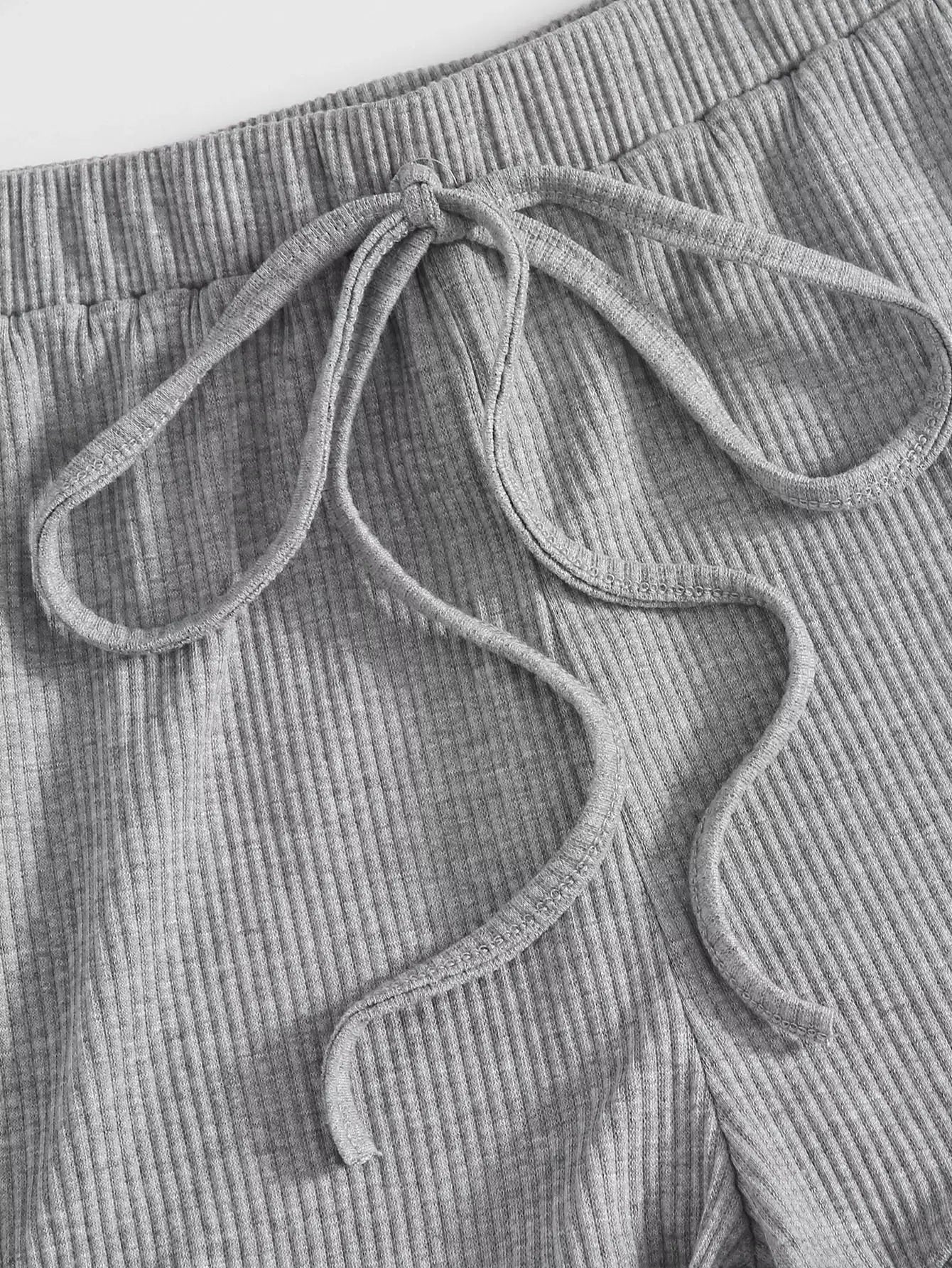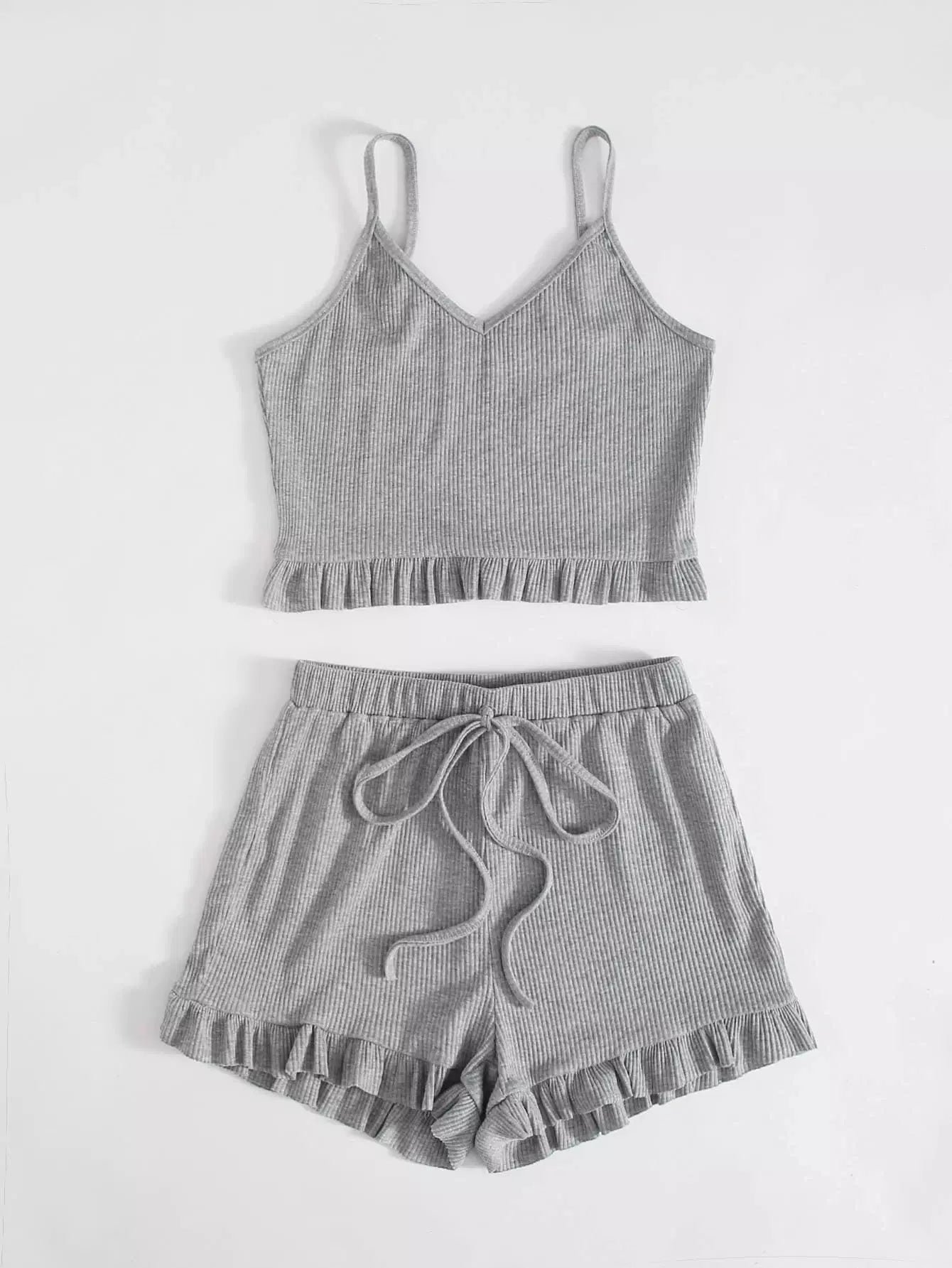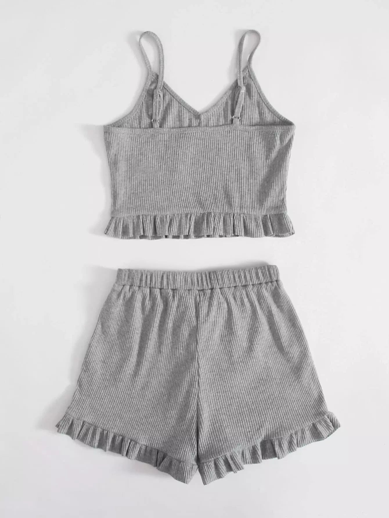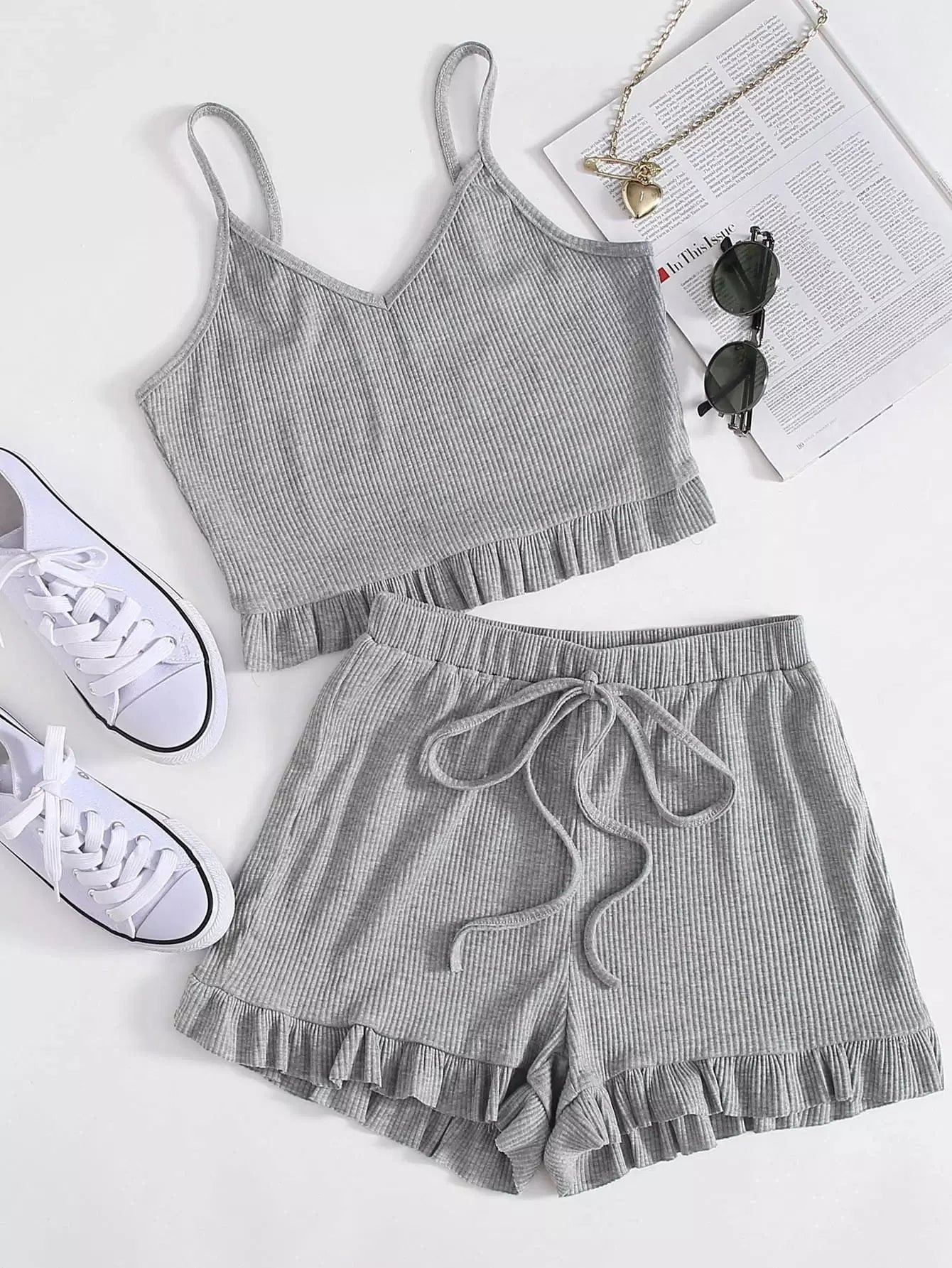 بلوزة كامي بحافة مكشكشة محبوكة على شكل ضلع وشورت قصير