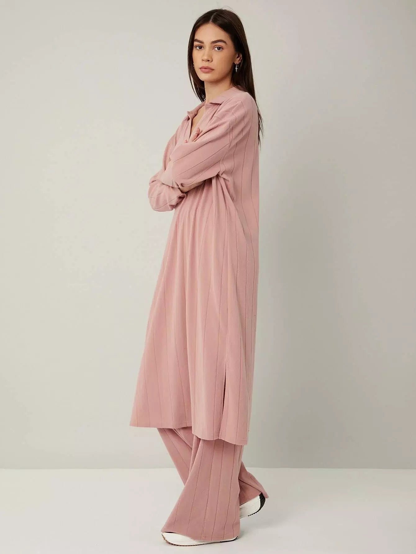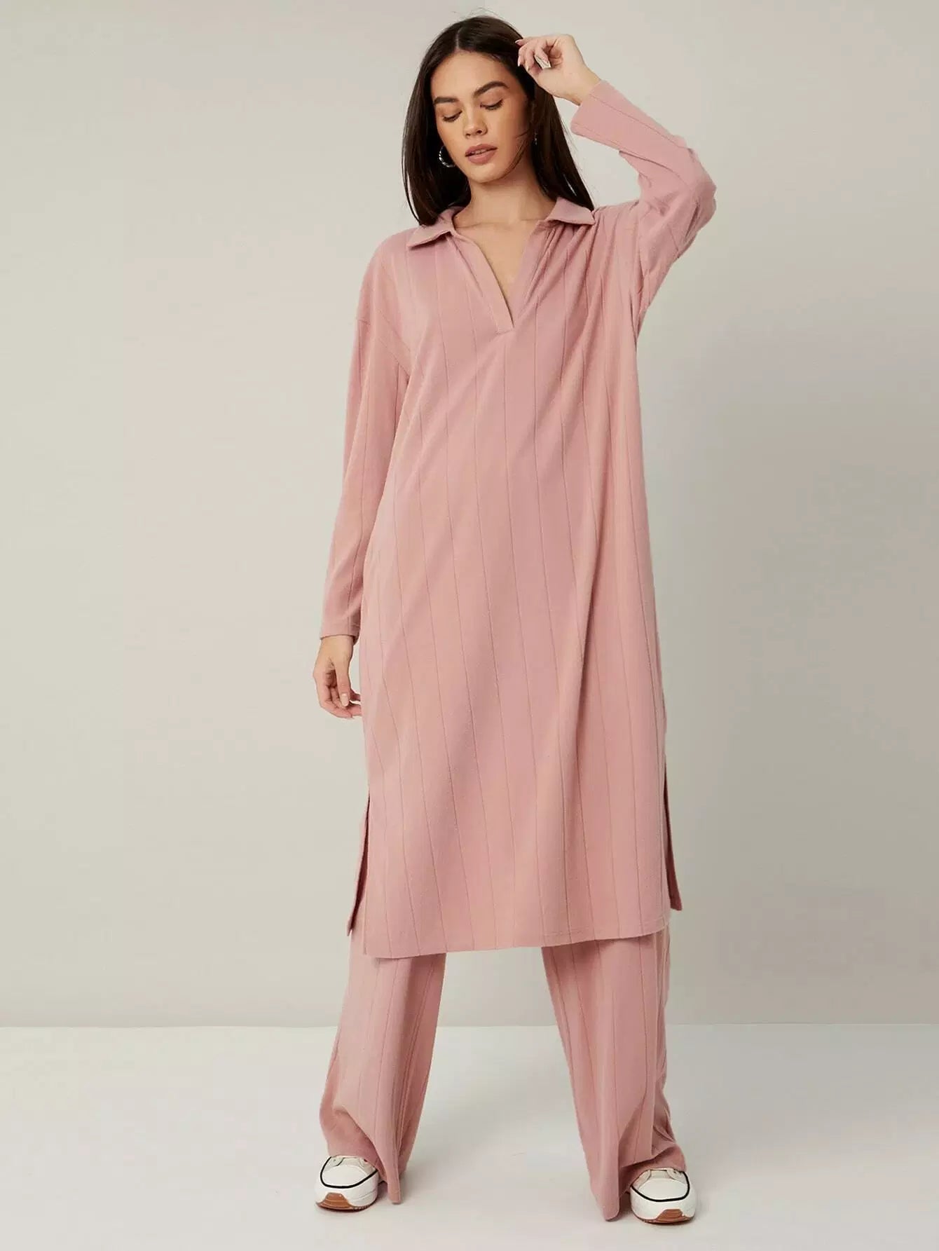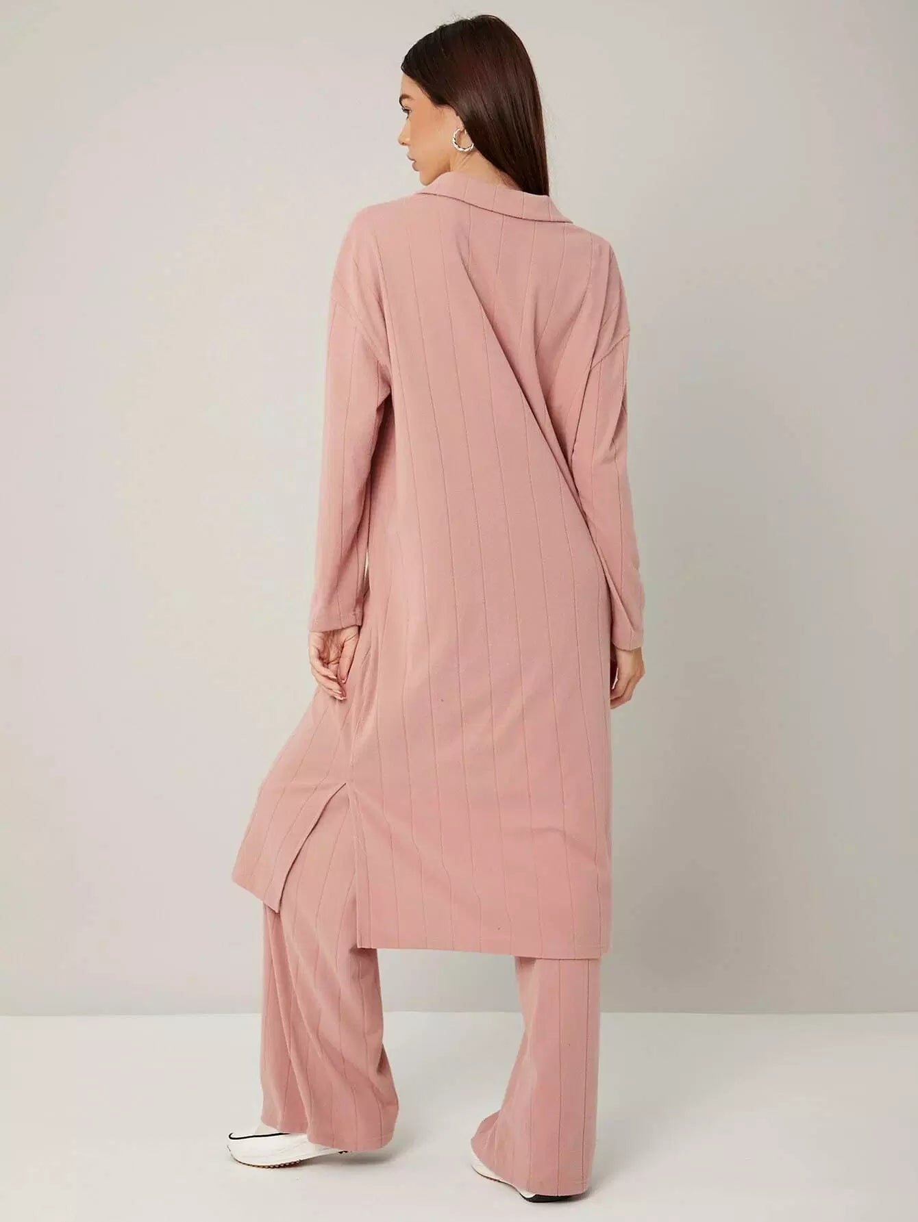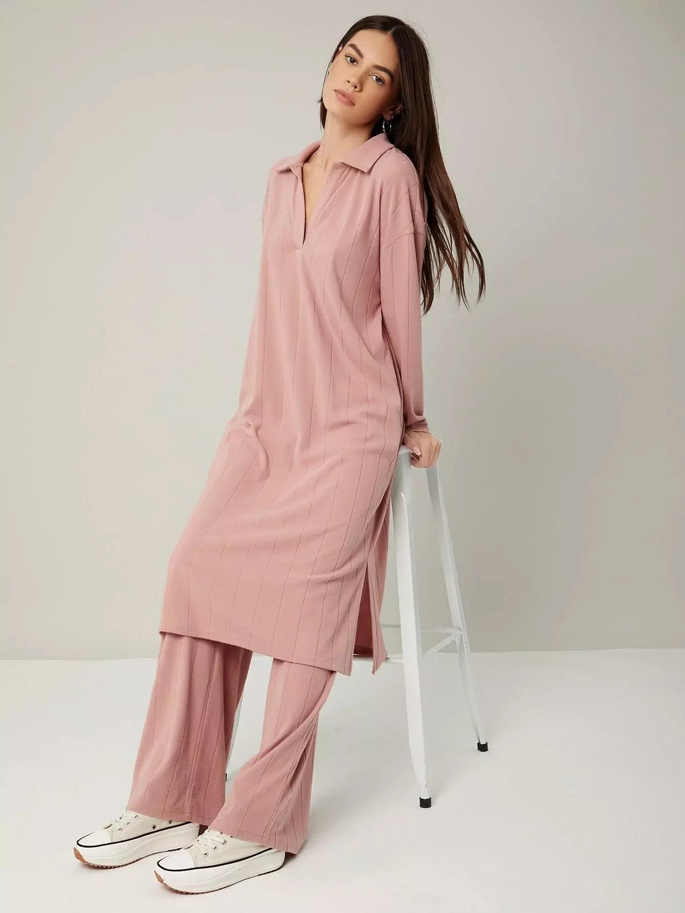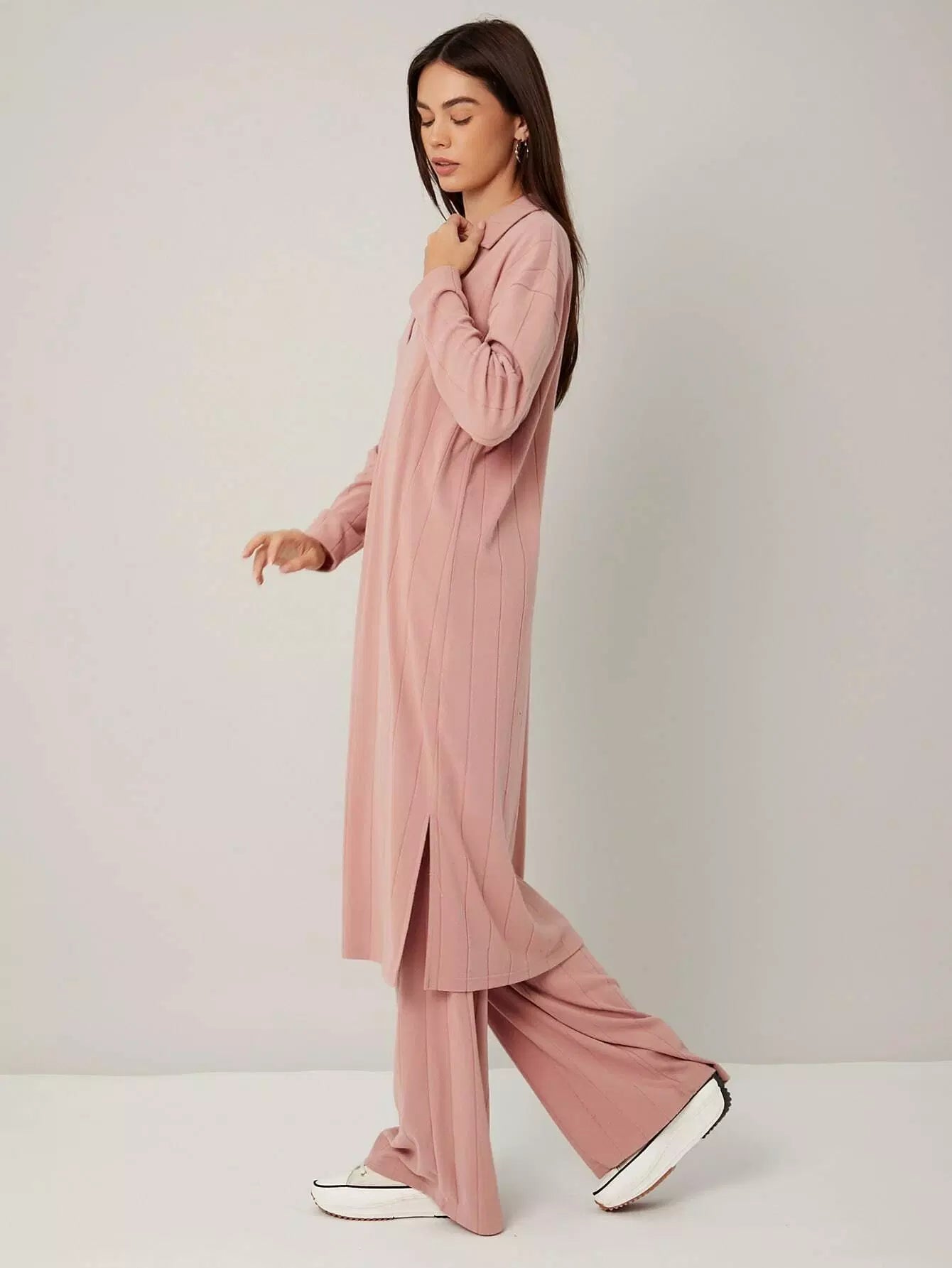 طقم بلوزة وبنطلون بحاشية ضلعية محبوكة بحافة منقسمة وطويلة