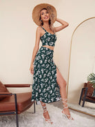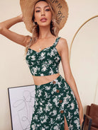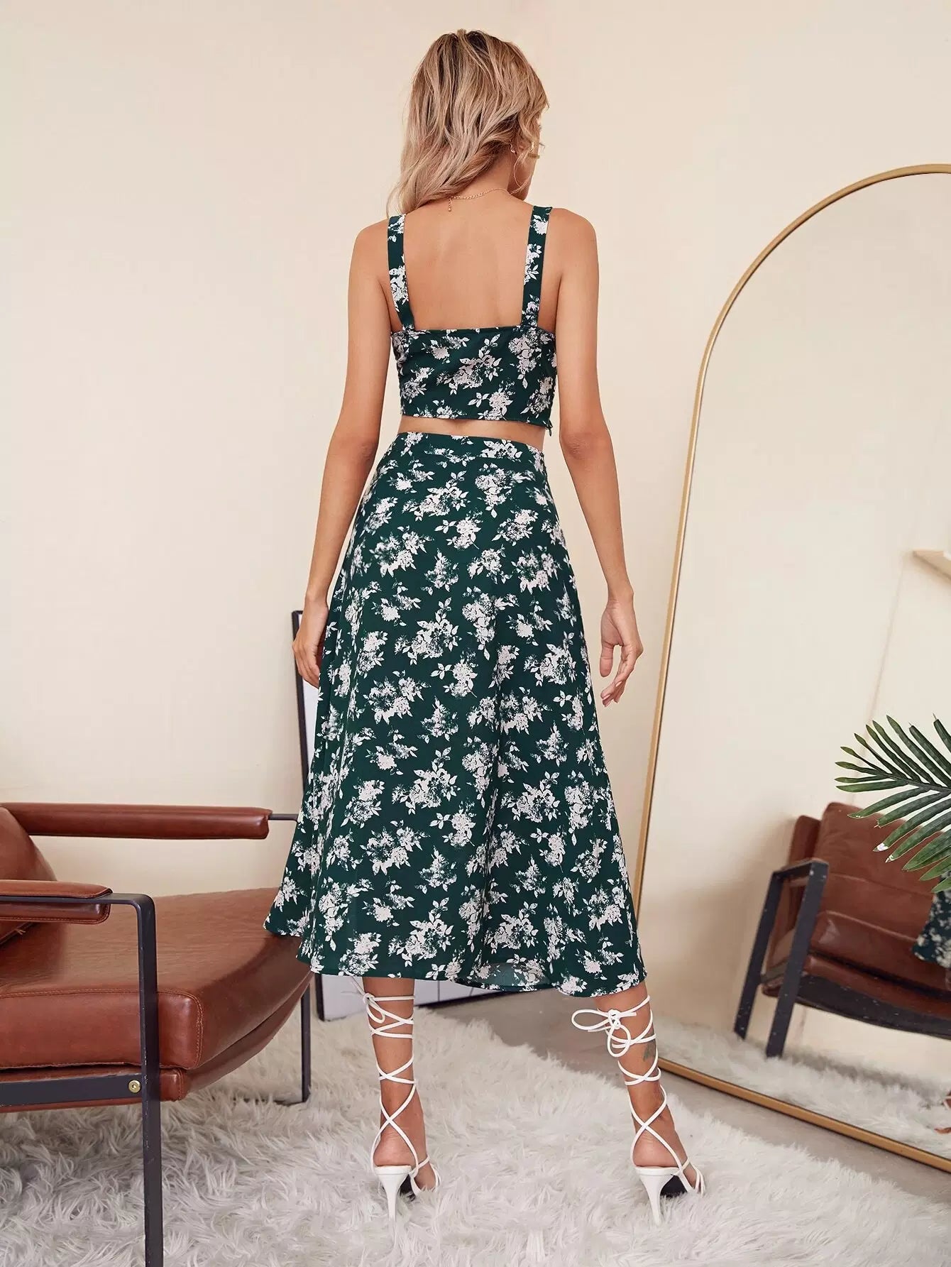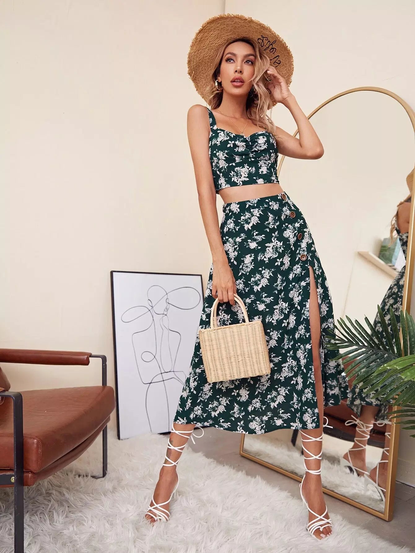 طقم بلوزة زهرية مكشكشة عند الصدر وتنورة فخذين منقسمة