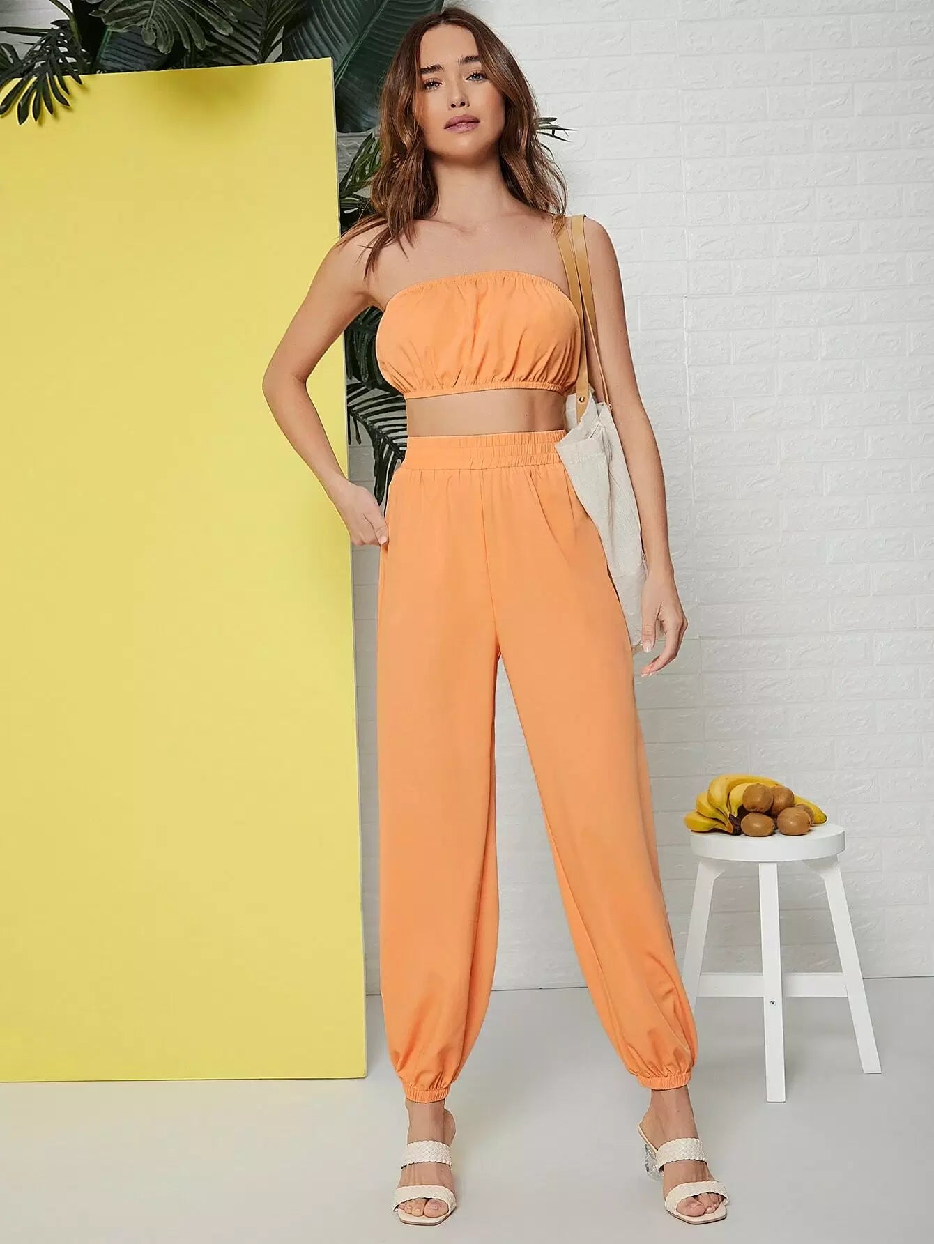 طقم توب وبنطال بفتحة صدر مكشكشة