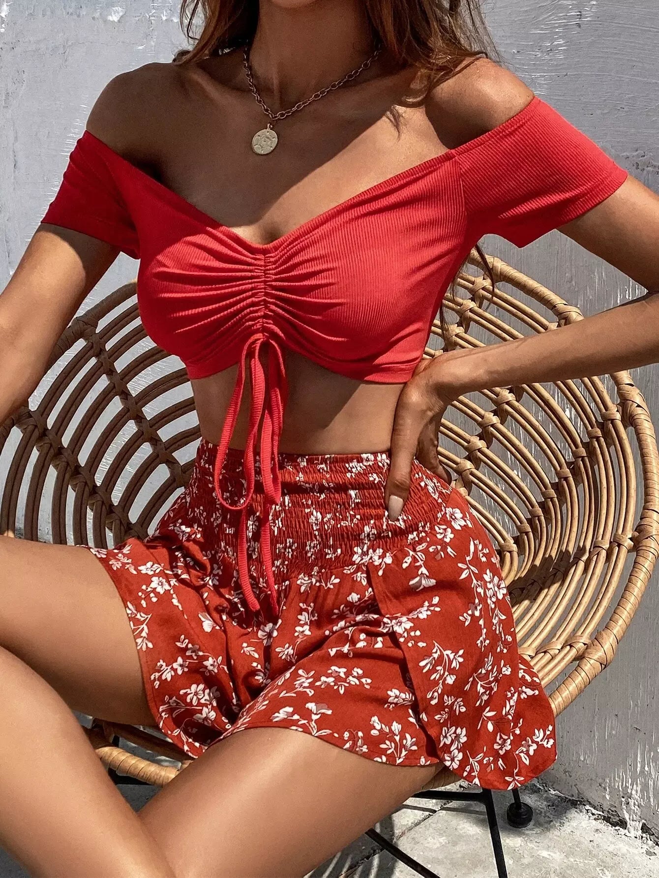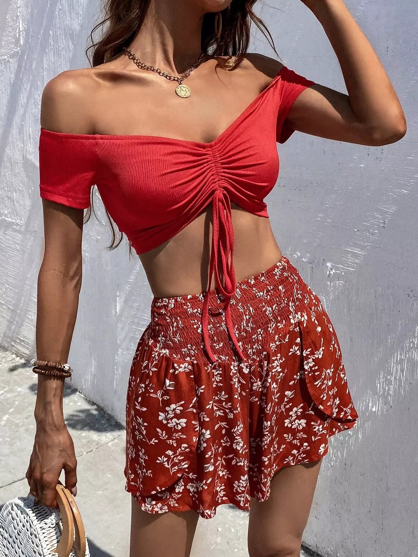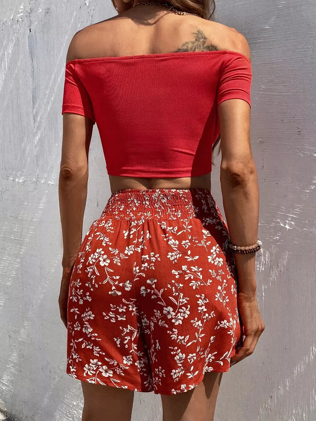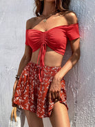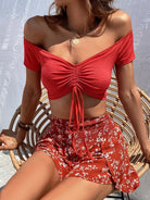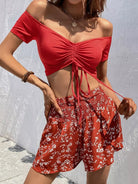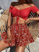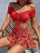 بلوزة برباط أمامي مكشكش برباط أمامي وشورت بطبعة زهور ديتسي