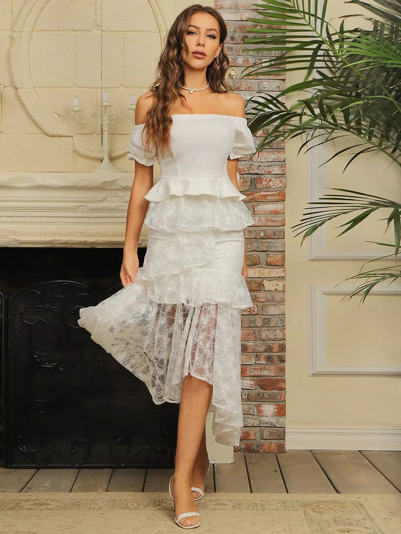طقم بلوزة باردو بحافة مكشكشة وتنورة بحافة من الدانتيل
