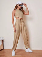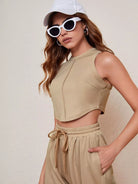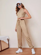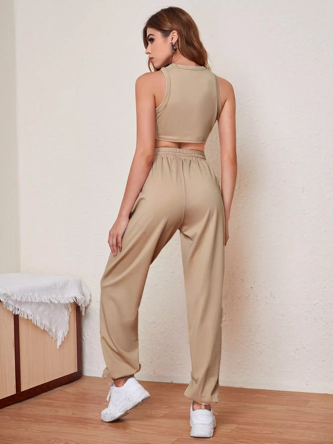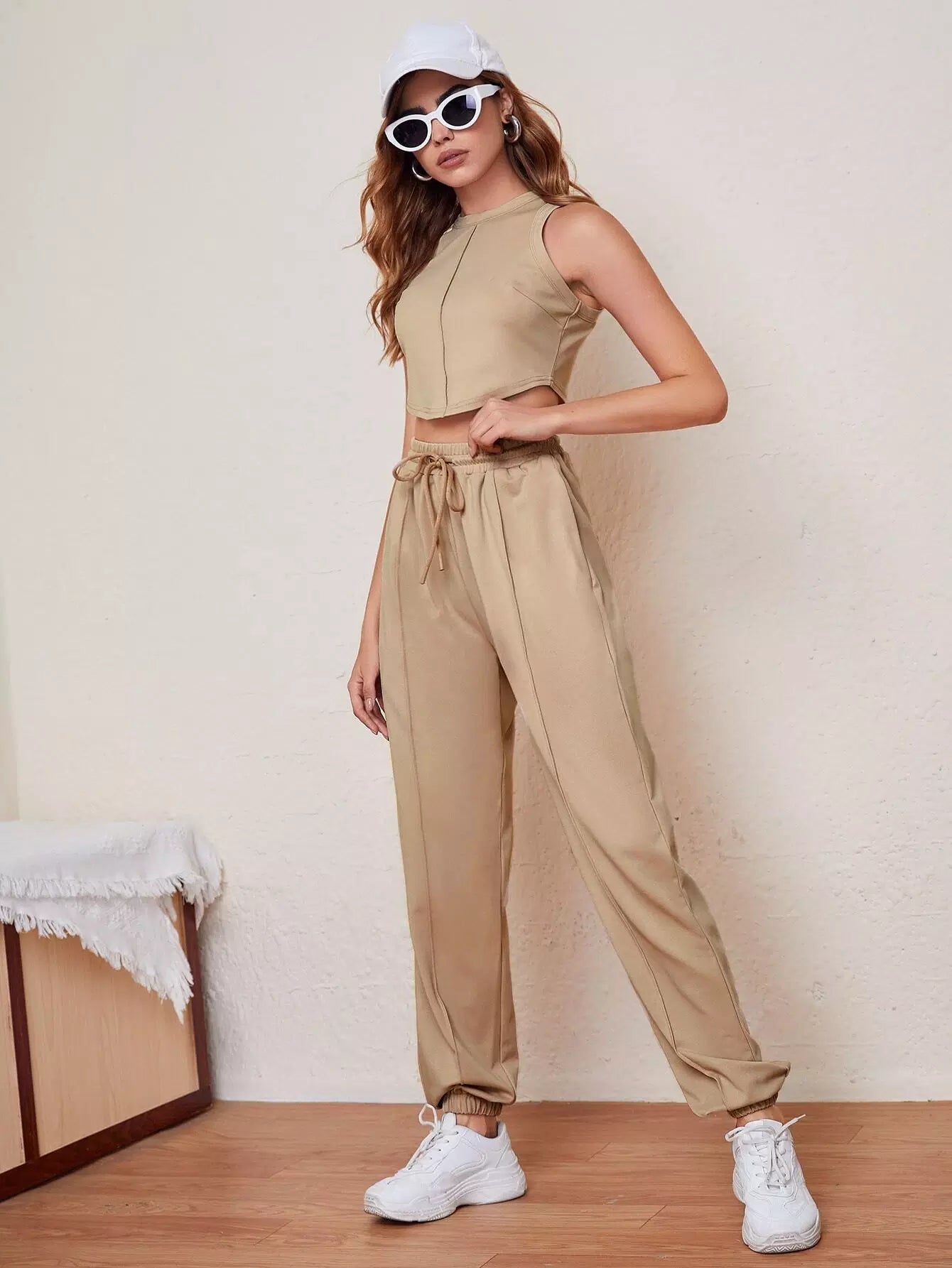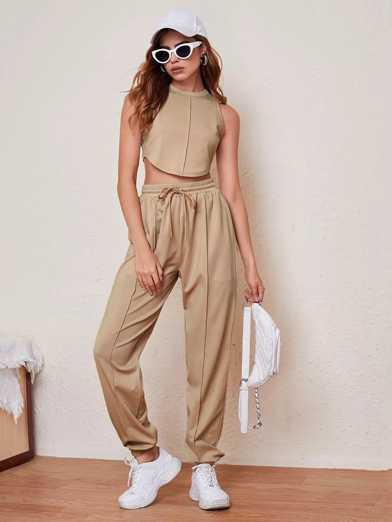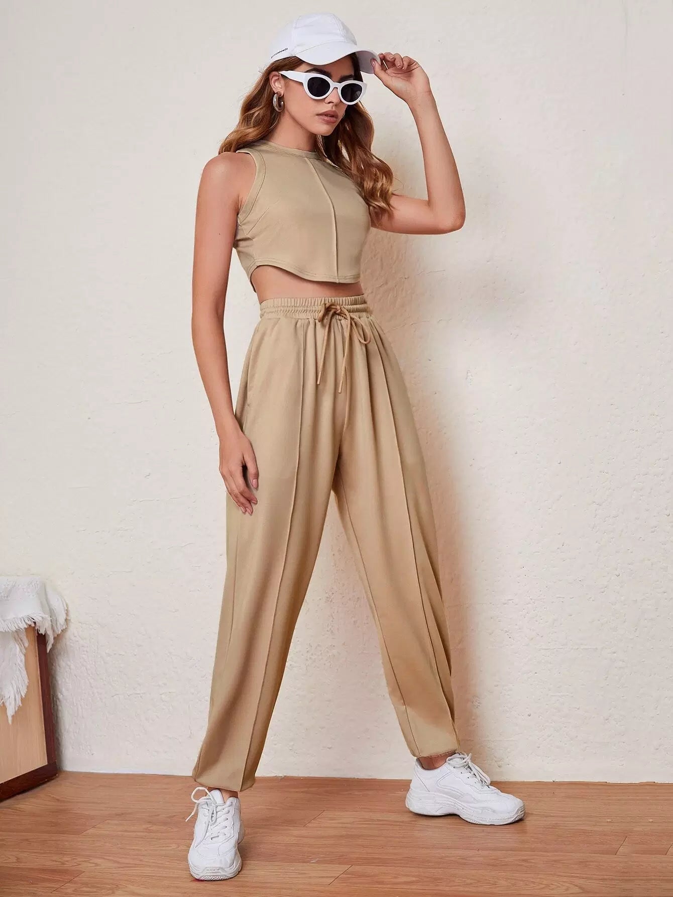 بلوزة بدون أكمام بتفاصيل درزات وبنطال رياضي بخصر مربوط
