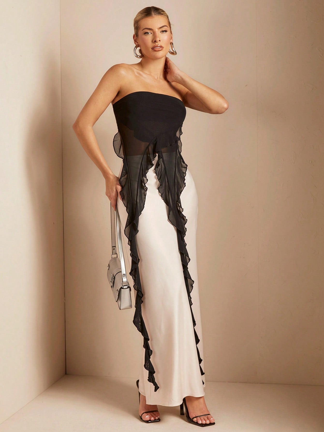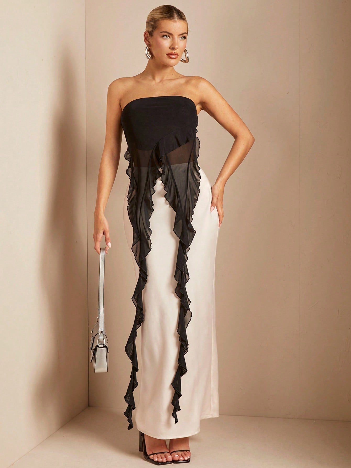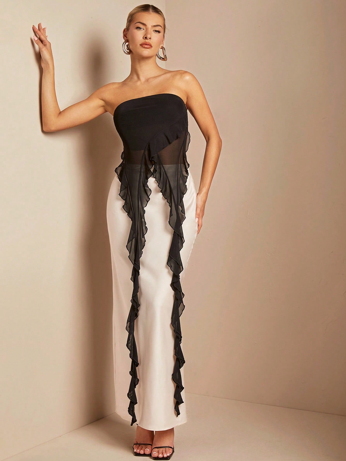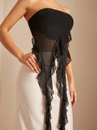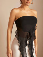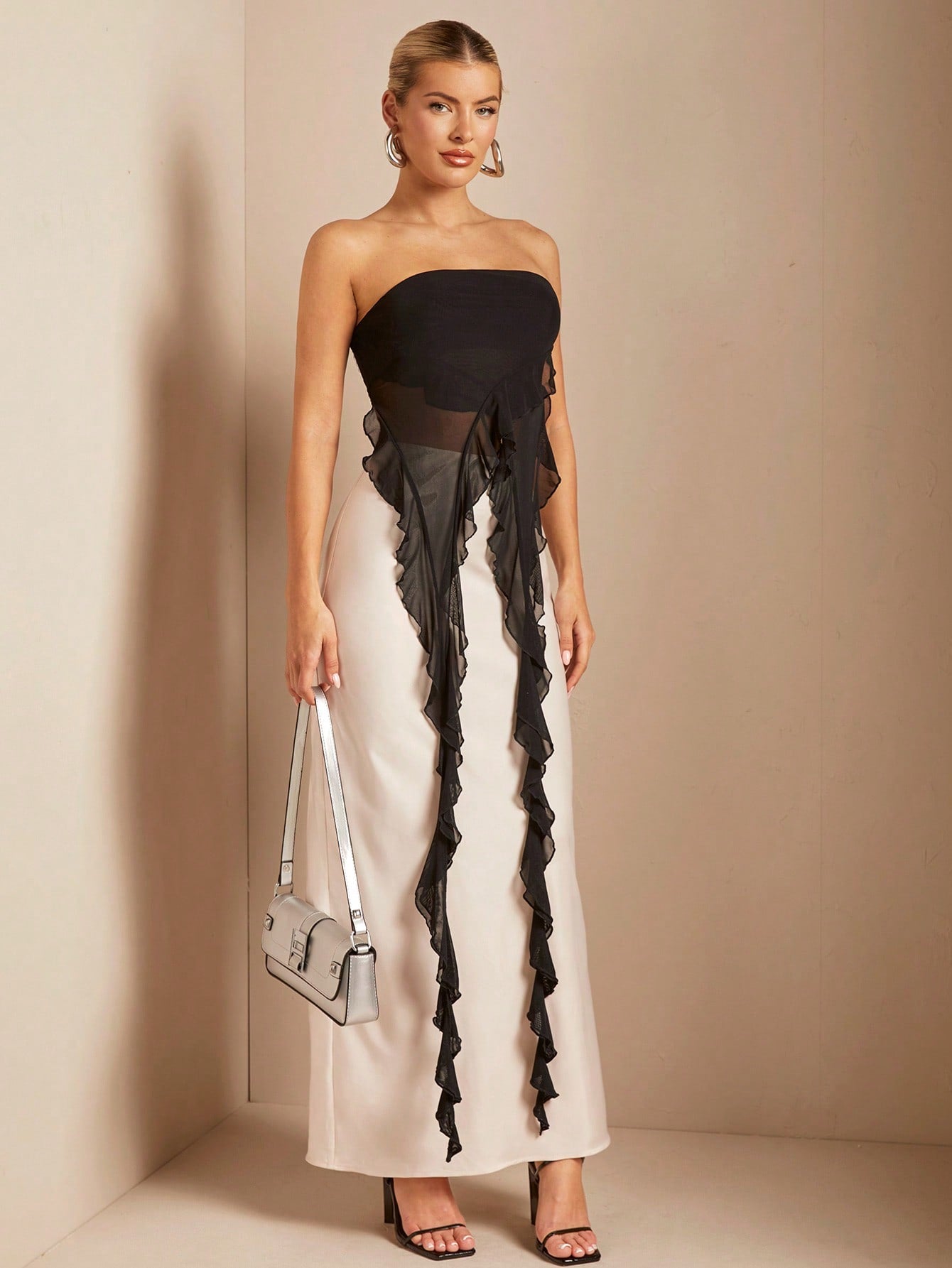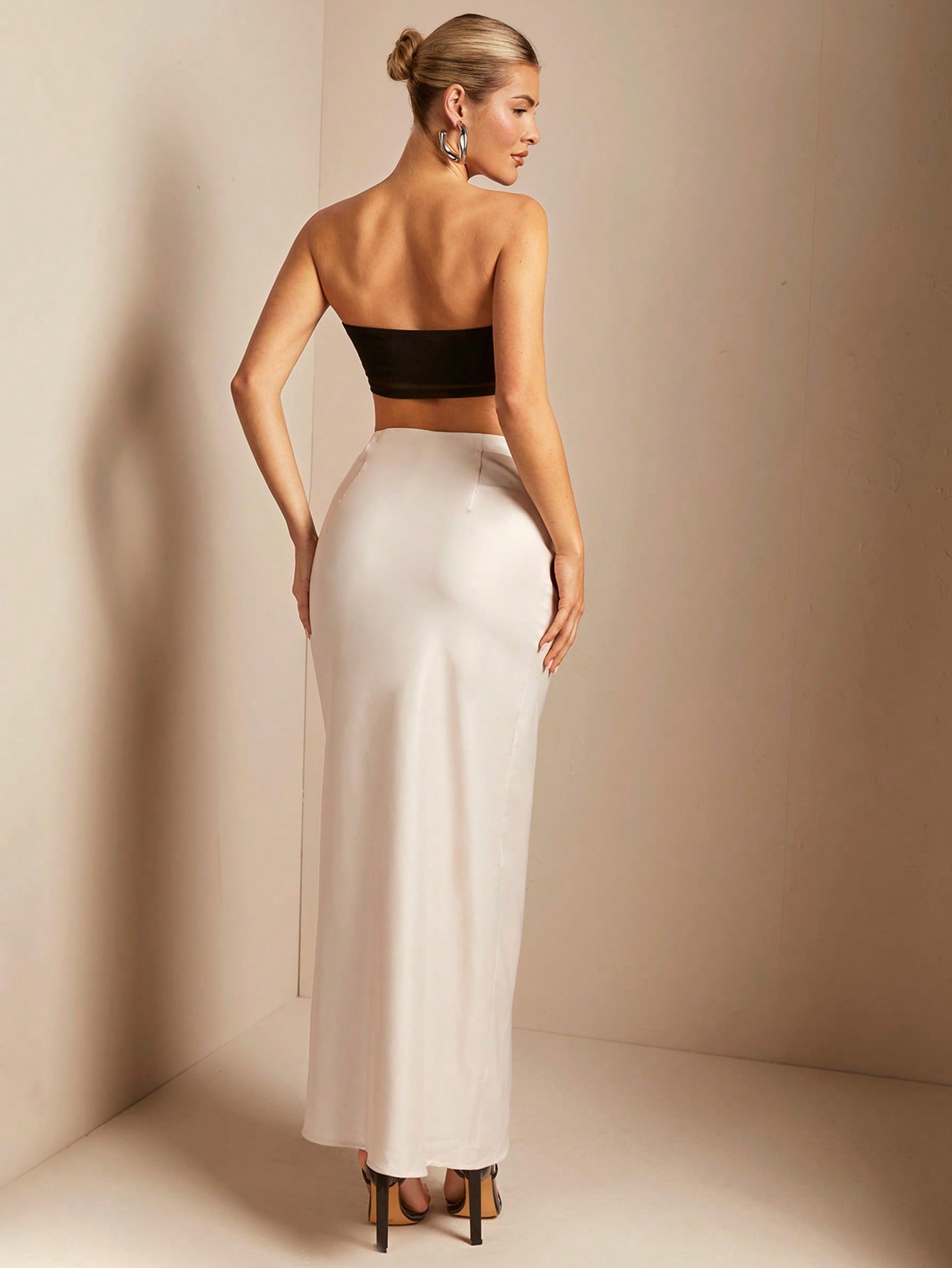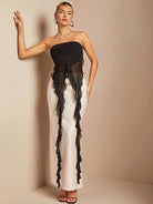 women SHEIN BAE Women's Ruffle Edge Asymmetric Hem Draping Bandeau Top With Straight Skirt Set