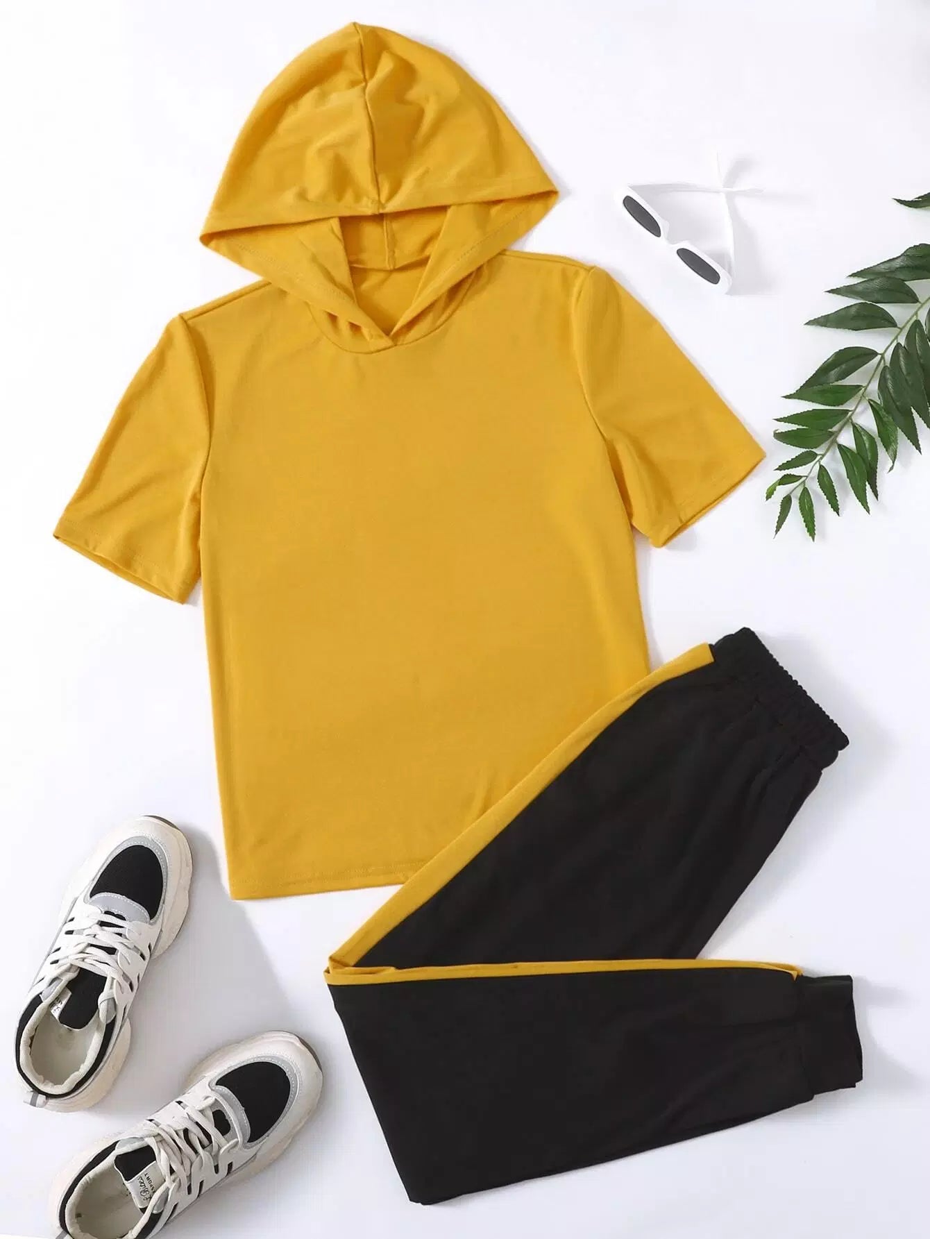 تي شيرت بأكمام قصيرة بغطاء للرأس وبنطال رياضي بغطاء جانبي