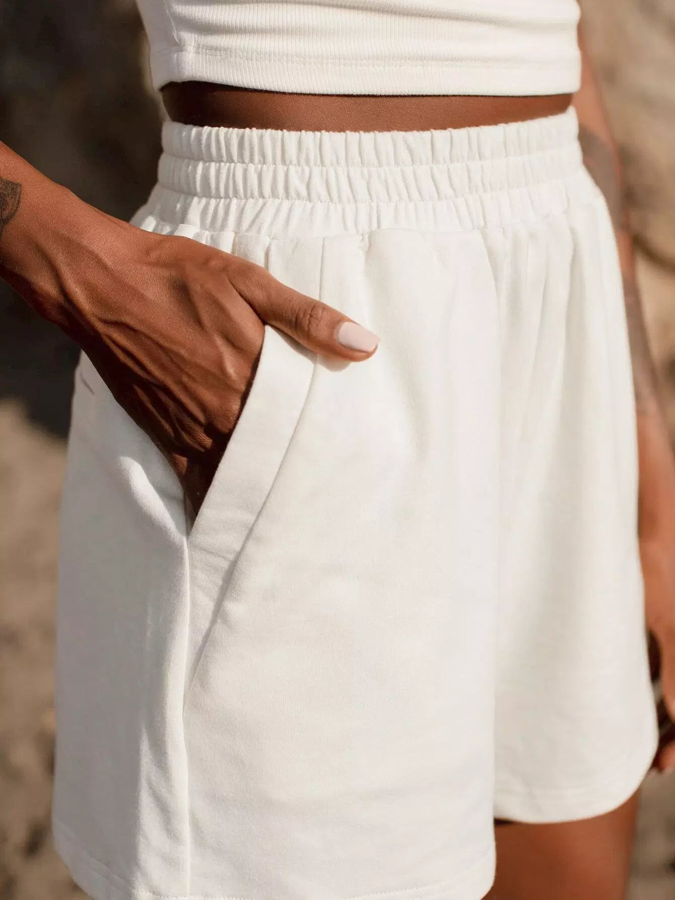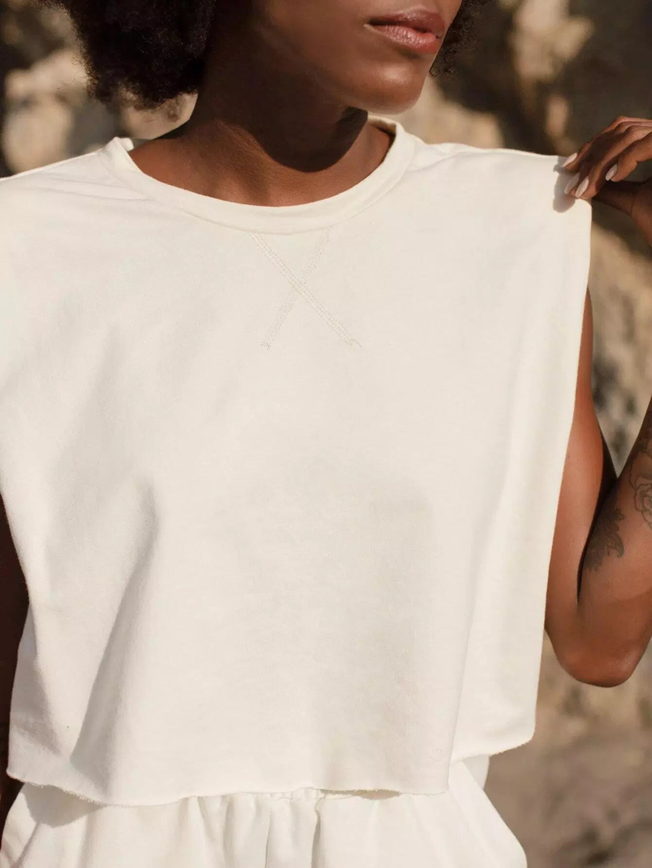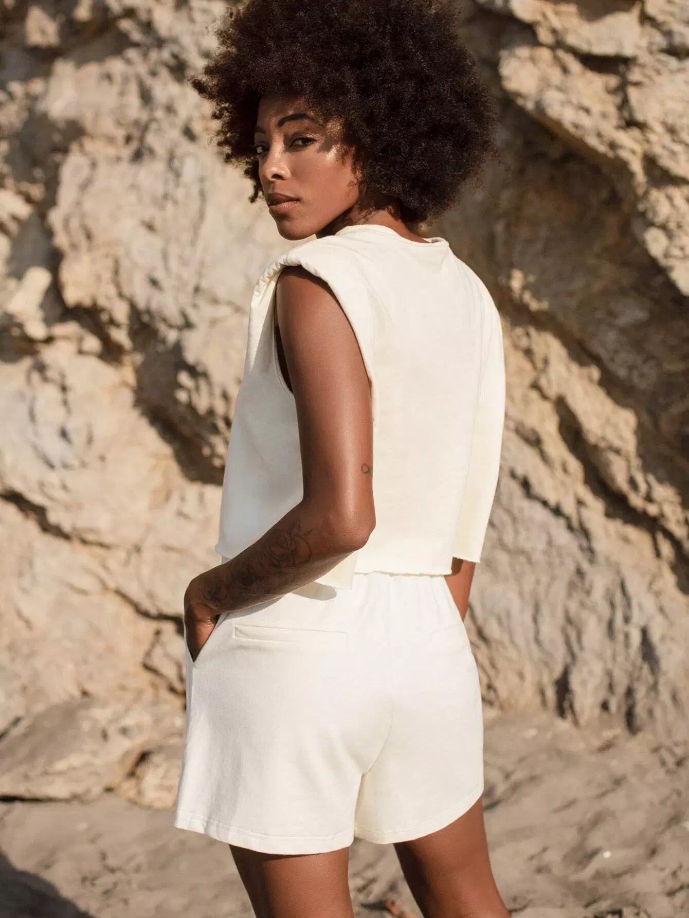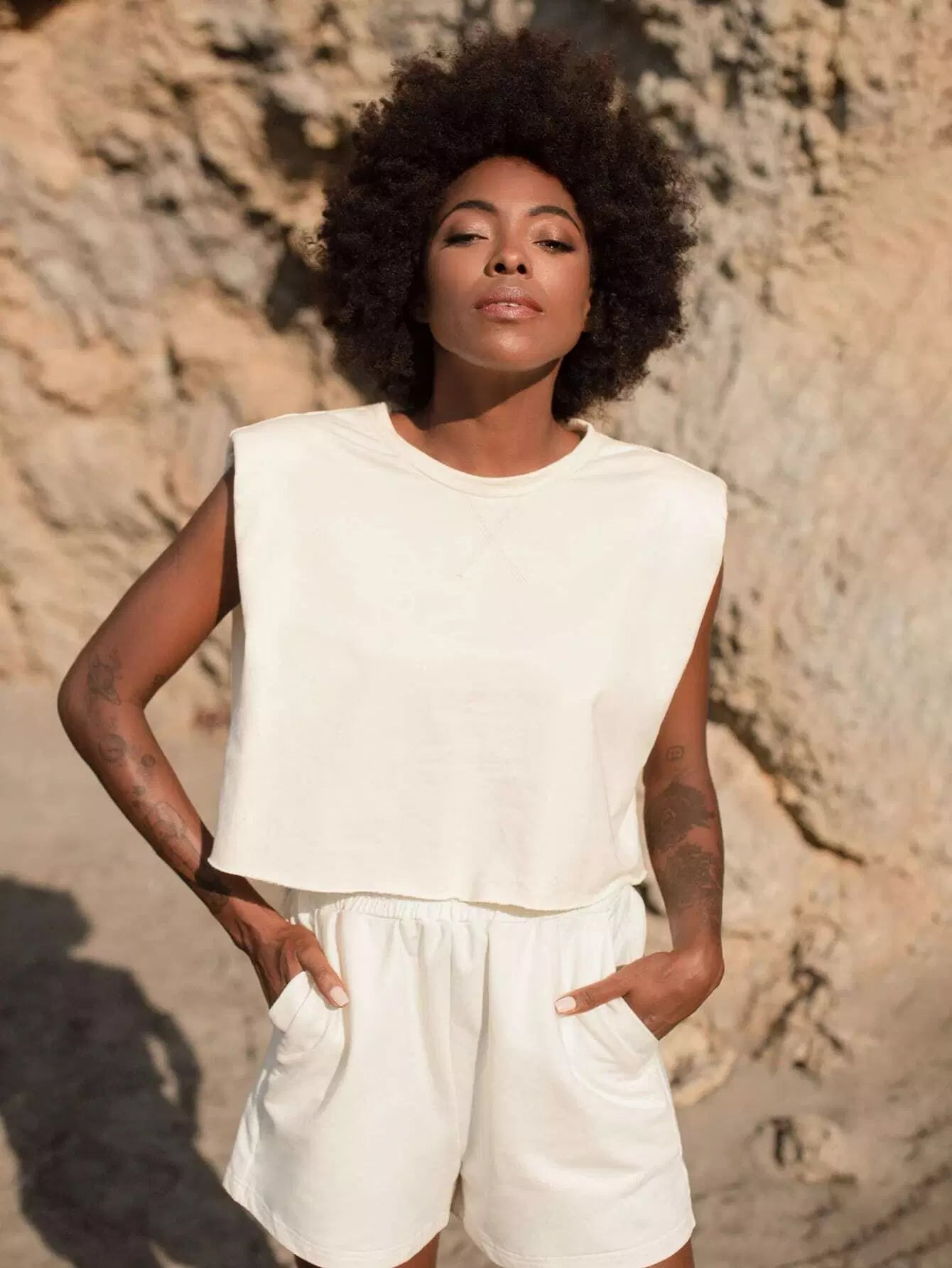 تانك قصير بدون أكتاف بغطاء للكتفين، وشورت قصير بجيب مائل