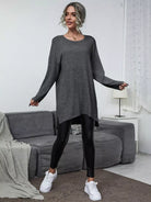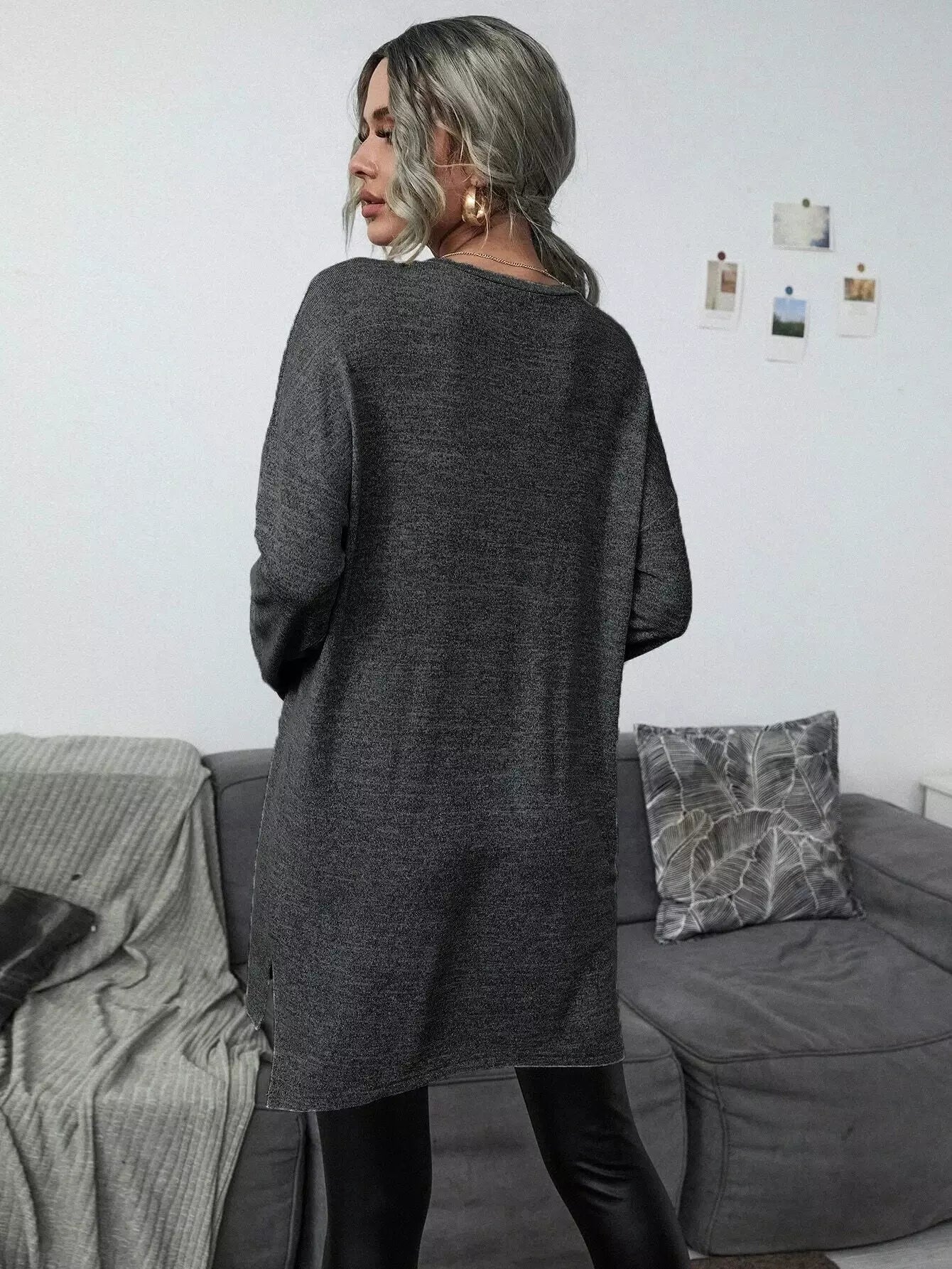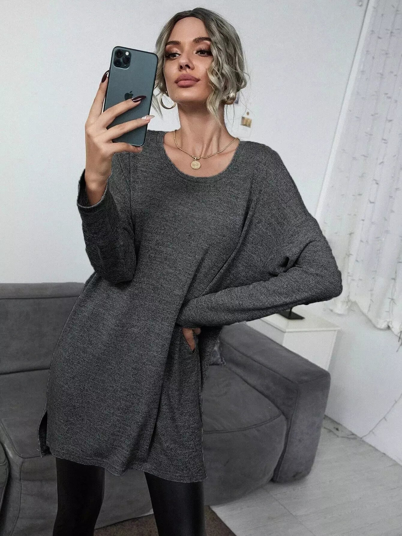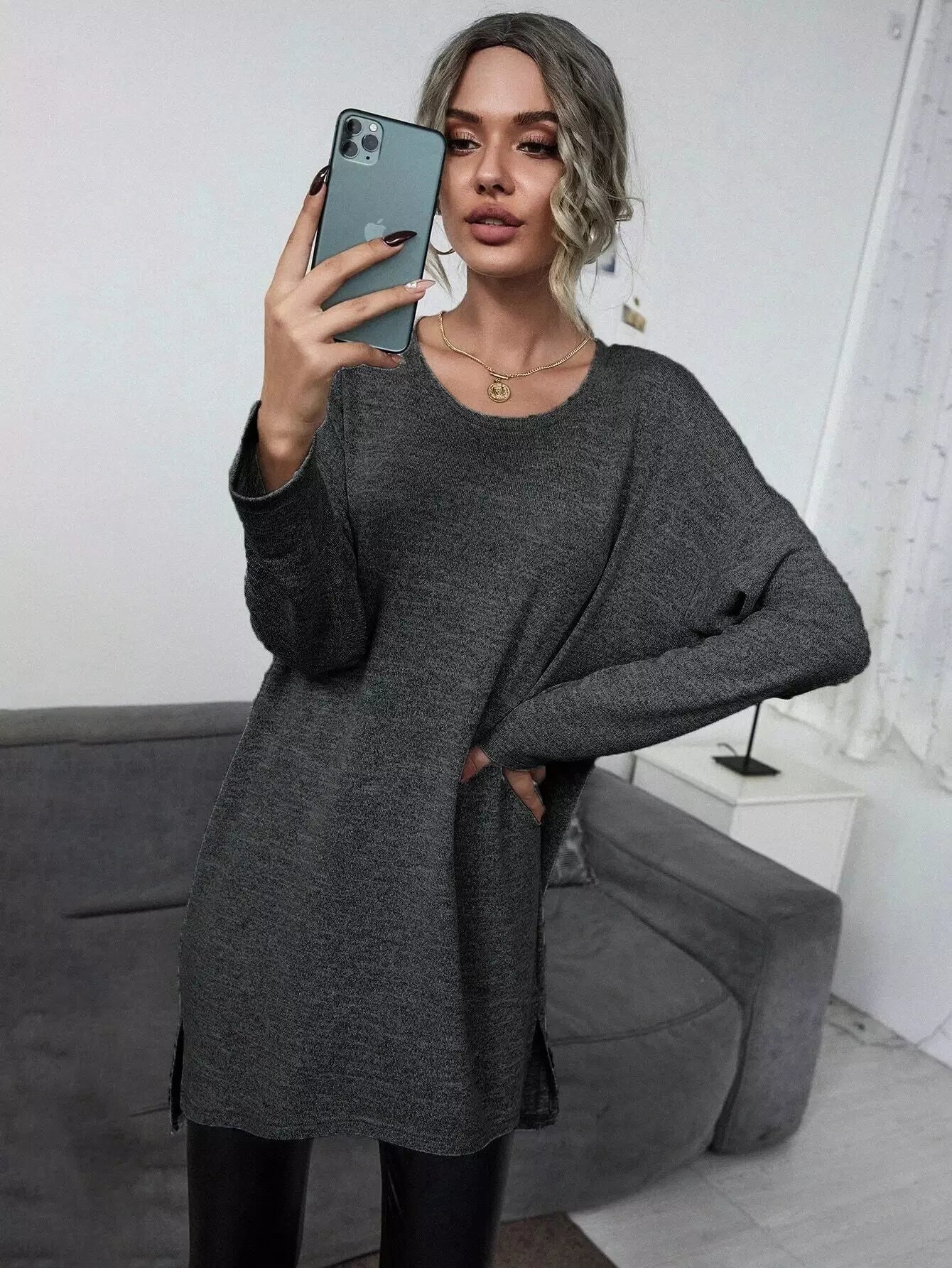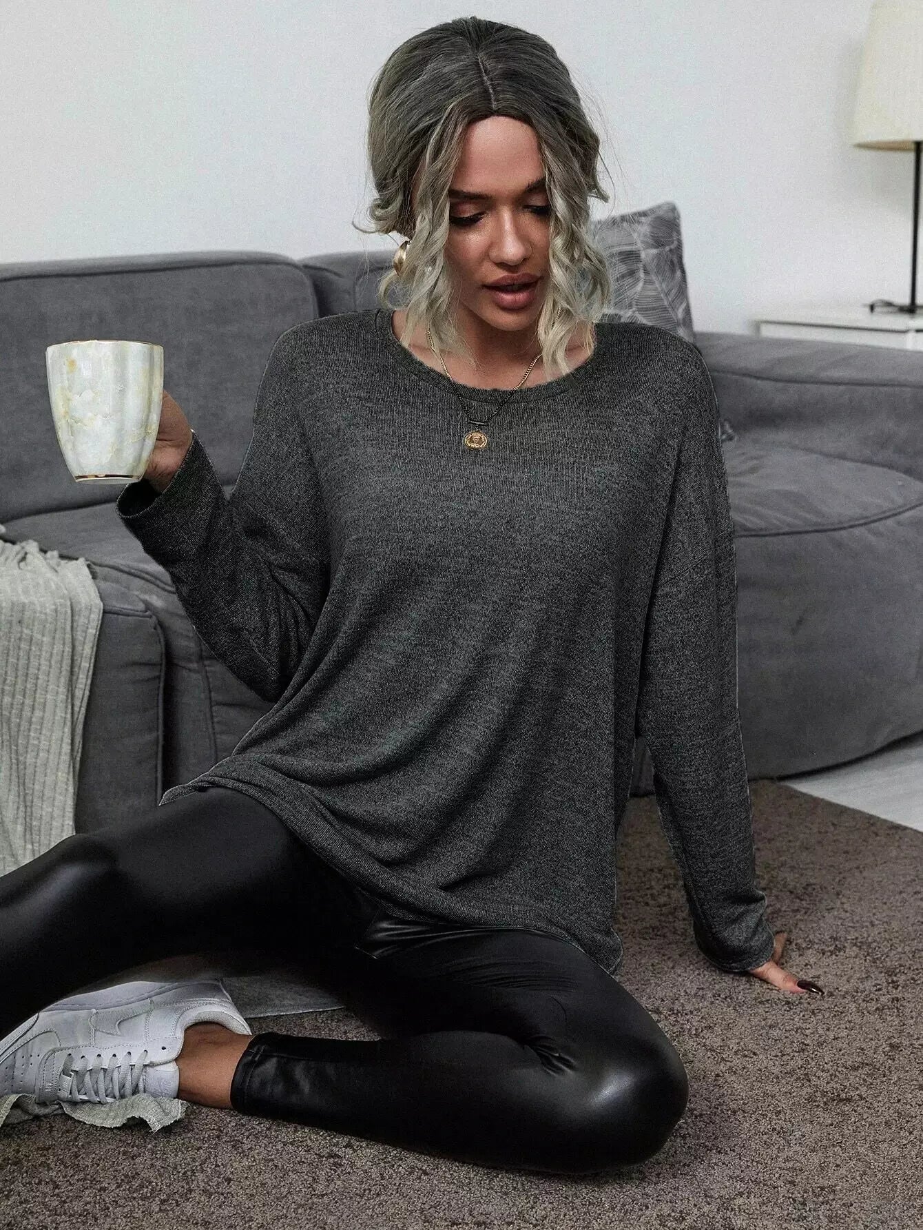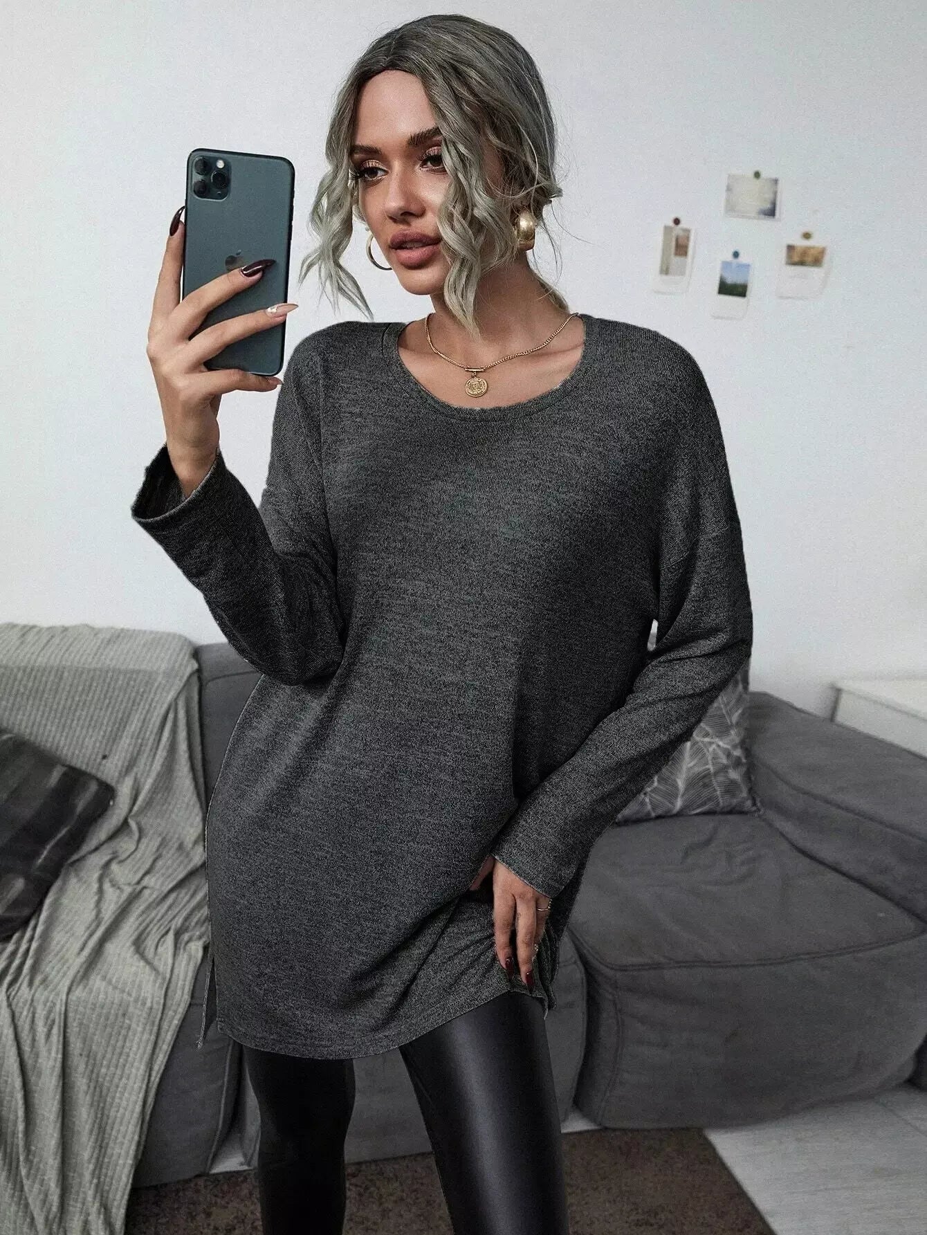 تي شيرت بفتحة جانبية طويلة منقسمة على الجانبين وبنطال ضيق من الجلد البولي يوريثان