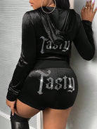 طقم من قطعتين من Slaydiva Casual Street Style Black Velvet Hot Diamond Short Top مع قلنسوة وشورت ضيق
