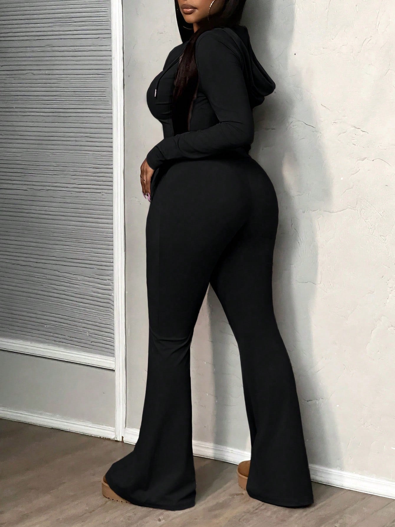 Slaydiva Women 2pcs Set Casual Basic Sport Zip Hoodie Jacket And High Waist Flared Pants Outfit