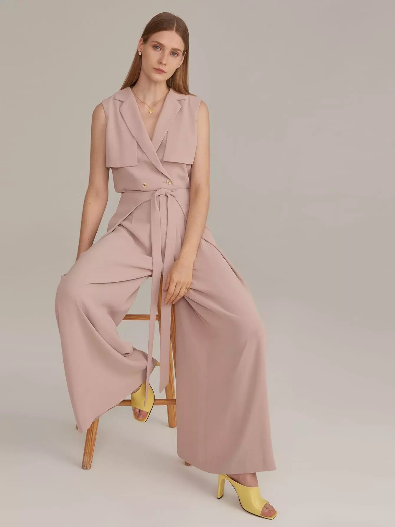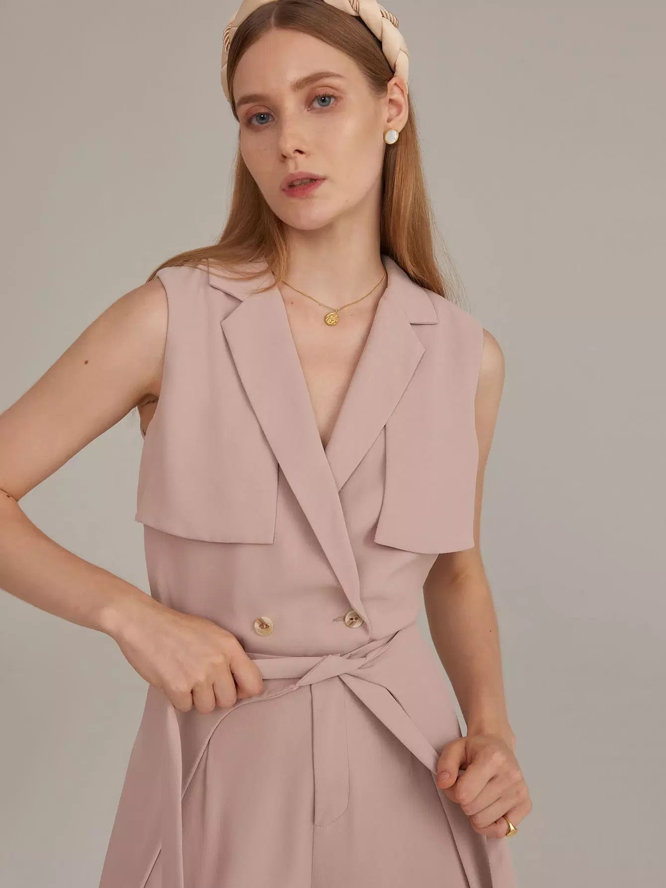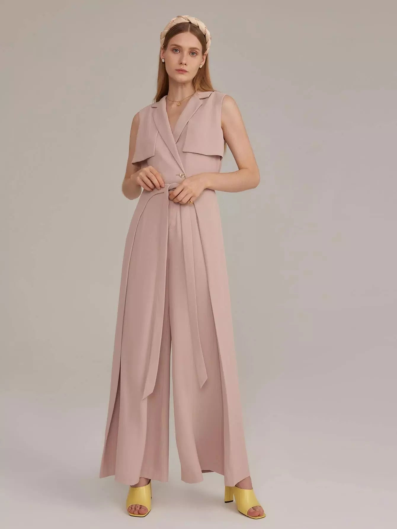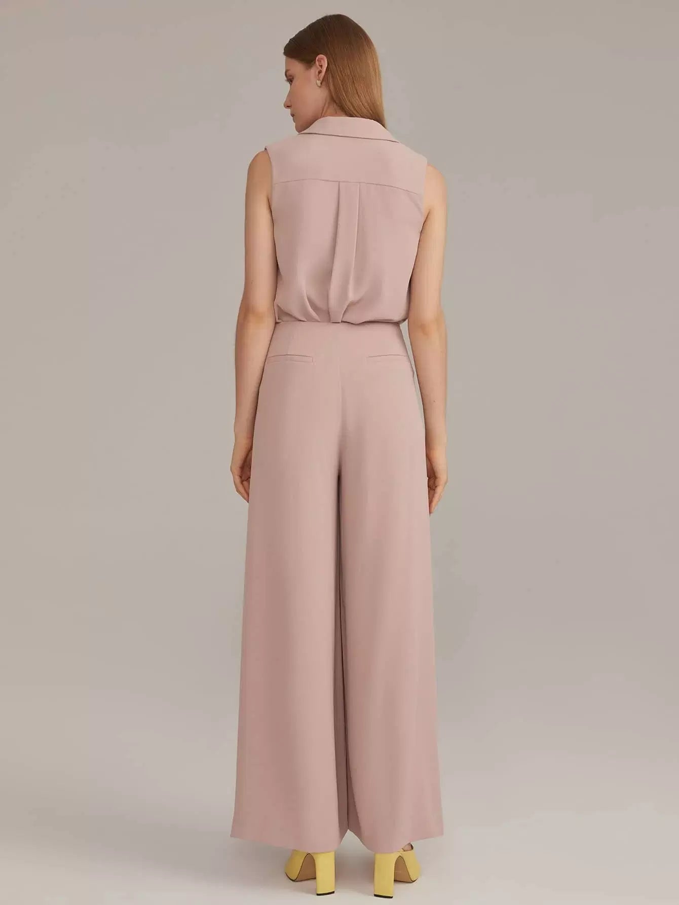 طقم بلوزة بلا أكمام وطقم بنطلون بدون أكمام وربطة عنق ملفوفة من الأمام