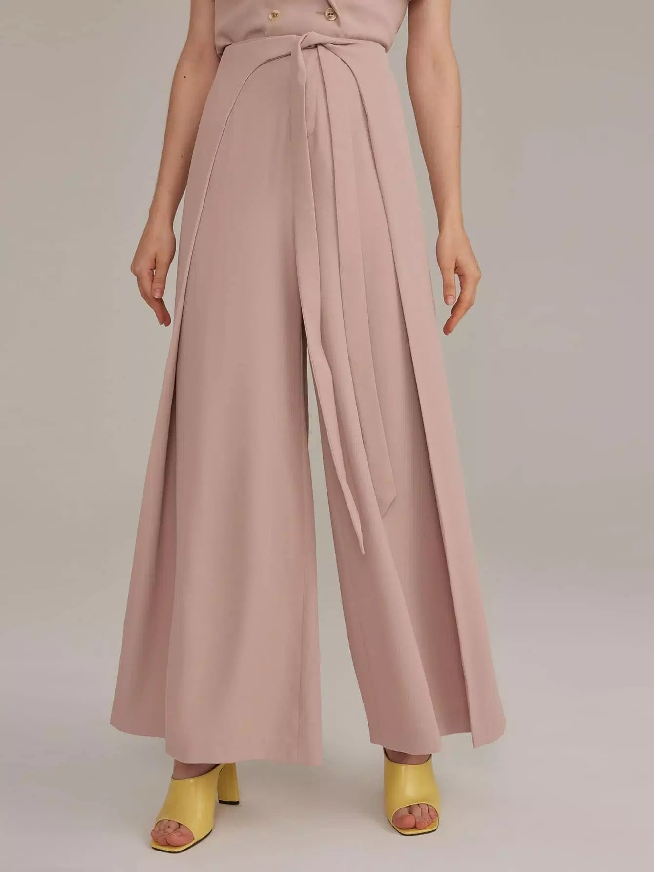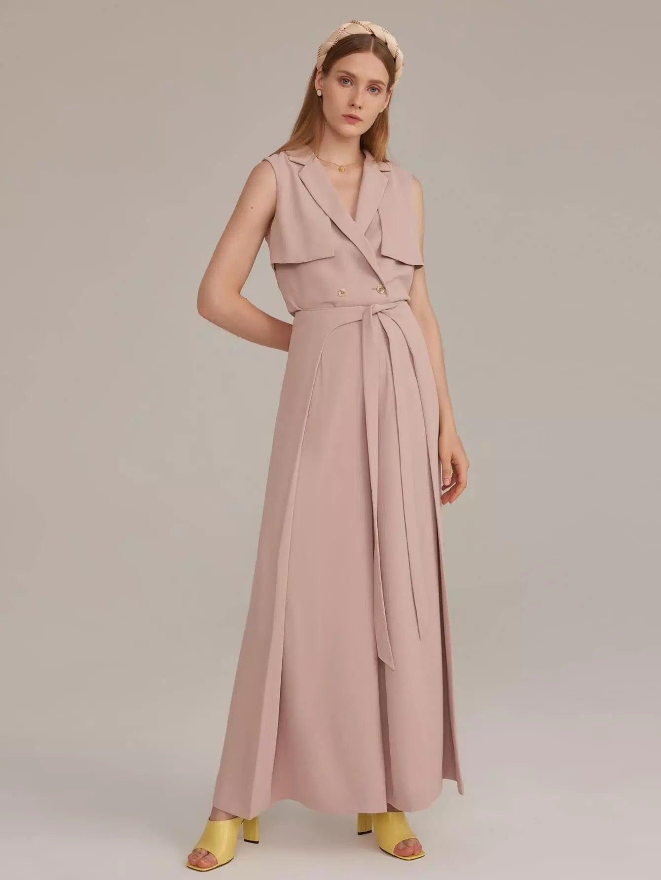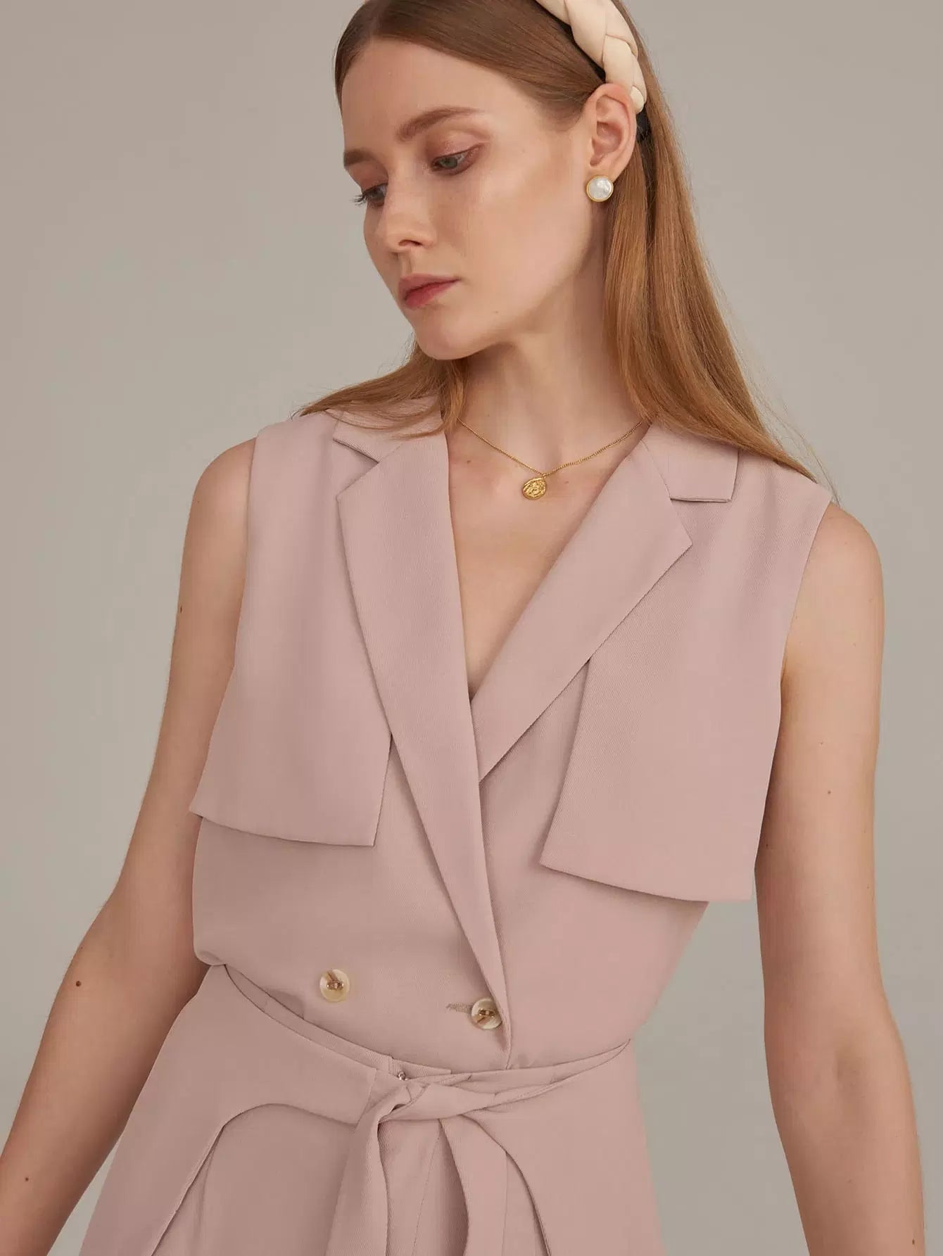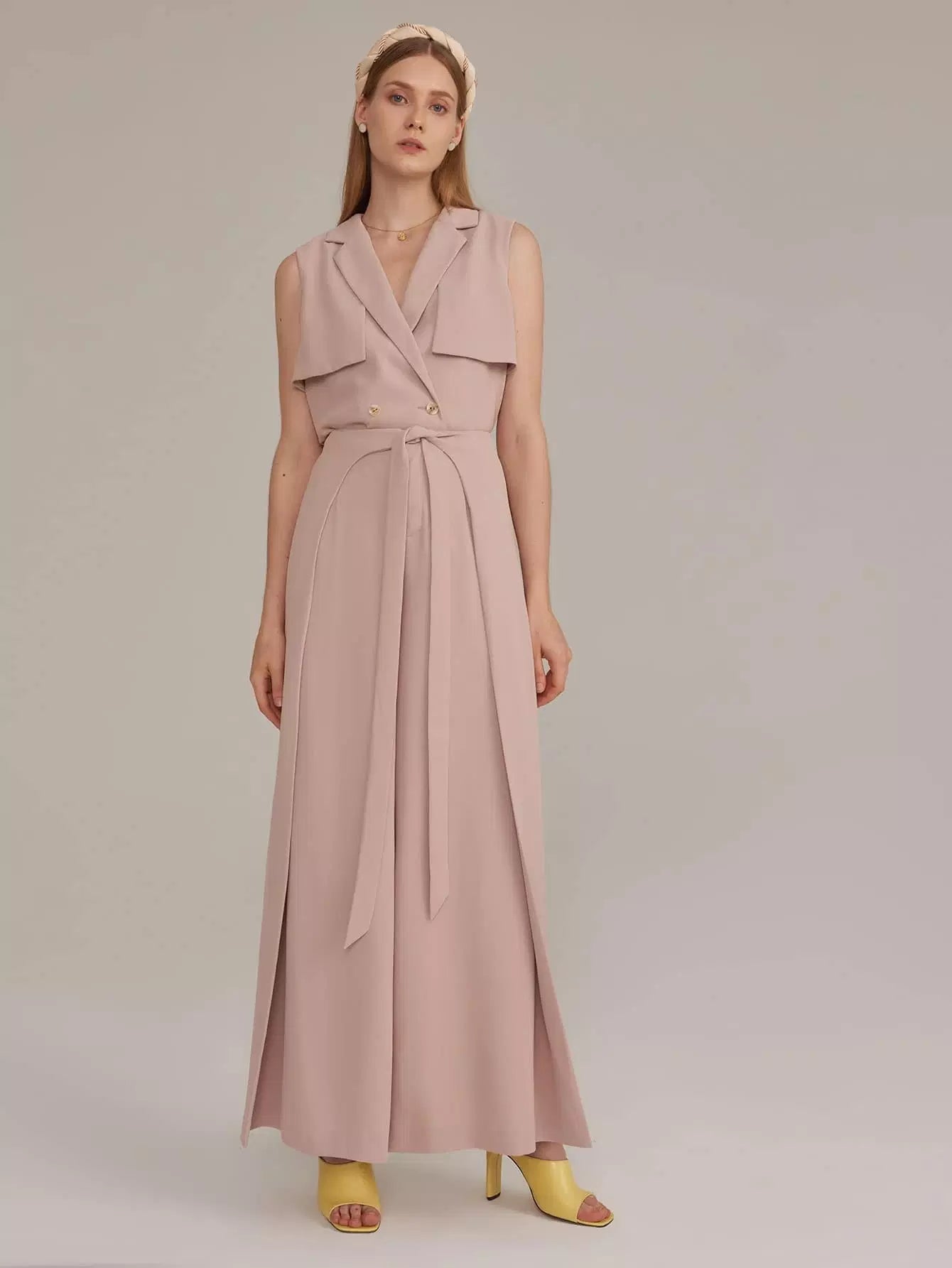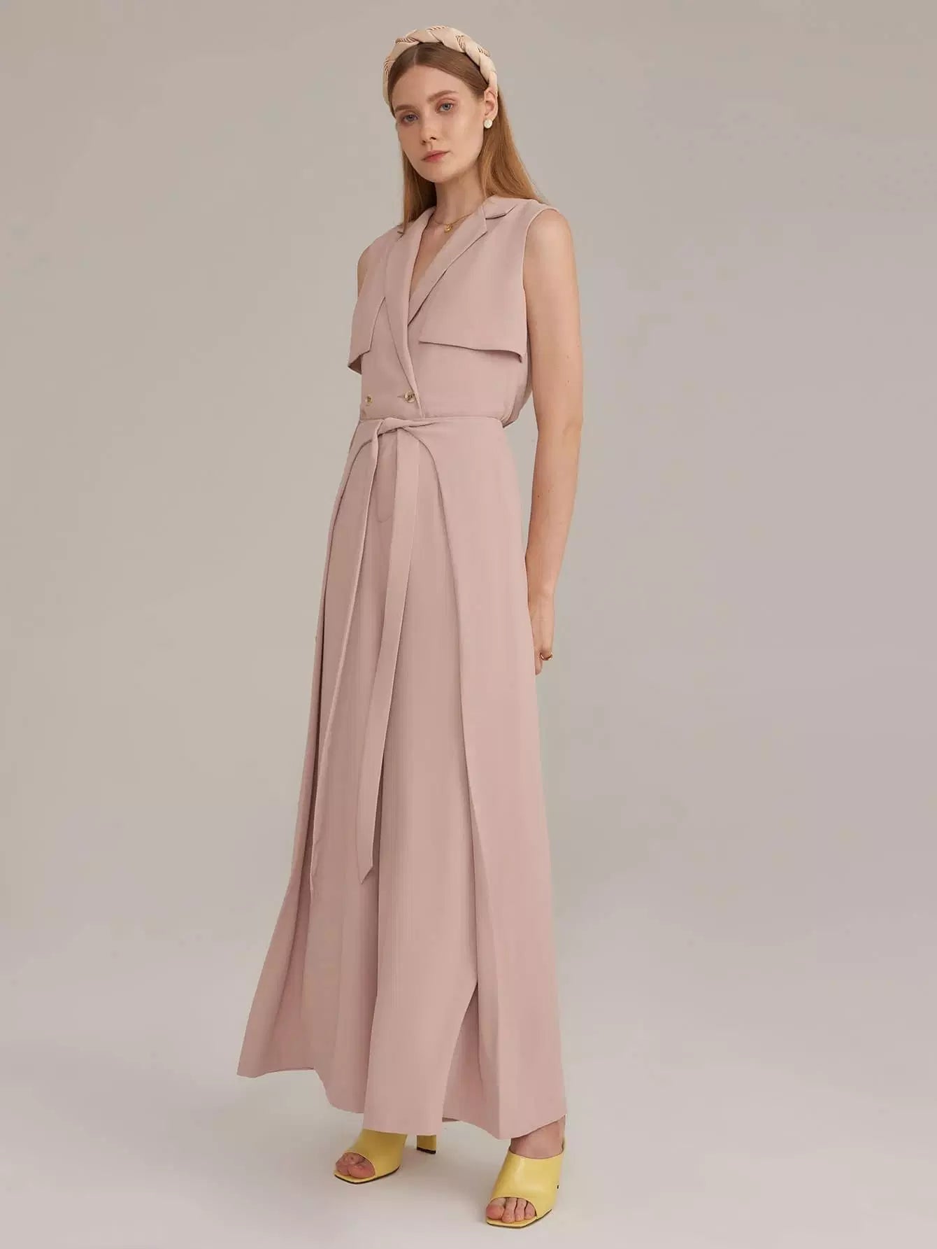 طقم بلوزة بلا أكمام وطقم بنطلون بدون أكمام وربطة عنق ملفوفة من الأمام