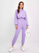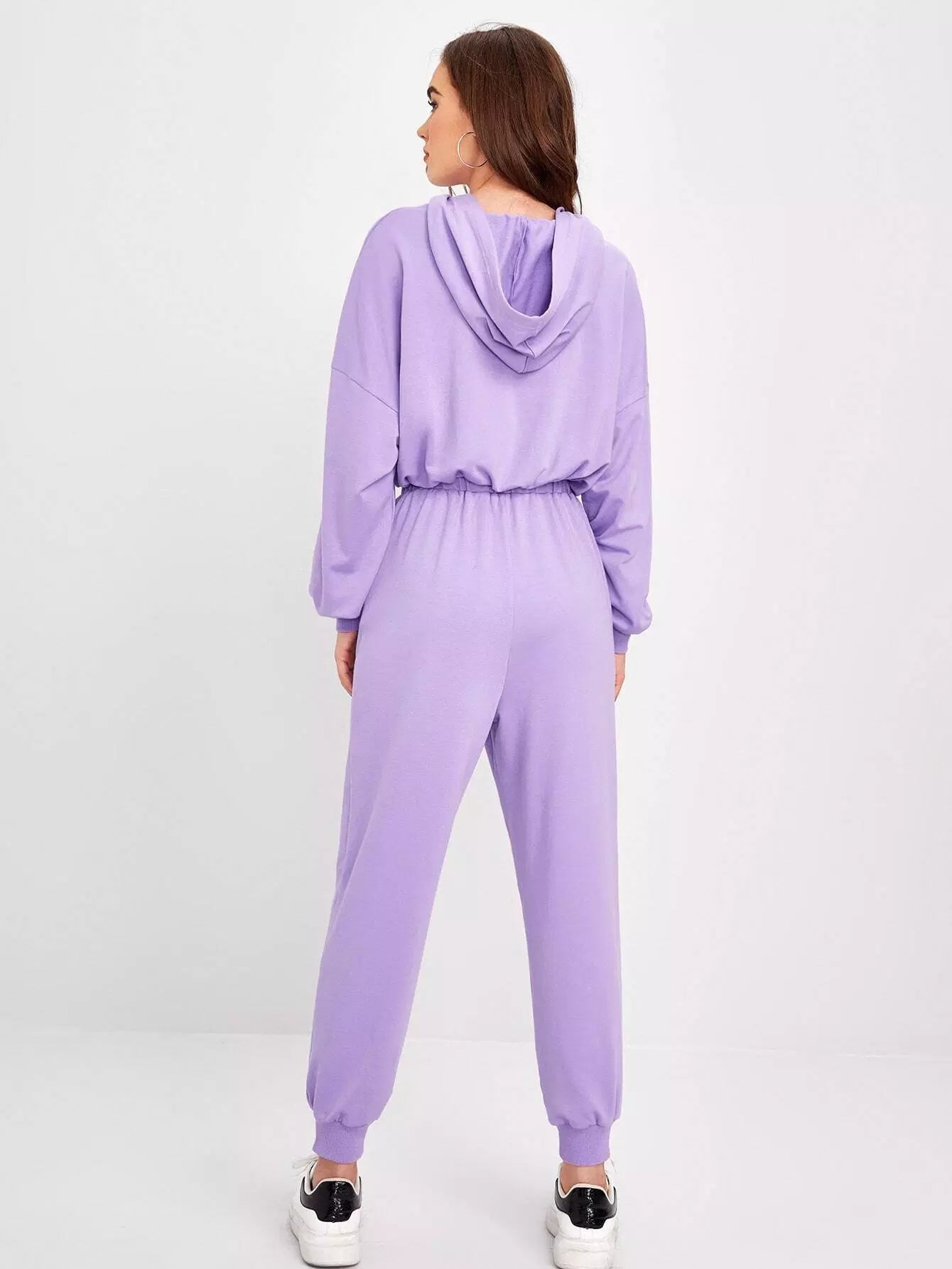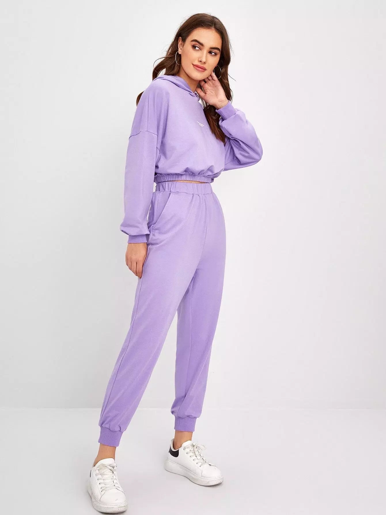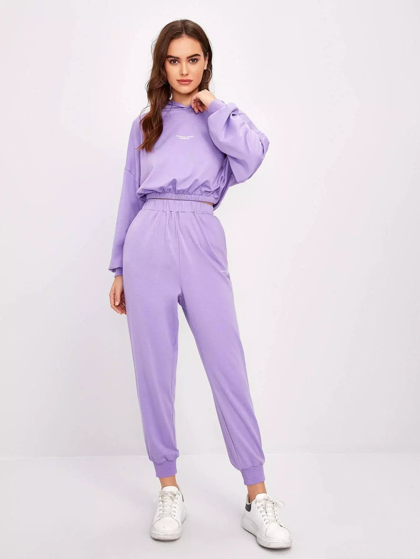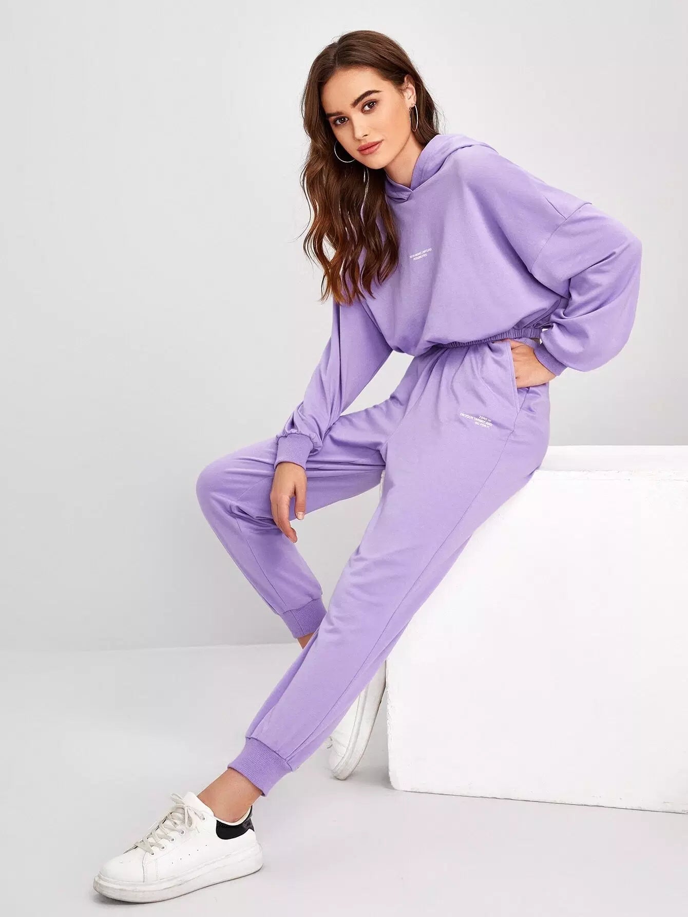 طقم هودي وبنطال رياضي بكتف منسدلة وشعار جرافيكي