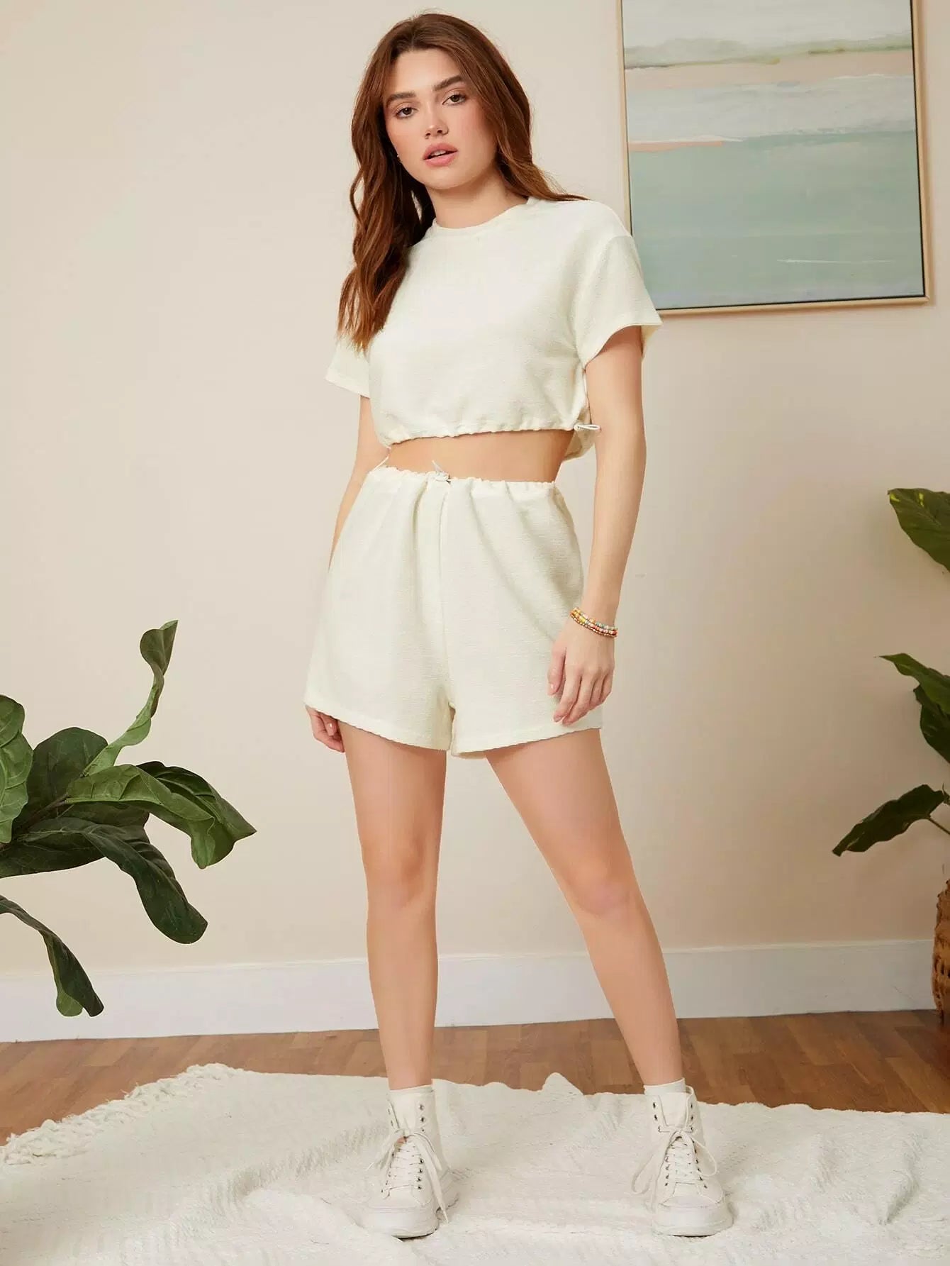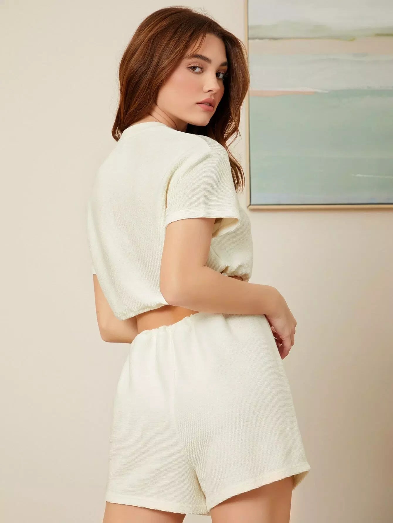 طقم بلوزة سادة برباط قصير وشورت قصير سادة