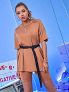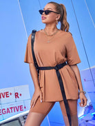 تي شيرت سادة بأكتاف منسدلة مع شورت راكب الدراجة النارية بدون حزام