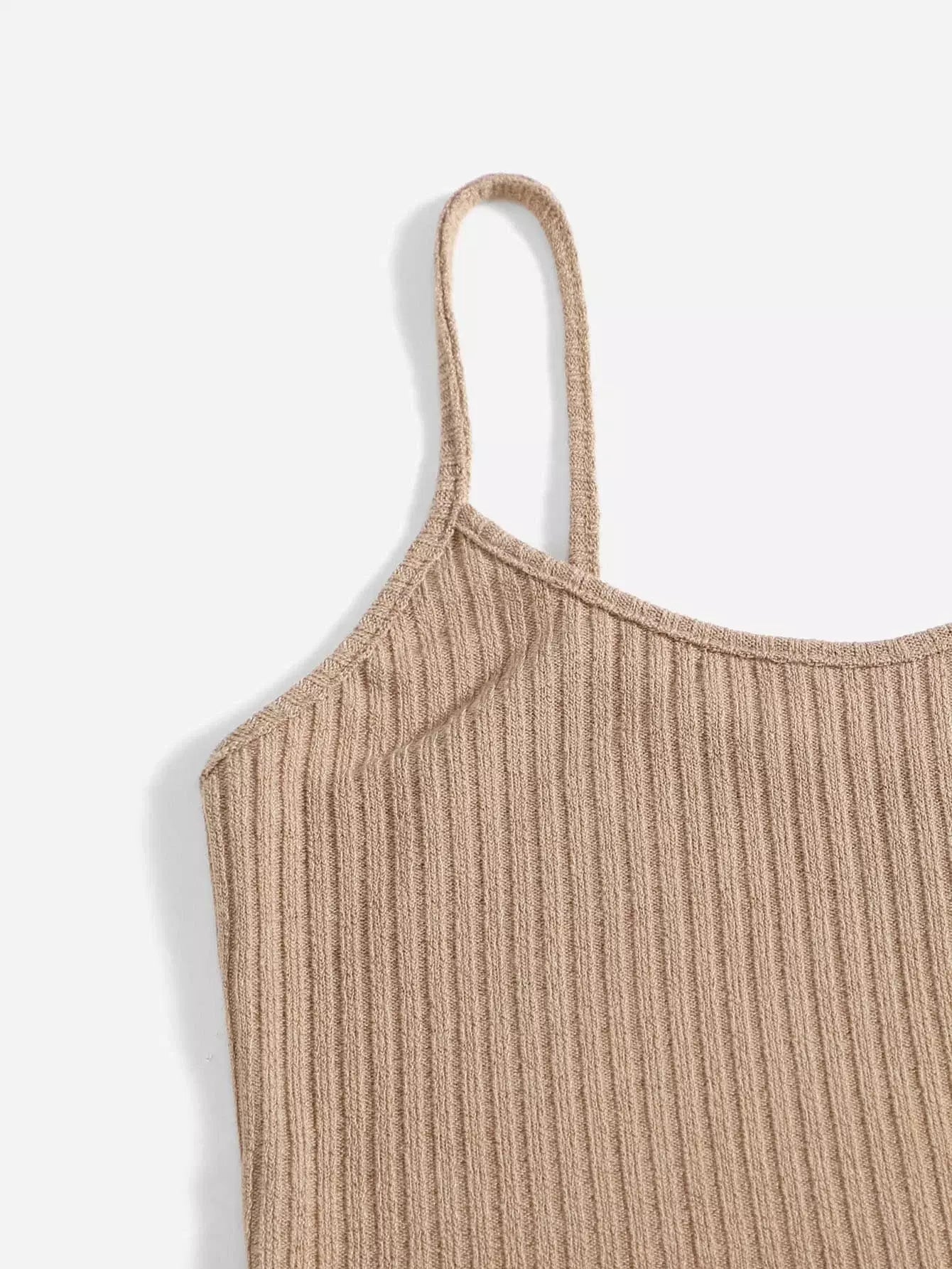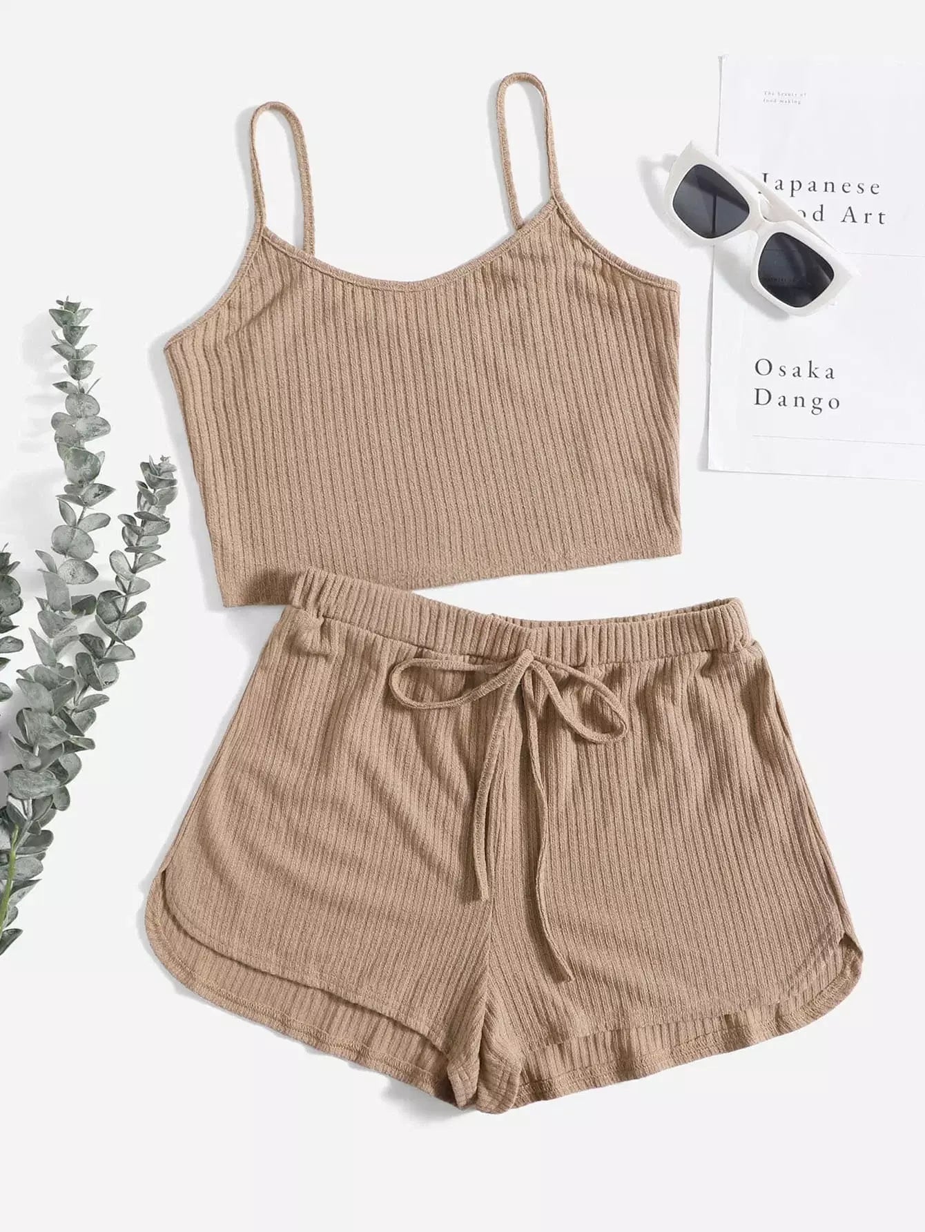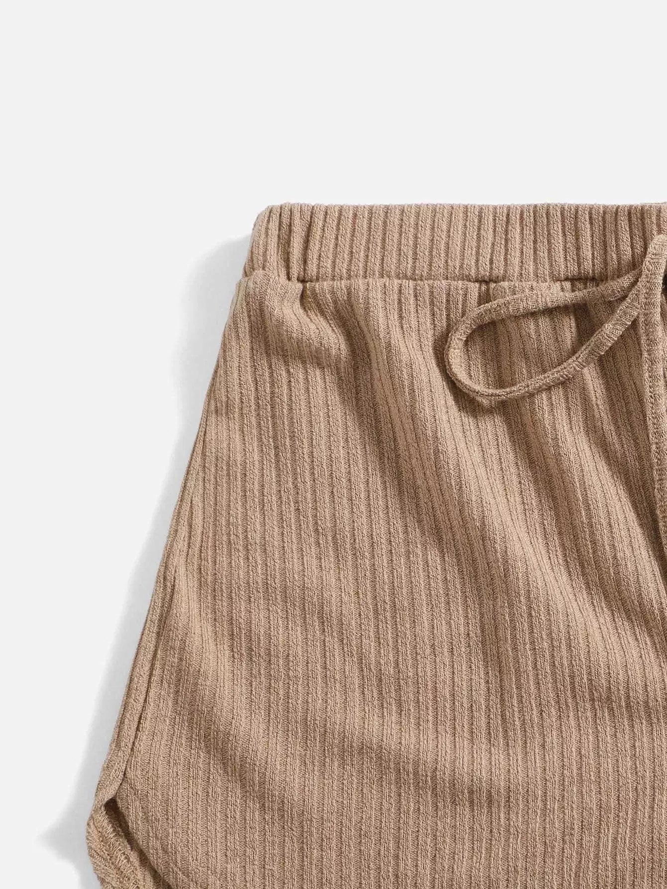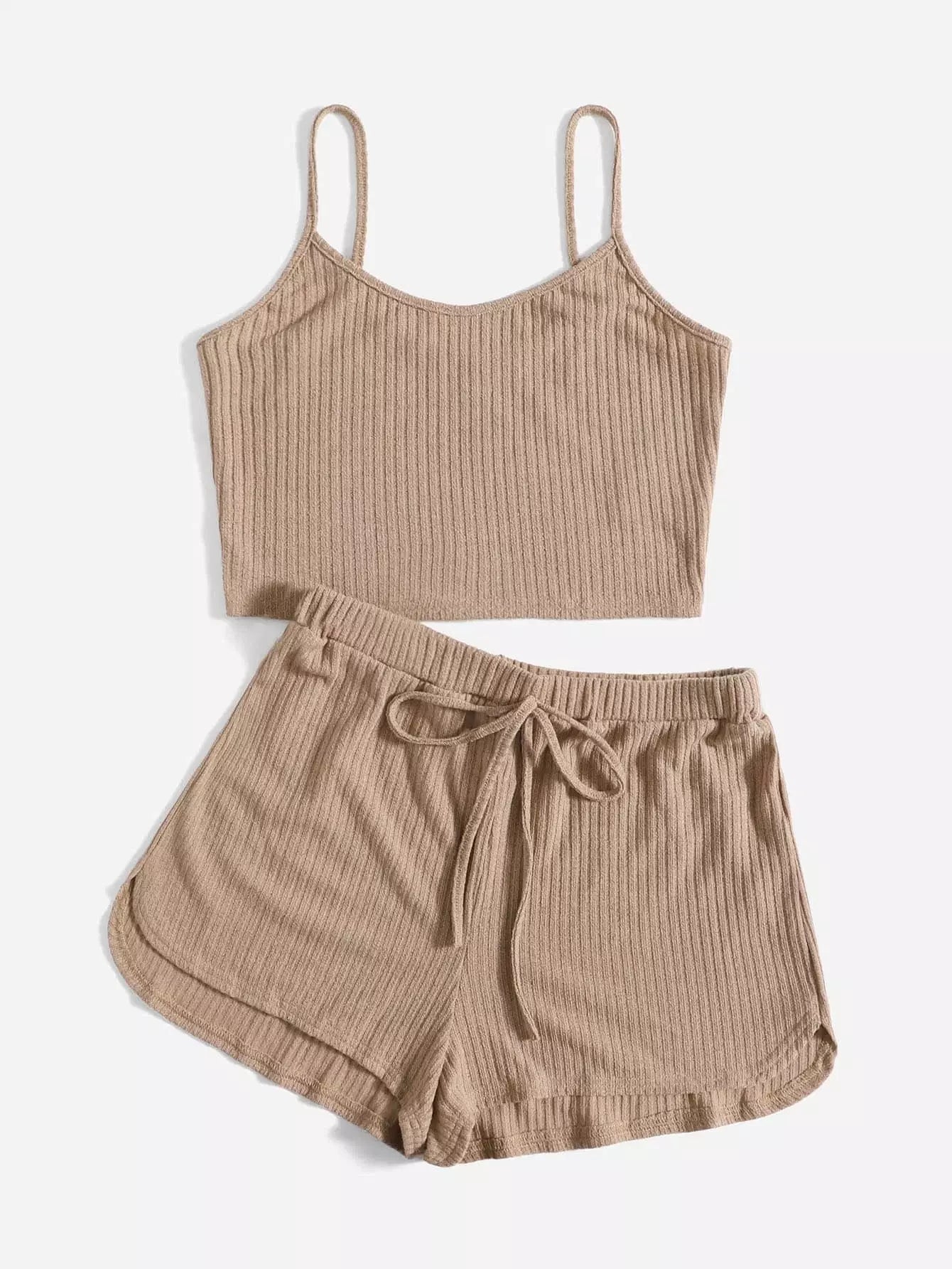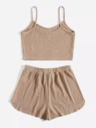 طقم بلوزة سادة محبوكة على شكل ضلع سادة وشورت معقود