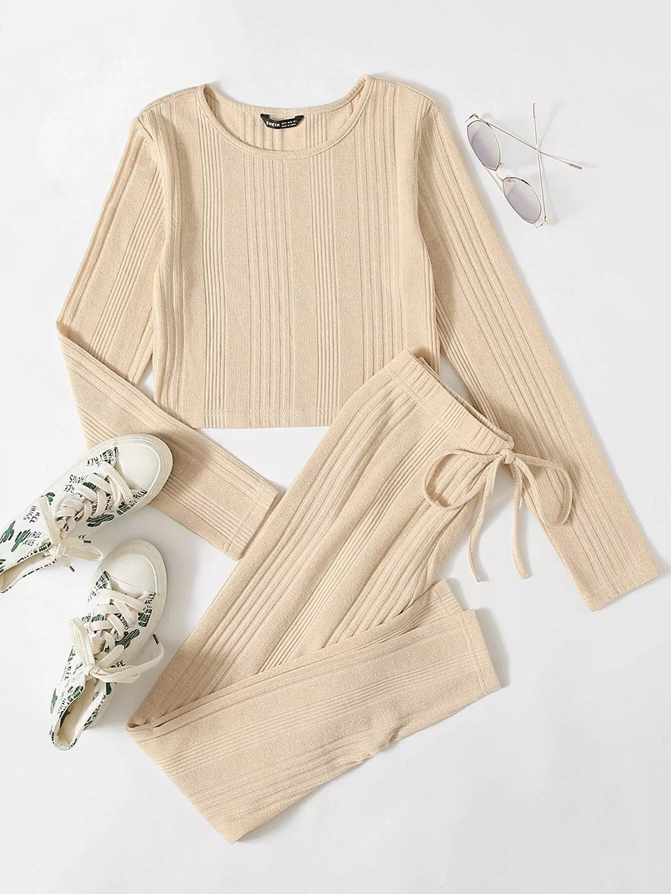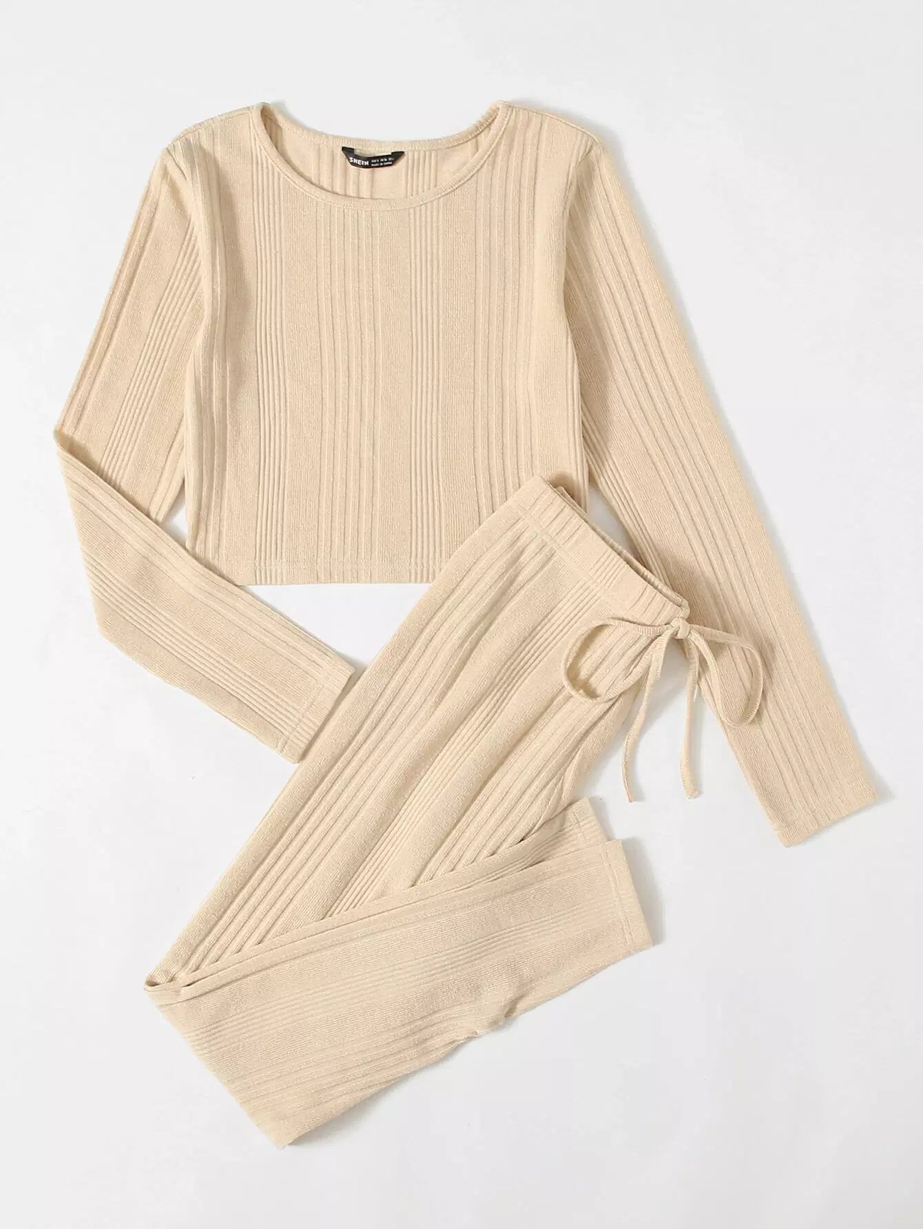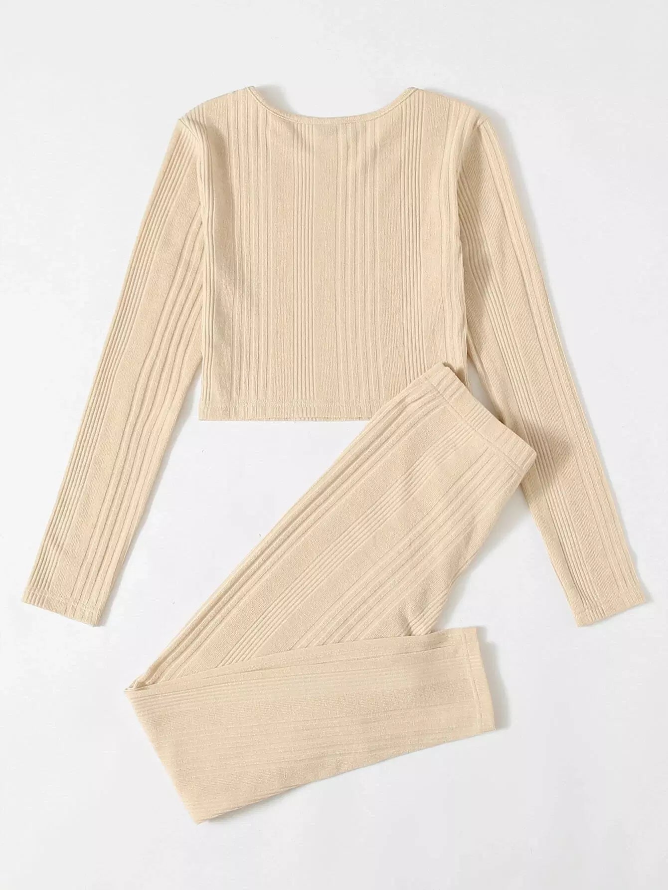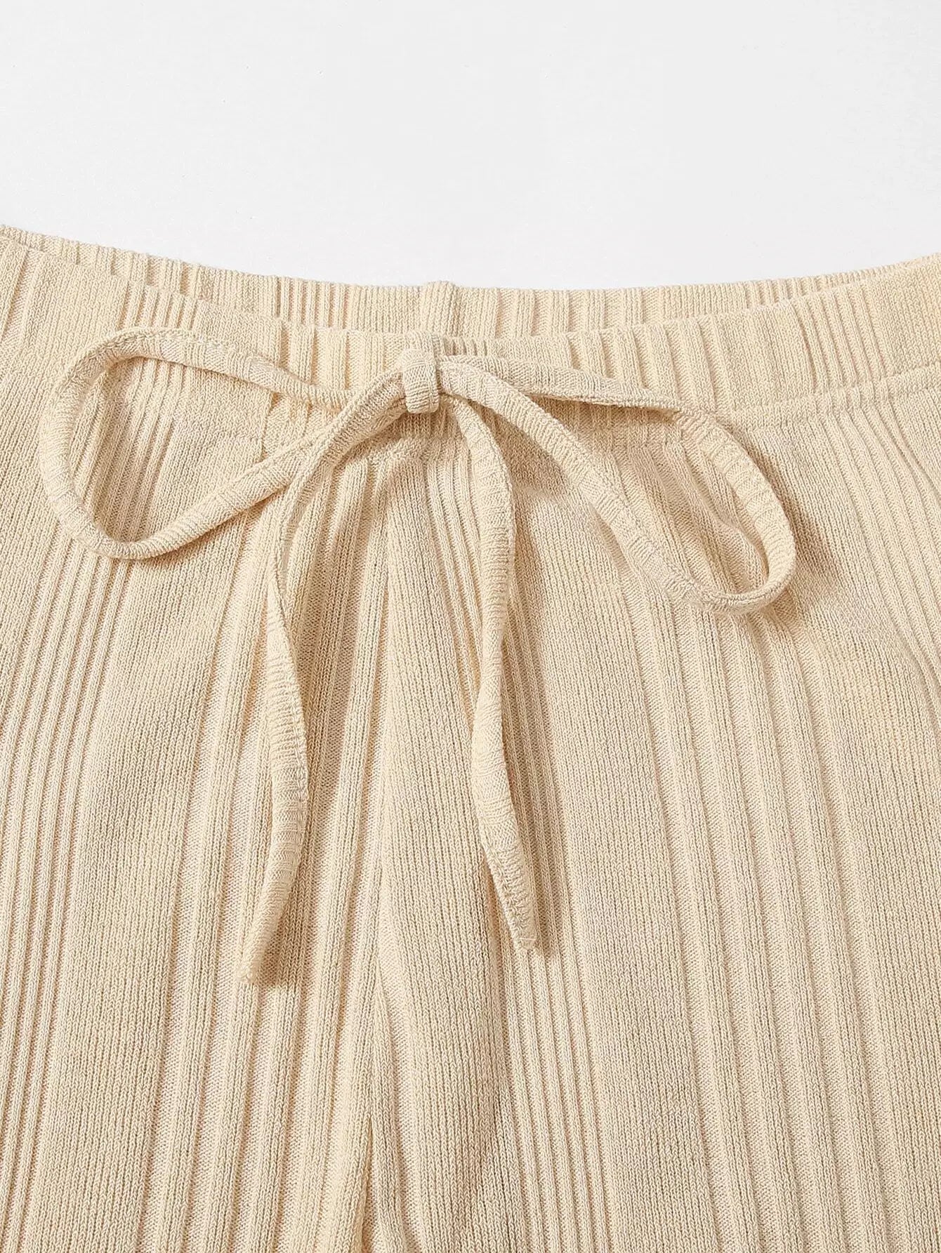 طقم تي شيرت محبوك من نسيج مضلع سادة وربطة خصر ضيقة