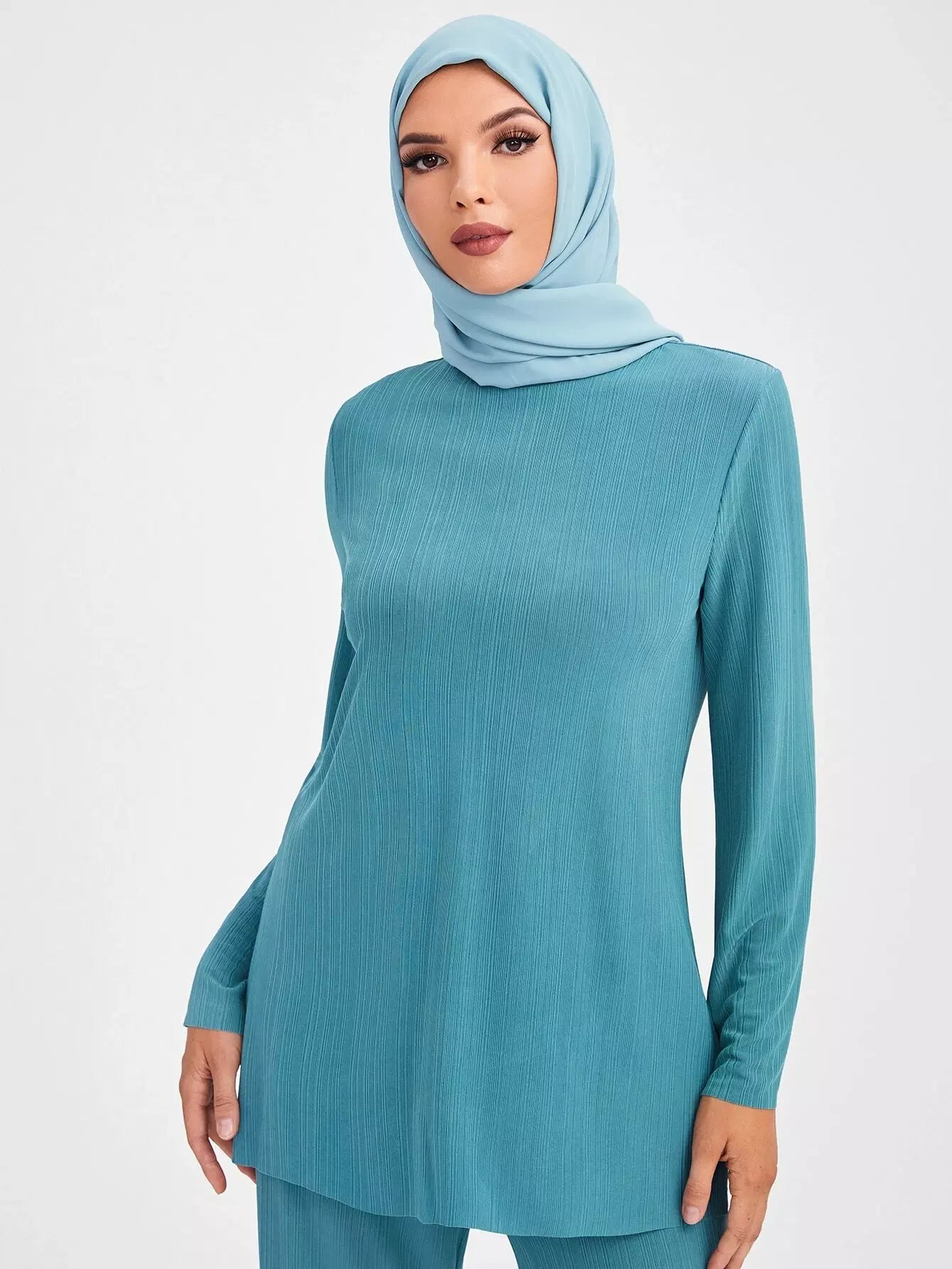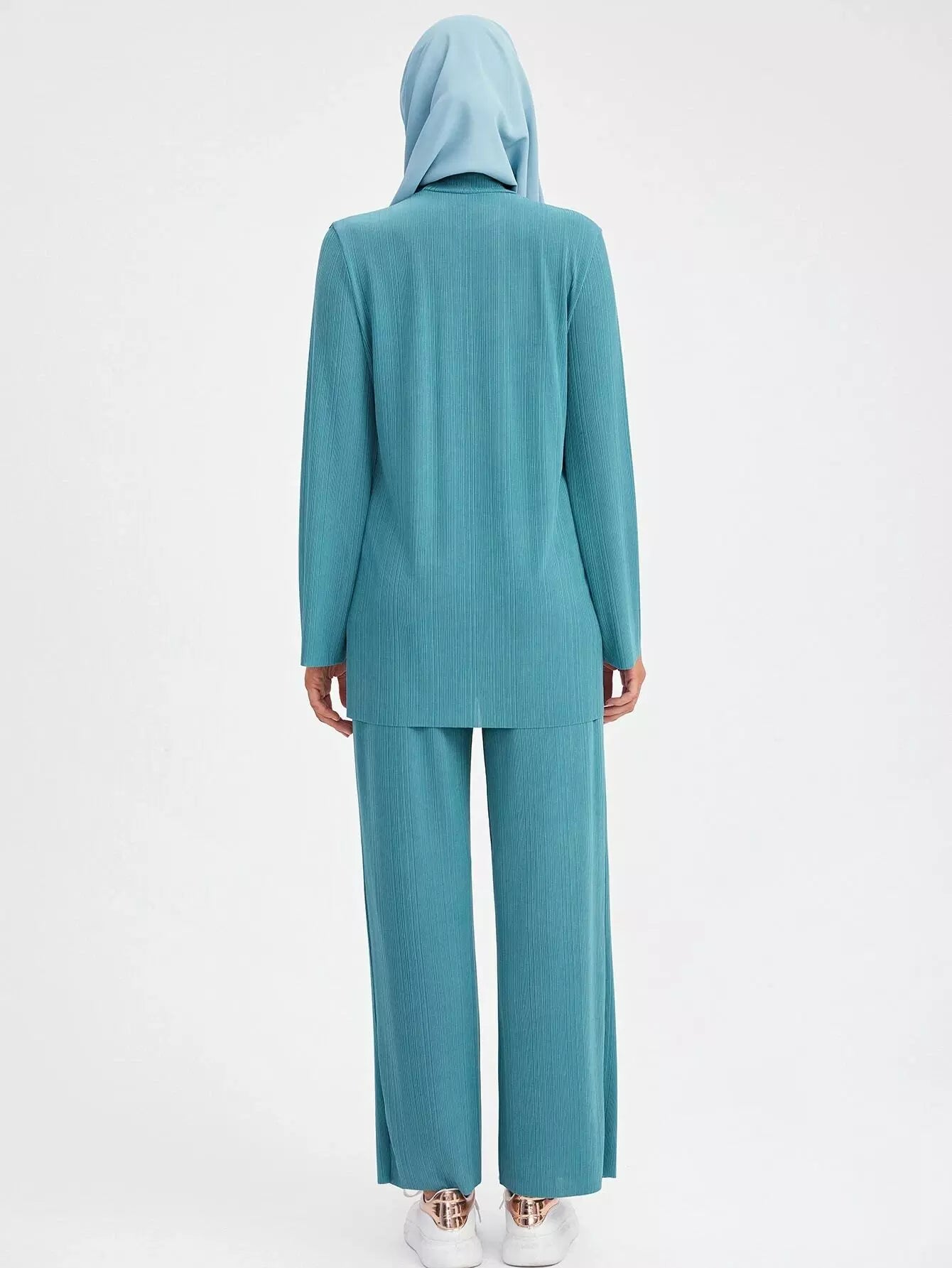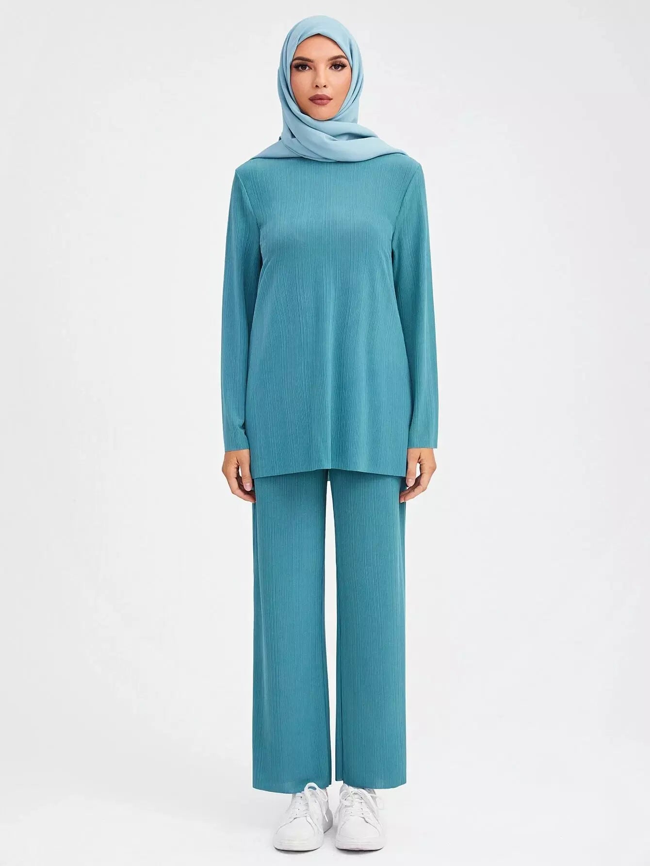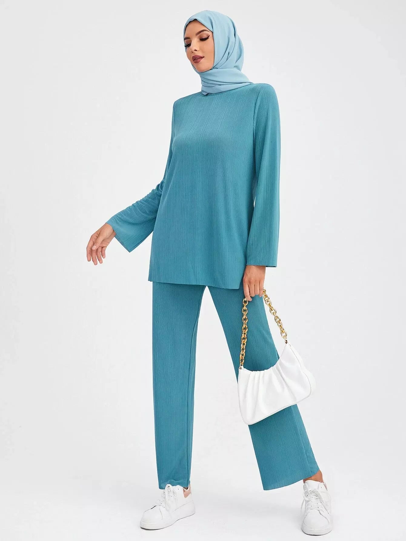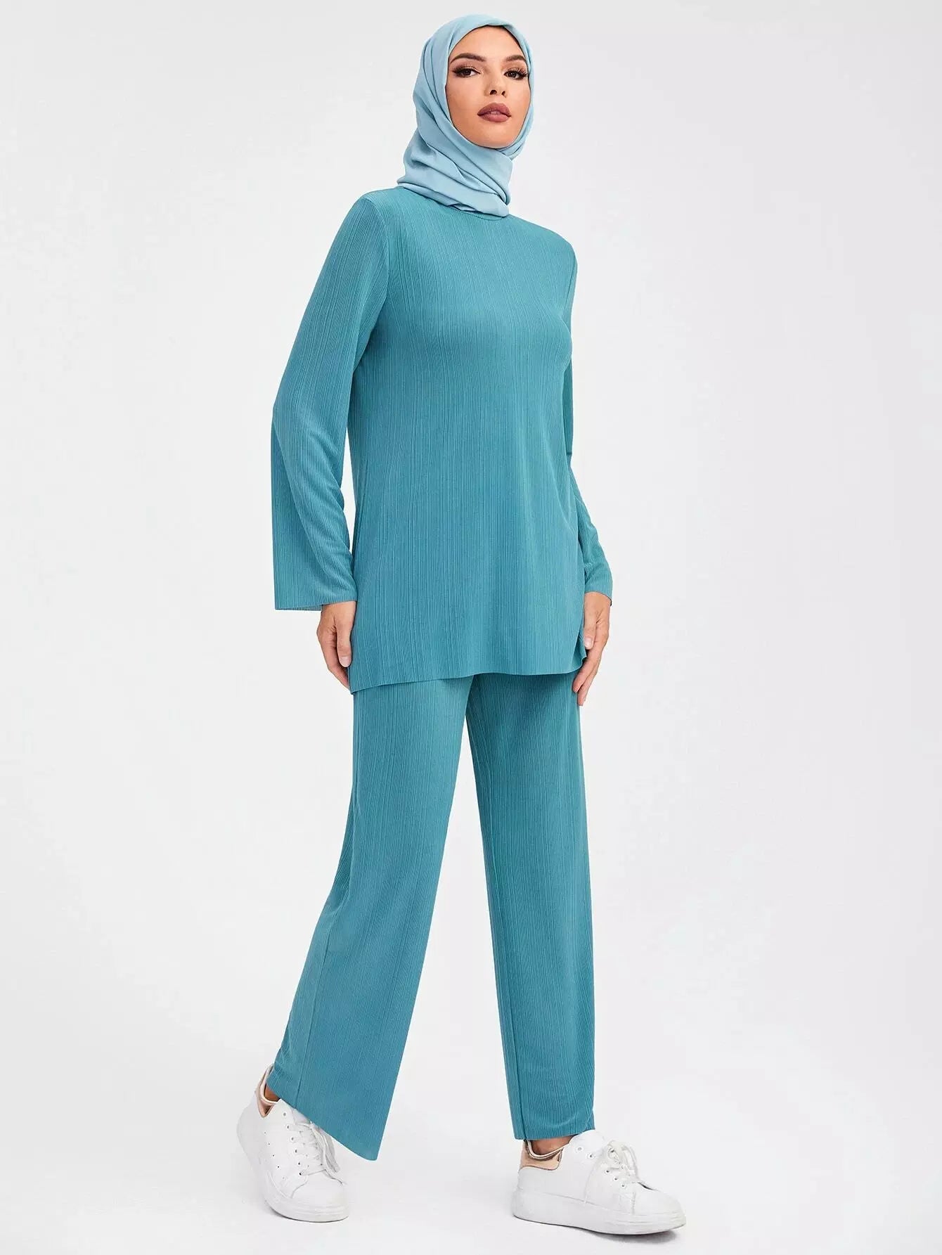 بلوزة محبوكة مضلعة صلبة وبنطلون واسع الساق